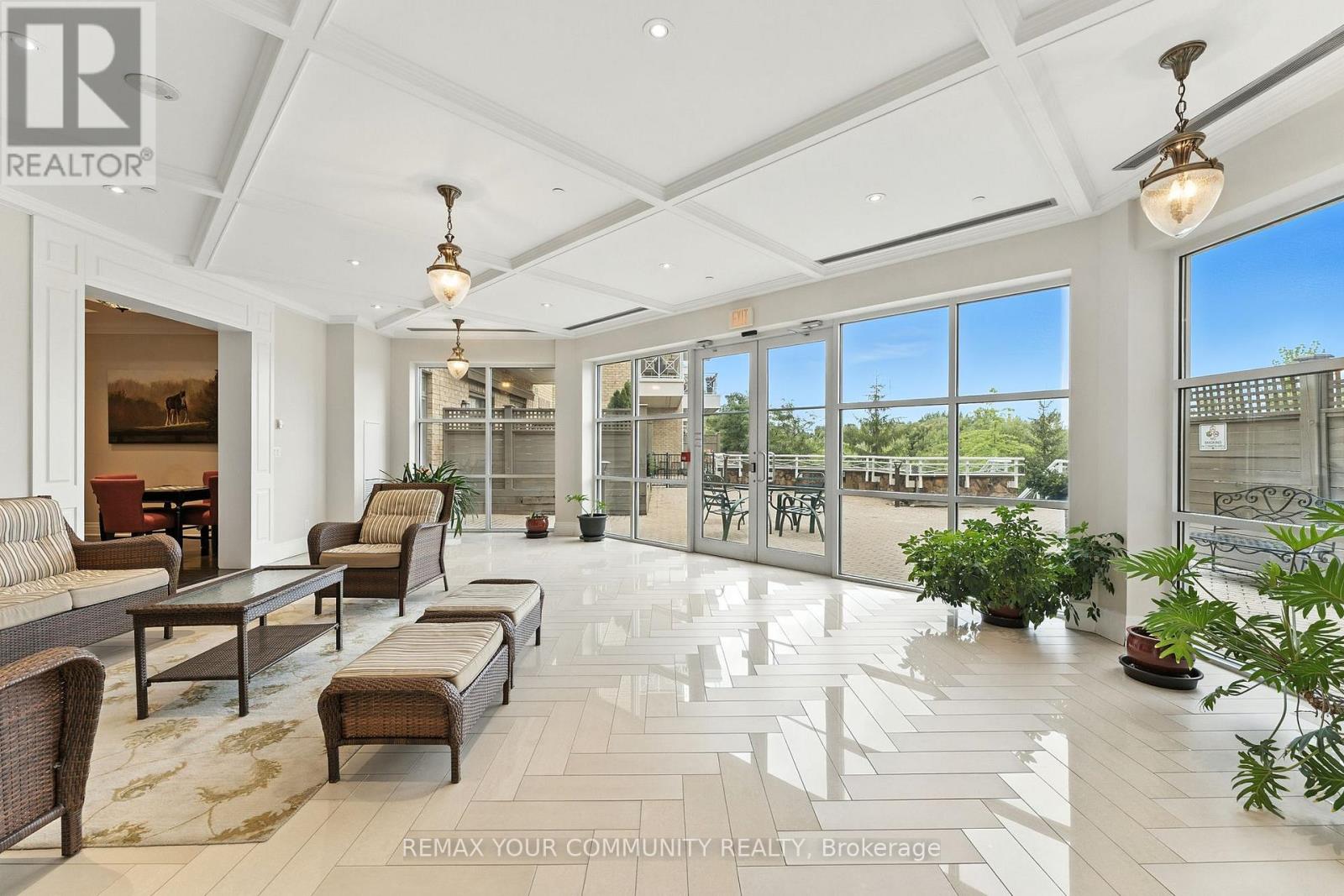 Sophisticated 1+1 Ground-Level Condo in a Prestigious Low-Rise Residence. Soaring 10-foot ceilings and oversized windows fill the suite with natural light, creating a refined and airy atmosphere. The open-concept layout highlights a sleek kitchen with quartz countertops, a breakfast bar, stainless steel appliances, and ample pantry space. The living area opens onto an extraordinary 400 sq. ft. private terrace, complete with gas line and water hookup-an entertainer's dream and a true extension of your living space. The versatile den is fitted with custom built-in storage, offering exceptional organization and functionality. The 4-piece bathroom is modern and tastefully finished. In-suite stacked laundry provides everyday convenience. This residence includes one underground parking space plus two lockers-one conveniently located beside the parking spot and another full-sized locker on P2. Enjoy first-class amenities: concierge, elegant party room, indoor pool, guest suite, communal BBQ terrace, and a fully equipped fitness centre. Perfectly situated minutes to the GO station, scenic trails, dog parks, and top dining destinations. (id:64974)
