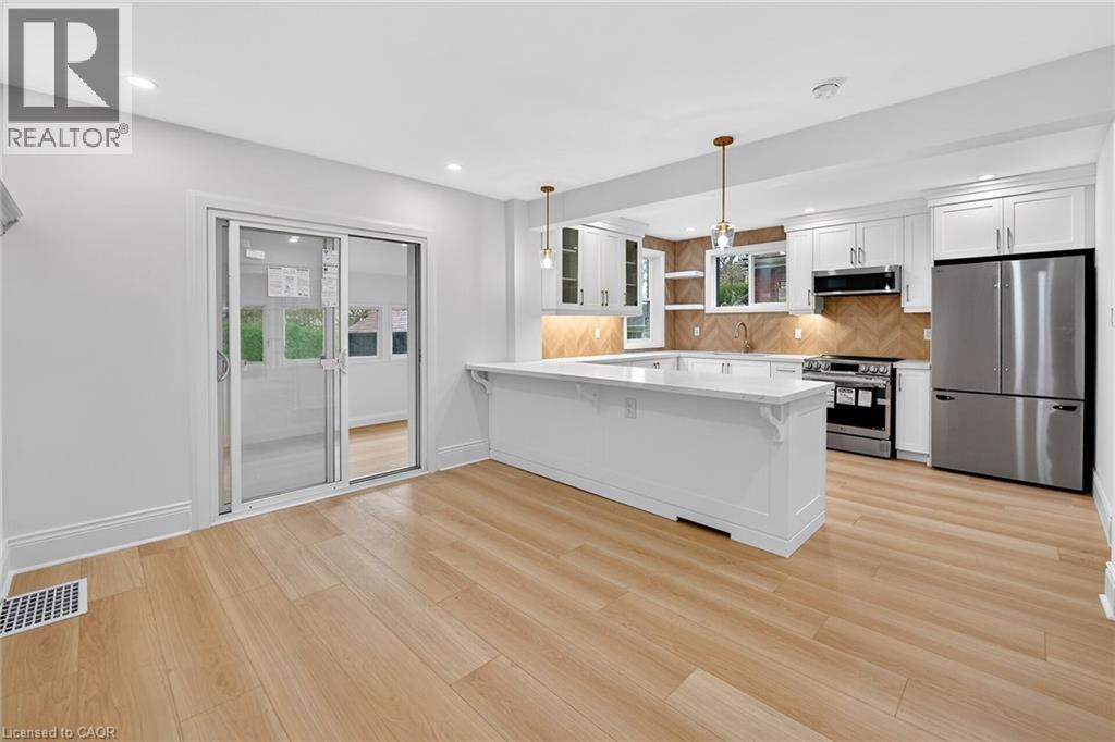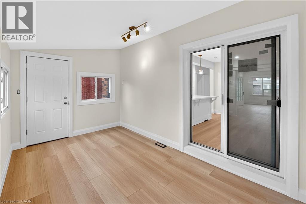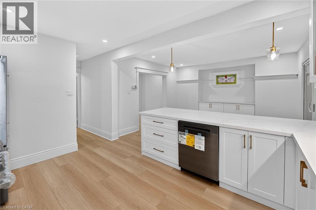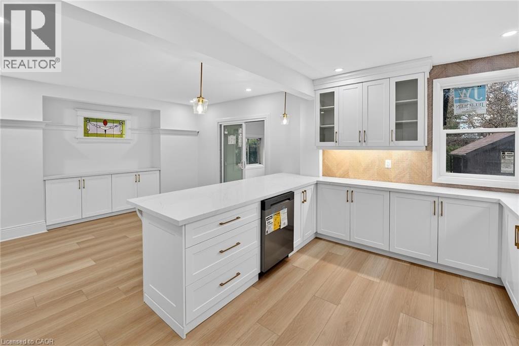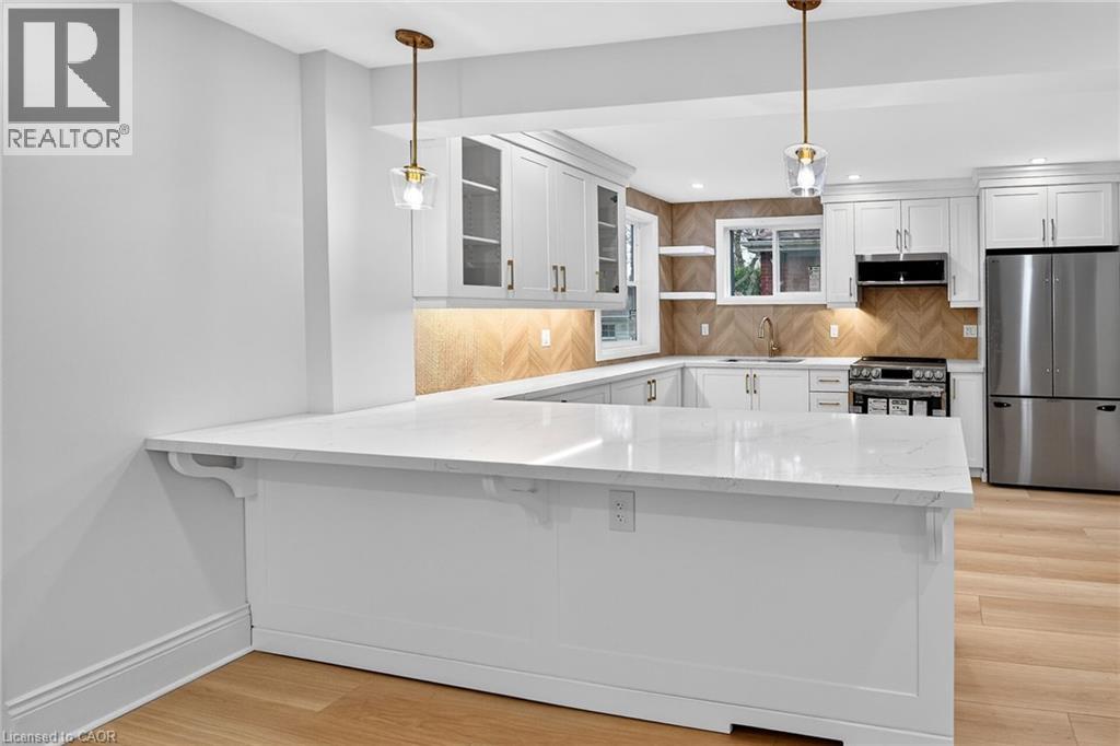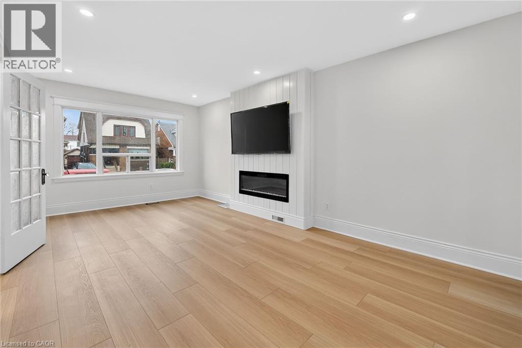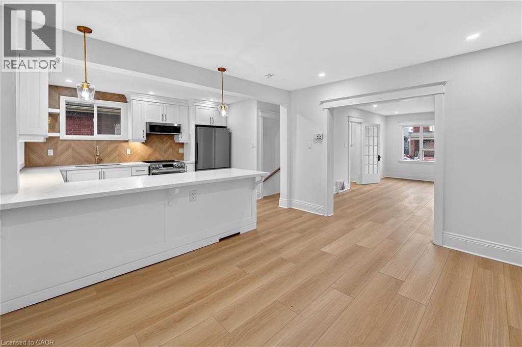 Welcome to 101 Houghton Avenue South! Located in a sought-after, family-friendly neighbourhood, this beautifully maintained home is just steps from A.M. Cunningham Elementary School and a short stroll to Gage Park and the shops, restaurants, and boutiques along Ottawa Street North. Convenient access to transit, the mountain, and the QEW. Extensively renovated with quality craftsmanship, this move-in ready home offers nearly 2,000 sq ft of finished living space. The main level features a new front porch, enclosed entry with leaded glass windows, spacious foyer, and a bright open living room with wide-plank flooring, pot lighting, large picture window, and shiplap feature wall with linear fireplace. The dining room includes built-in cabinetry, stained glass window, and patio doors to a fully finished four-season sunroom. The stunning open-concept kitchen features modern cabinetry, quartz counters, ceramic backsplash, peninsula with seating, and stainless steel appliances. Upstairs offers two spacious bedrooms and a 4-piece bath with convenient laundry. The finished lower level includes a rec room, bedroom, and 3-piece bath—ideal for guests or extended family. Private side drive leads to a detached garage with hydro and auto opener. The rear yard is private and surrounded by mature greenery. Updates include: flooring, trim, pot lights, fresh paint, electrical, plumbing, vinyl siding (house & garage), appliances, furnace, central air, 100-amp breakers, and professionally waterproofed basement with sump. Stylish, updated, and perfectly located—move in and enjoy. (id:64974)