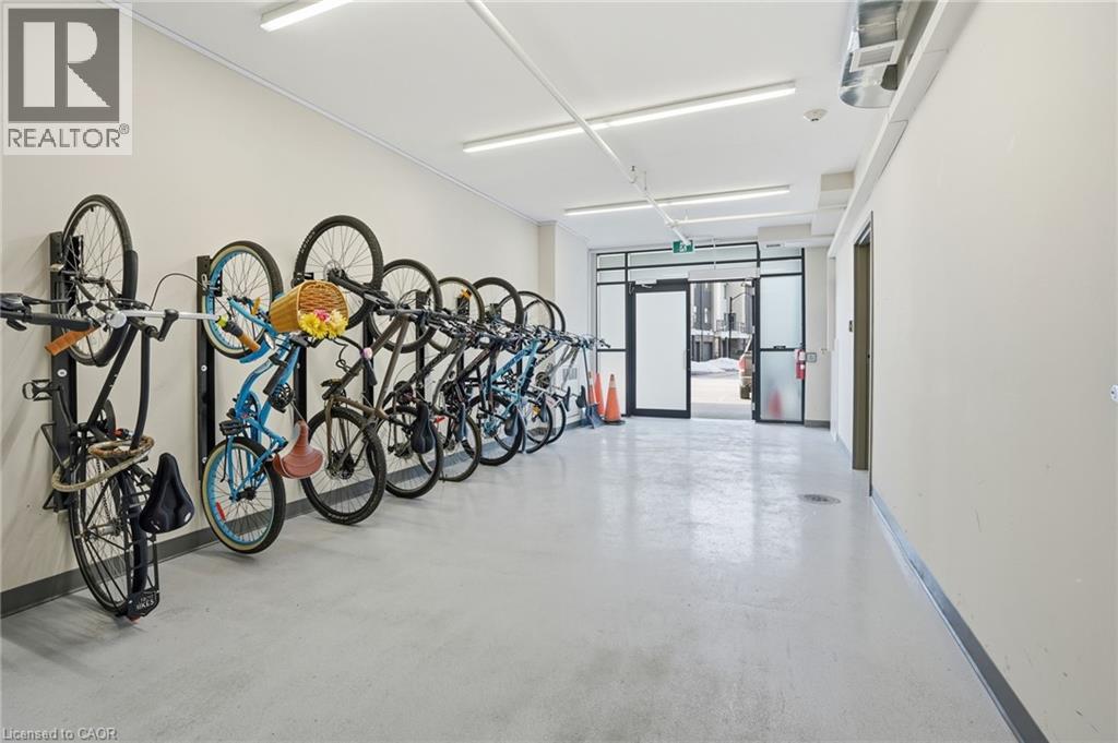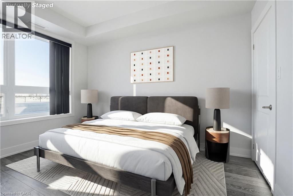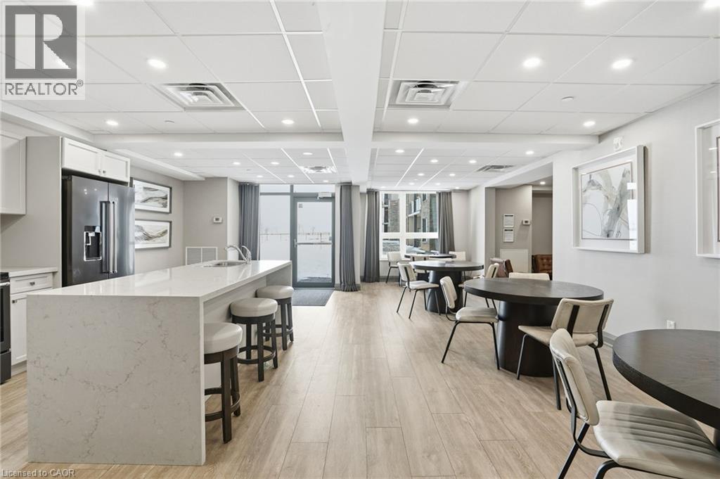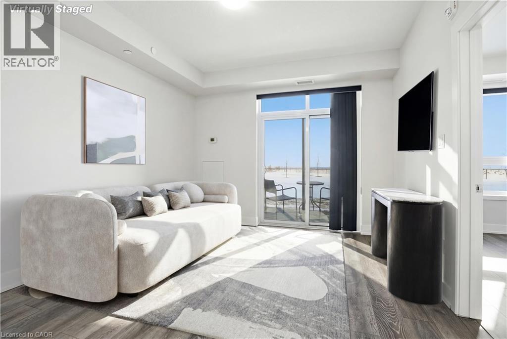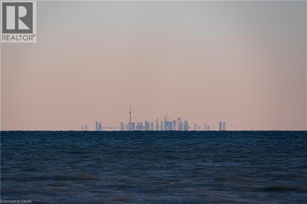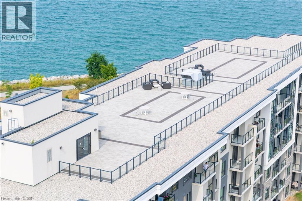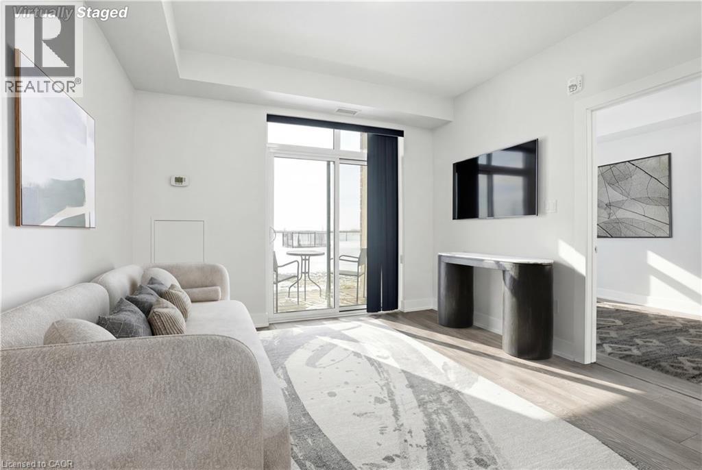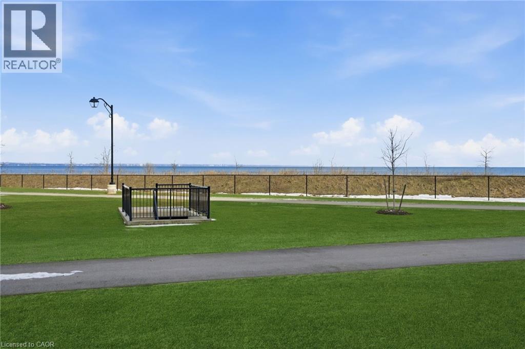 LAKE VIEW! WALKOUT! PET LOVERS! UP TO $10K IN CUSTOM BUYER INCENTIVES! Welcome to this beautifully proportioned, bright 1-bedroom condo, perfectly positioned just steps from Lake Ontario and a secluded beach, with sweeping views toward Burlington and the Toronto skyline. Offering the convenience of a main-floor walkout and a private front-door hallway entry, this home blends condo living with the feel of a ground-level retreat. Freshly painted in a neutral palette, the unit features 9-foot ceilings and a bright, open-concept layout designed to maximize both space and natural light. Warm-toned upgraded laminate flooring flows seamlessly from the living area through the hallway and into the bedroom, with upgraded trim creating a cohesive and inviting atmosphere. Step outside to your private, serene patio and rear lawn area overlooking the lake — an ideal setting for morning coffee, evening cocktails, or outdoor dining with easy access for pet owners. The kitchen showcases quartz countertops, Frigidaire stainless steel appliances, a sleek smooth-top stove, Blanco double under-mount sink, pull-down faucet, and stylish backsplash. A breakfast bar provides space for casual dining or entertaining, while custom blinds throughout add comfort and privacy. The bedroom offers flexibility for furniture placement, complemented by a large window and generous closet. Just across the hallway, the well-appointed 4-piece bathroom features updated porcelain tile, a custom glass shower wall, and a conveniently located, separated in-suite laundry area. Enjoy excellent building amenities, including a party room, exercise room, rooftop terrace, bike storage, and secure underground parking, along with direct access to scenic waterfront trails and a peaceful public beach. Situated with quick access to major commuter routes, Confederation GO, and everyday conveniences. Whether you’re a first-time buyer, downsizer, or investor, this turnkey lakefront condo delivers exceptional value. (id:64974)