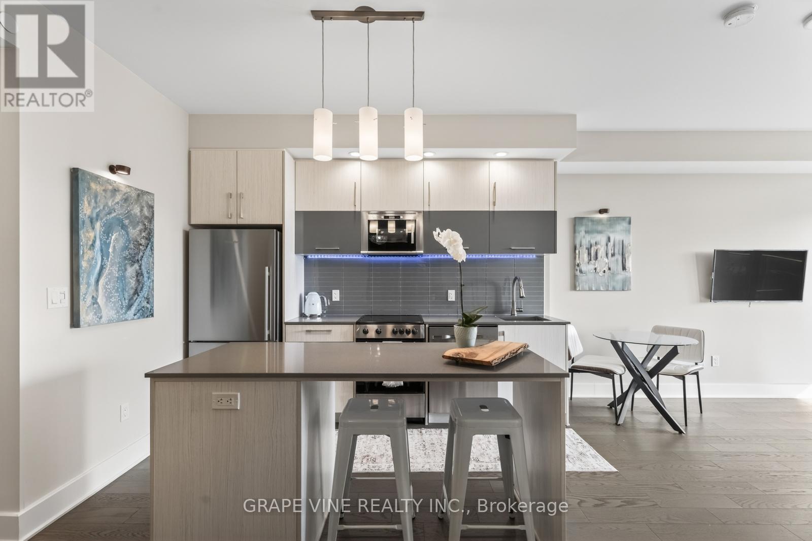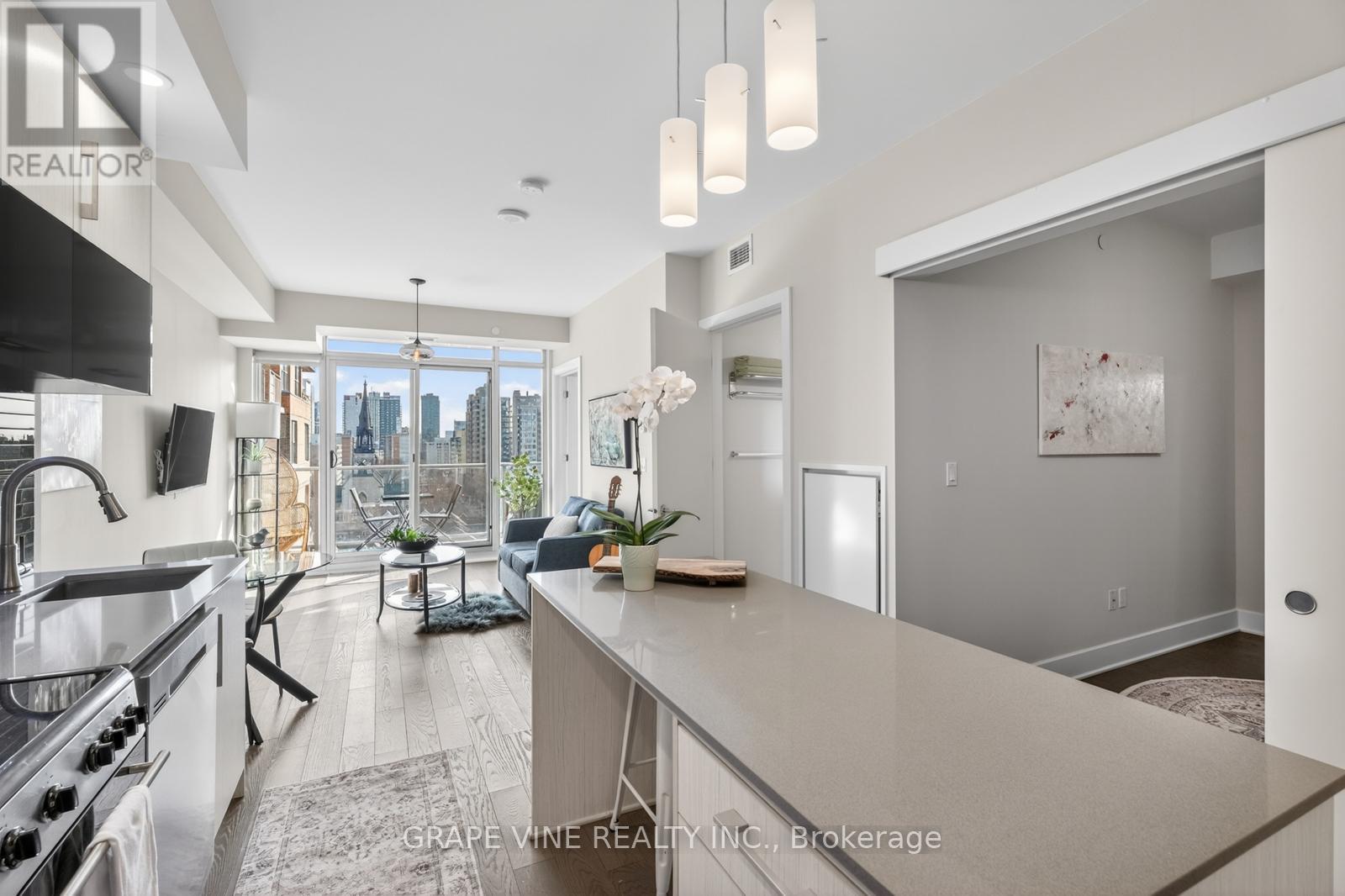 Bright 1-Bedroom + Large Den at 255 Bay Street - Oversized Balcony, Modern Kitchen, and Stunning Downtown Views. Welcome to this beautifully designed 1-bedroom plus large den condo at 255 Bay Street. This warm, spacious suite features an east-facing exposure that fills the home with soft morning light and offers unobstructed downtown views overlooking a historic church-creating a peaceful, open atmosphere in the heart of the city.Suite Highlights. Spacious primary bedroom with high-end finishes, floor-to-ceiling windows, direct bathroom access, and a full-size closet. Rare oversized 21' x 6' balcony-perfect for a dining table, outdoor sofa, and coffee table, creating a true outdoor living space with stunning views. Large den (approx. 8.5' x 11') with sliding barn door, full closet, and study nook-ideal as a guest room, office, or studio (fits a queen bed)In-suite laundry with new high-efficiency front-load machines. Air conditioning and efficient heating for year-round comfort. Modern kitchen with stainless steel appliances (including a brand-new range), large island with bar seating, pot lights, ample cabinetry, and space for a dining table-rare for a 1+den layout. Stylish bathroom with deep tub/shower combo, large medicine cabinet, and designer mirror. Excellent storage throughout, plus a secure basement locker. Building Amenities. Enjoy premium amenities including an indoor pool, fully equipped gym, outdoor terraces, BBQ area, sauna, large party room, guest suites, and outdoor lounge space. Neighborhood. Located in downtown Ottawa, steps to the O-Train, Parliament Hill, groceries, restaurants, bars, and everything Centretown has to offer. (id:64974)