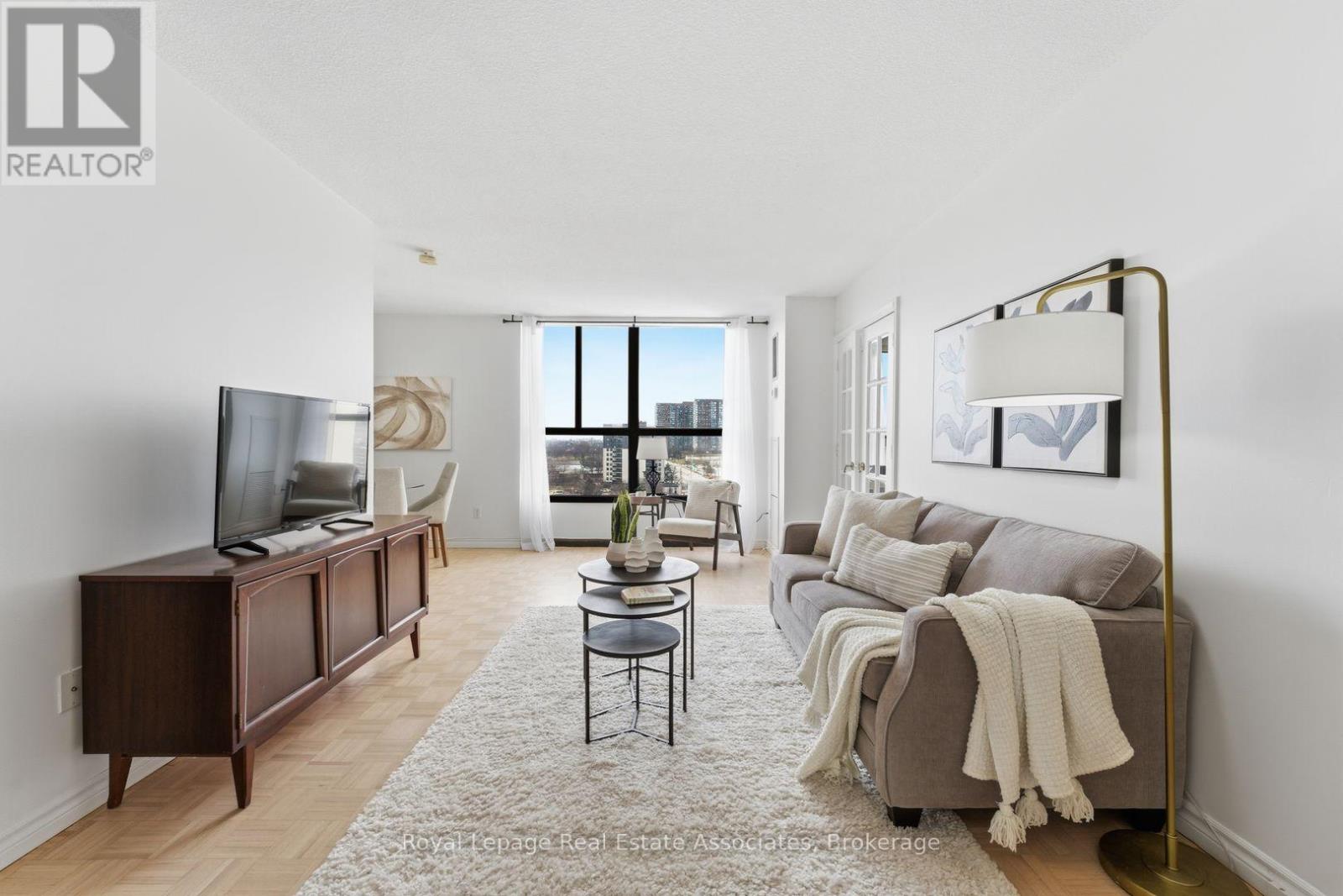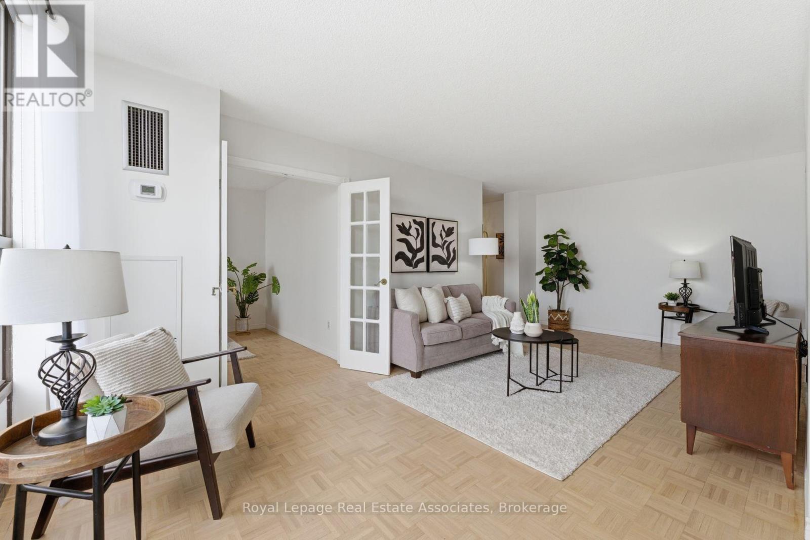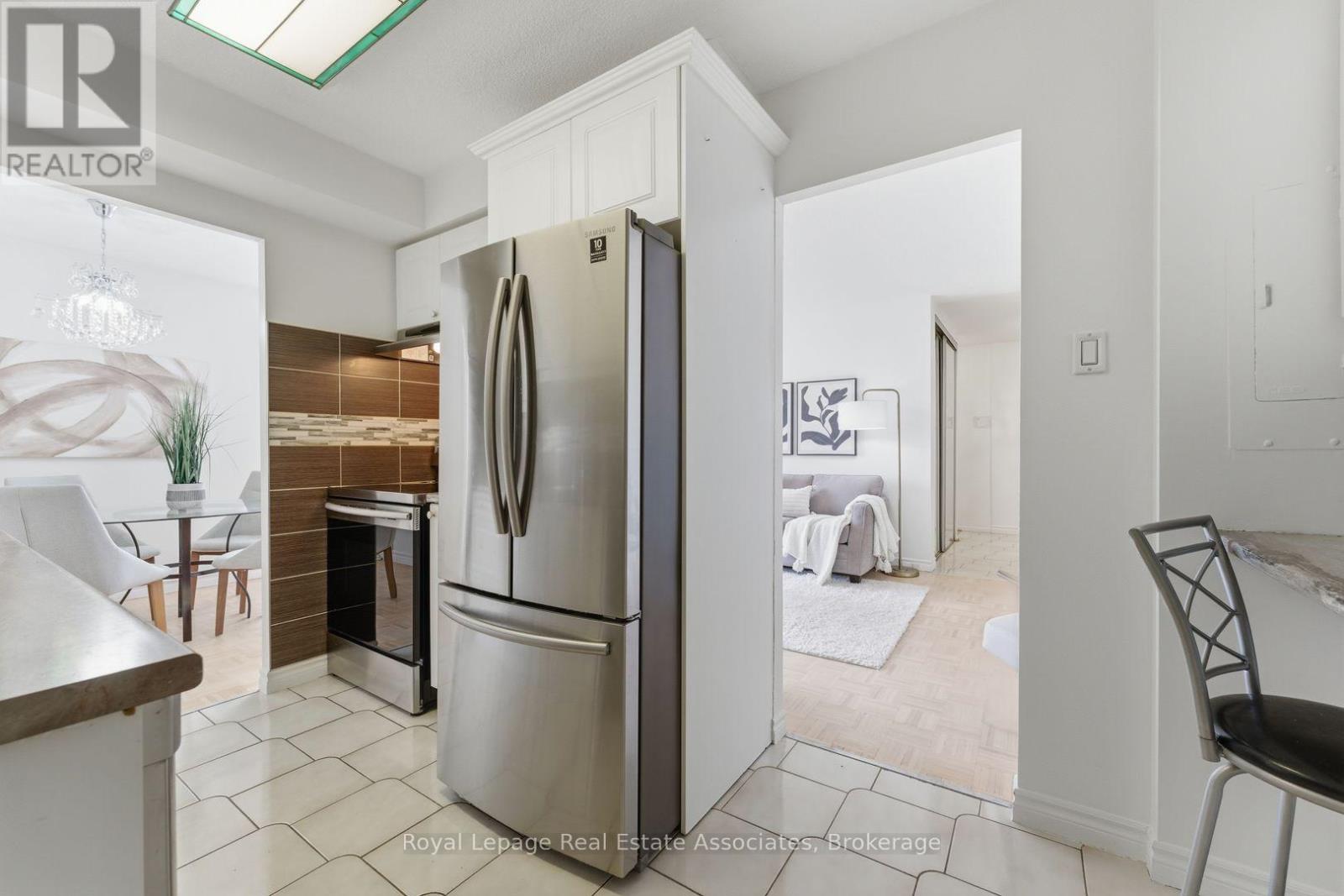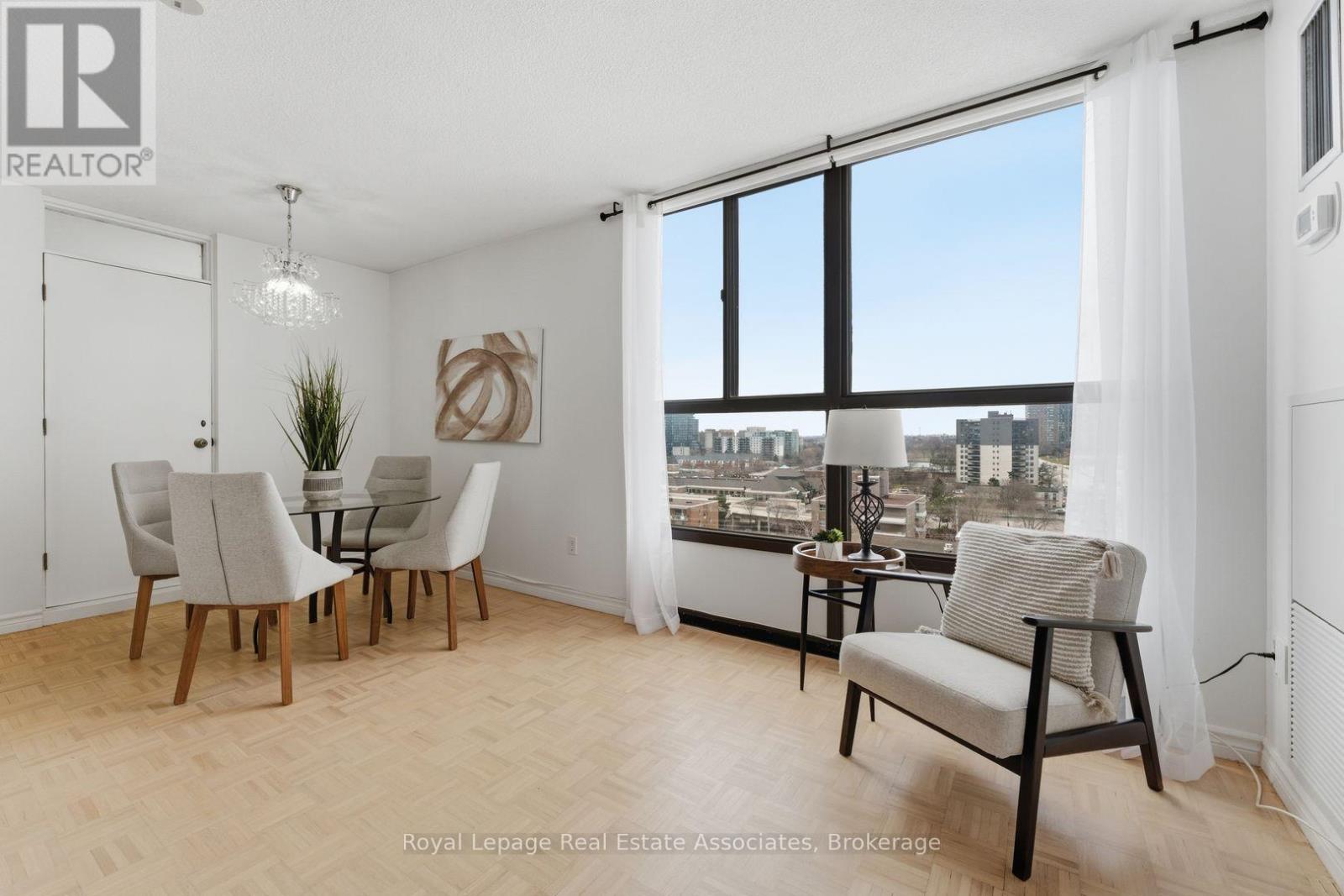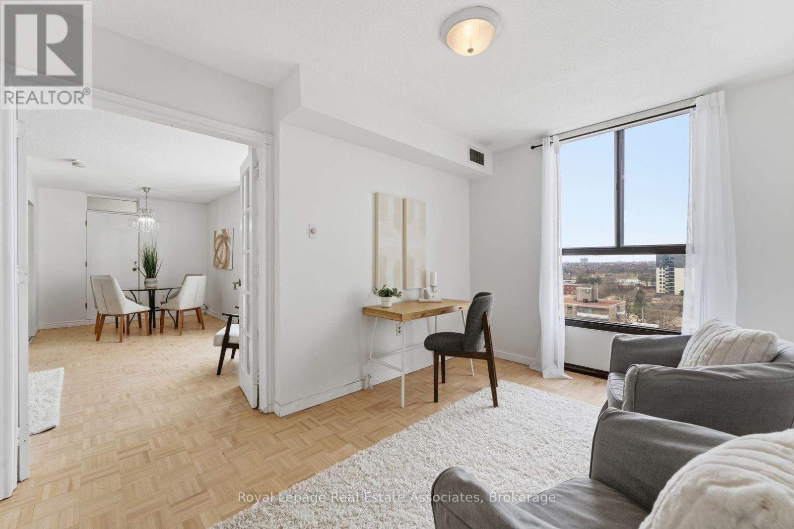 With 1265 square feet, 2 large bedrooms and a huge den graced with double French doors, this spacious and bright unit is just what you've been looking for! The kitchen features modern white cabinetry, stainless steel appliances, ceramic floors, tile backsplash, double sink and lots of storage. Perfect for creating those wonderful holiday meals! The open concept living/dining space features large windows for lots of natural light, warm parquet floors and a walkout to the lovely balcony - a wonderful place to relax at the end of the day. The bedrooms include hardwood floors, big windows and large closets and the oversize den can easily serve as a third bedroom. Both washrooms have been updated with modern finishes, soft-close cabinets and ceramic flooring. There's an ensuite storage room and a massive ensuite laundry room with even more storage space! Public Transit options are plentiful with nearby Cooksville GO, numerous bus routes and the upcoming Hurontario LRT. Easy access to the QEW or 403 and just 16 minutes to Pearson Airport. Trillium Hospital is close by and there are fantastic shopping and restaurant options all along Dundas and Hurontario. Explore the numerous parks and trails in the vicinity, pop over to Cooksville Library for a good read or enjoy skating, fitness and swimming at Mississauga Valley Community Centre. This neighbourhood has everything you and your family need! (id:64974)
