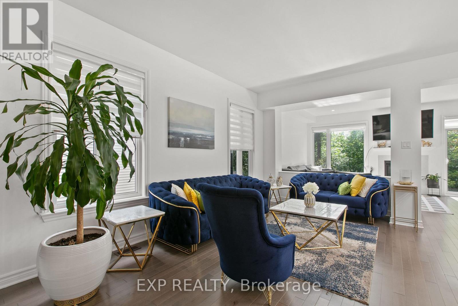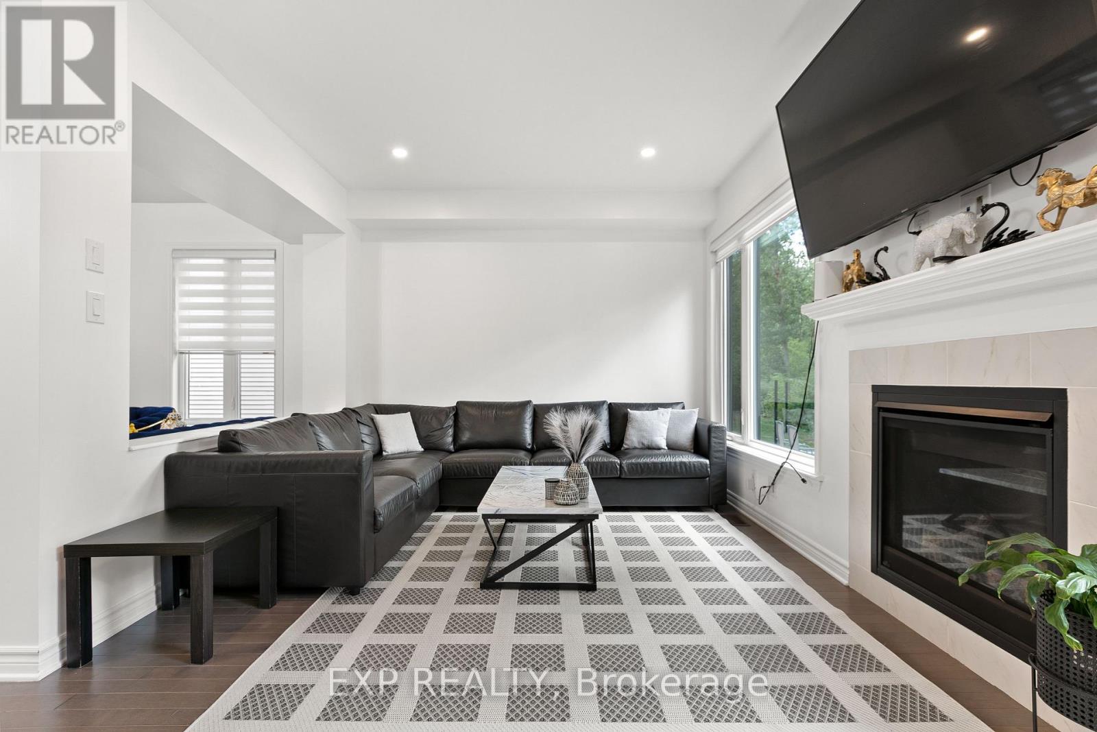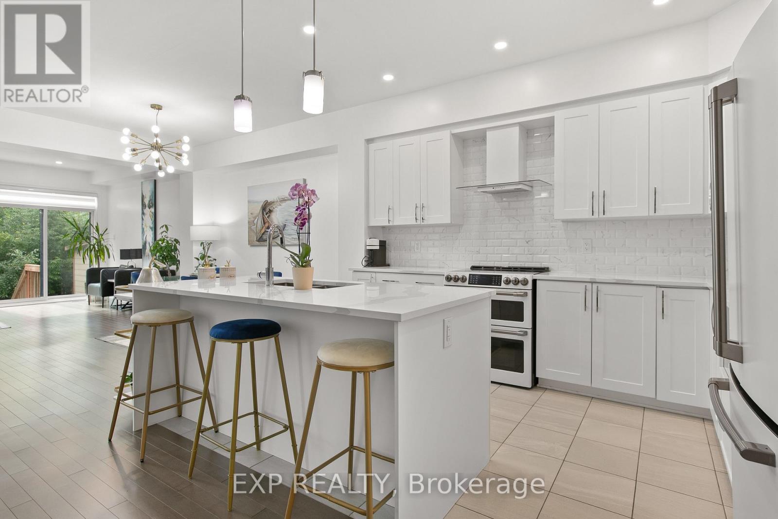 Welcome to 1010 Eider Street, stunning Fairhaven-End model by Richcraft Homes in highly sought-after Riverside South. Built in 2022, this meticulously maintained 3-bed + den, 3-bath END-UNIT townhome offers over 2,200 sq. ft. of living space, backing onto a serene treed area with NO REAR NEIGHBOURS. Step inside to find elegant hardwood floors throughout the main level, a bright open-concept layout, and a gas fireplace that adds warmth to the family room. The chef-inspired kitchen features quartz countertops, sleek cabinetry, and a full suite of luxury White Café appliances. Enjoy casual dining at the breakfast bar or entertain in the adjacent dining area overlooking the private backyard. Upstairs, a generous loft/den provides the perfect workspace or reading nook. The primary bedroom is a true retreat with a large walk-in closet and a spa-style ensuite featuring a soaker tub, walk-in glass shower, and quartz counters. Two additional bedrooms, a full bath, and second-floor laundry complete this level. The fully finished basement offers a spacious rec room with endless possibilities. With 3 parking spaces, a single garage, and prime proximity to schools, parks, and shopping, this move-in ready home checks every box! (id:64974)
