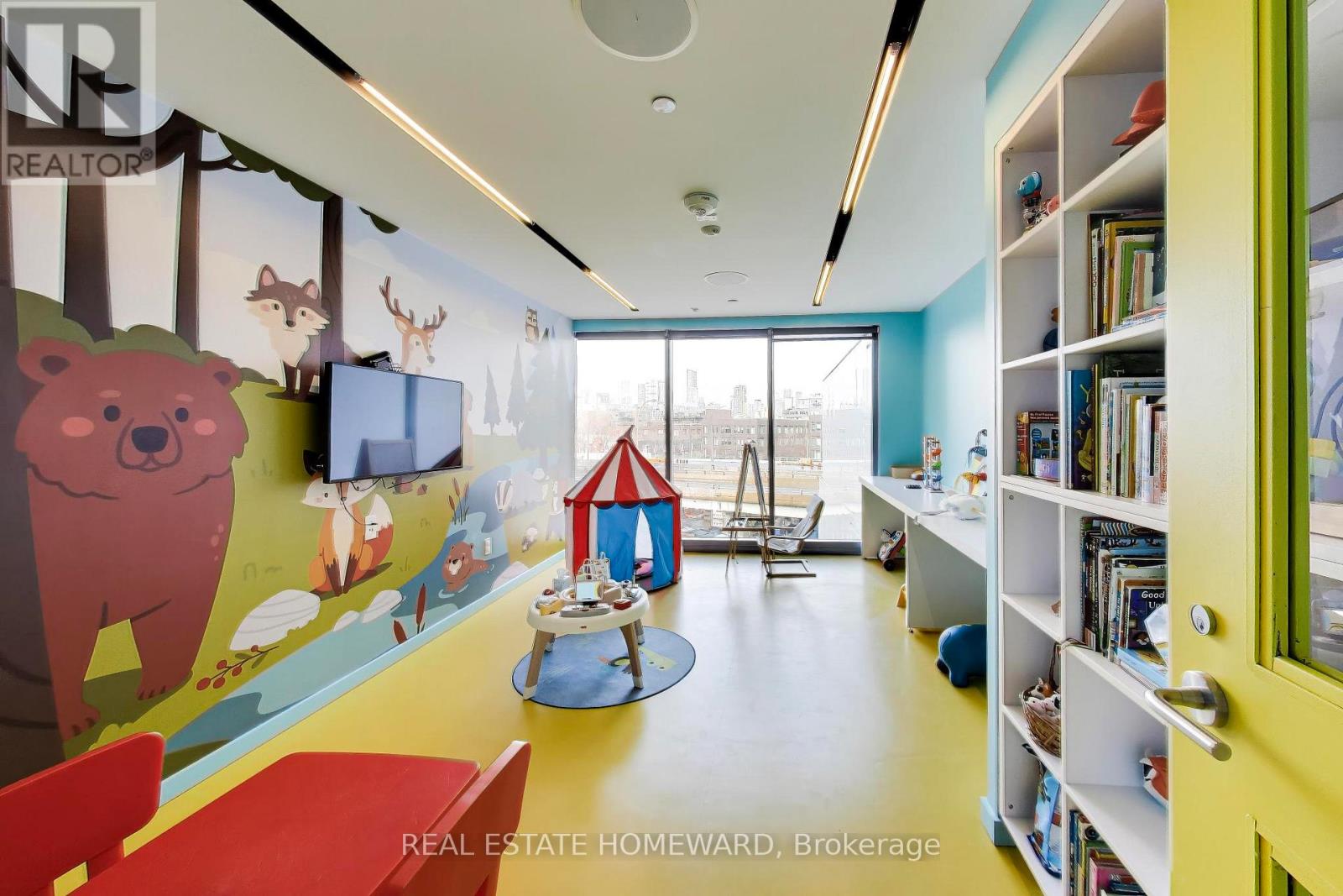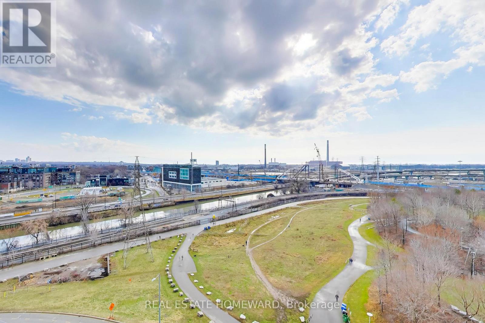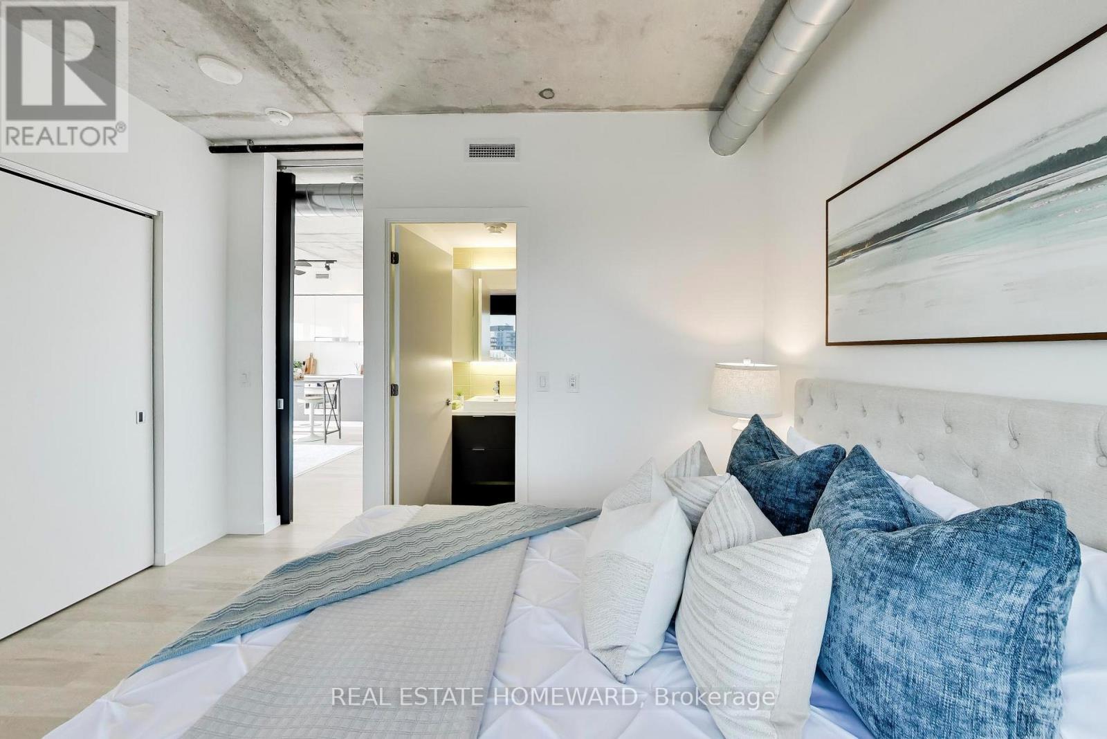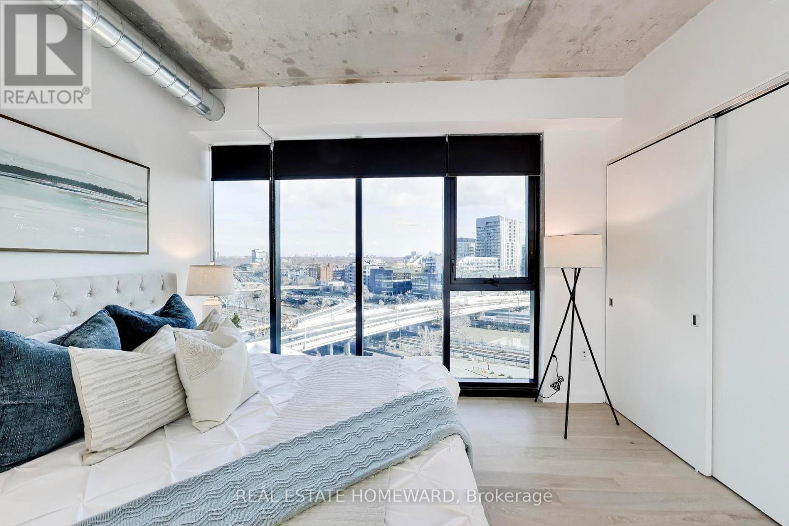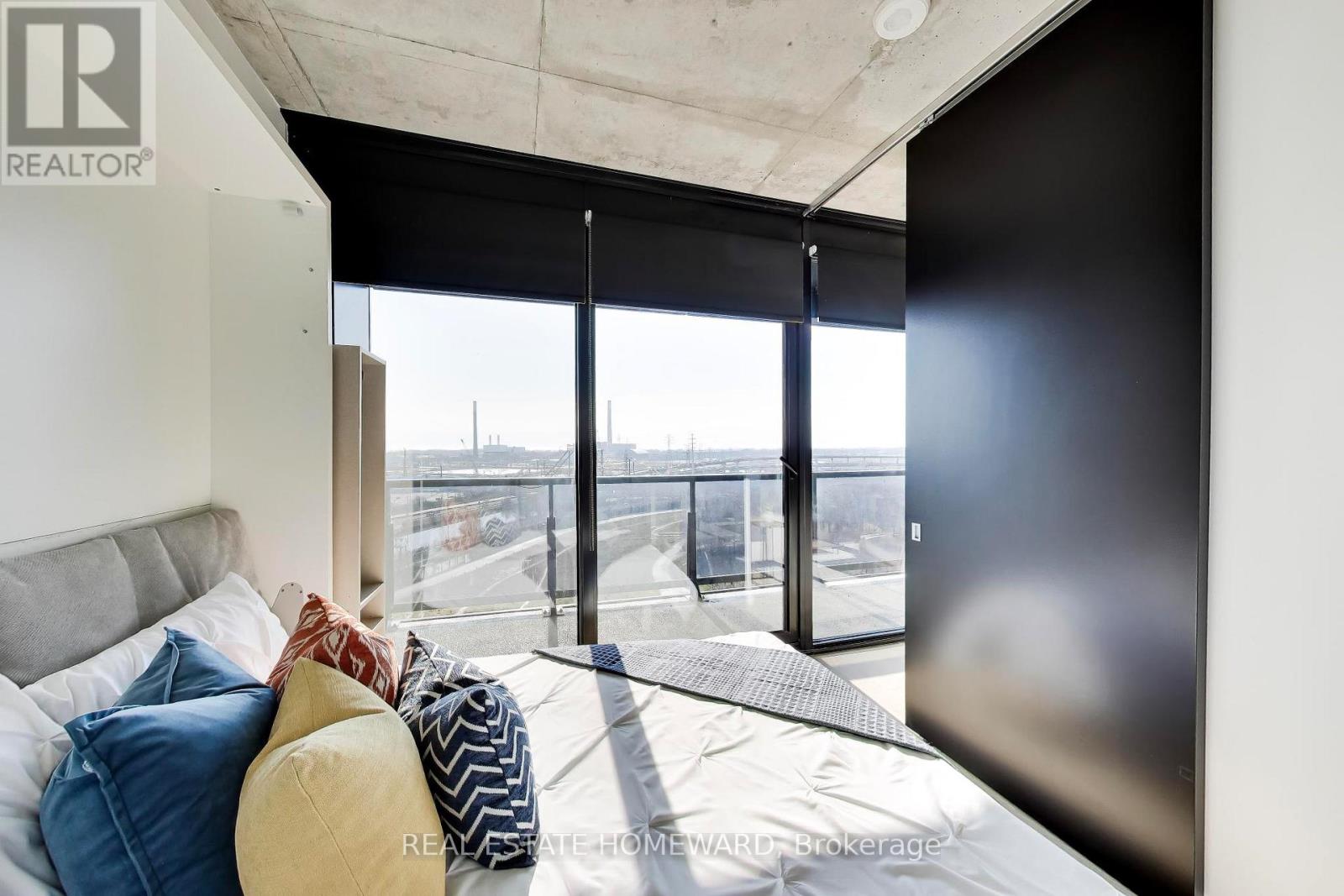 A quiet space minutes from downtown! This spacious 2 bedroom corner unit has the perfect open concept space for entertaining or working from home. Exposed concrete and high ceilings allow for airy, loft-like feel. Integrated appliances and thoughtful kitchen layout mean no wasted space. Spa-like 3 piece ensuite off of primary bedroom with ample storage. Second bedroom offers clear views, complete with combination Murphy bed/desk to create the perfect multipurpose space. Floor to ceiling windows and an oversized balcony offering panoramic views over Corktown Commons and clear views of holiday fireworks at Ashbridges Bay. High-end automated window coverings allow for sleek and modern look. Unit comes with parking (and bike parking!), but no need for a car with shops and amenities of Corktown, the Distillery, and Canary district within a few minutes walk. LEED-certified building with luxury amenities including outdoor pool, gym, workshop, party room, kids playroom, and more. (id:64974)