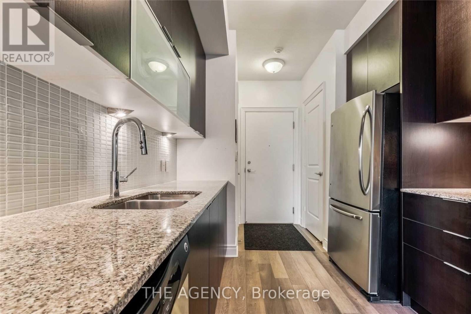 Welcome to Nautilus at Waterview. This well-maintained 1-bedroom suite is located in the Park Lawn& Lake Shore area, offering a practical layout with 9' ceilings and southwest exposure for consistent natural light throughout the day. The unit features a modern kitchen with granite countertops and an open-concept living and dining space. A standout feature is the dual balcony access from both the living room and bedroom, providing functional outdoor space and added convenience. Includes 1 parking space and 1 locker. Building offers a full range of amenities and is ideallysituated close to the waterfront, parks, transit, and local shops. (id:64974)