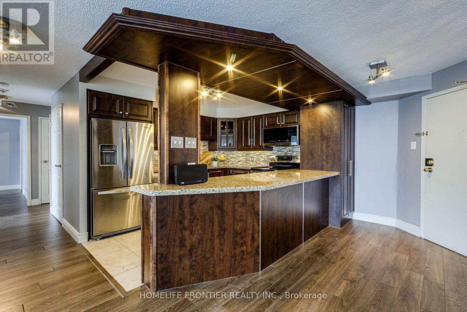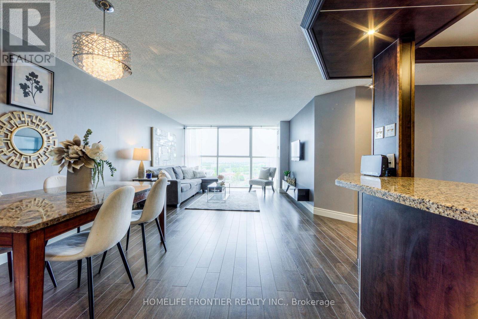 Welcome to a place where comfort meets convenience, right in the vibrant heart of Mississauga! This meticulously renovated, spacious condo offers over 1150 sqft of comfort and style. You'll love the thoughtful layout that floods the open concept living and dining areas with natural light, thanks to the floor-to-ceiling windows showing off a jaw dropping sunset. The two generously sized bdrms provide plenty of space to unwind. The gourmet kitchen is a dream for anyone who loves to cook, featuring sleek stainless-steel appliances. Plus, the convenience of ensuite laundry adds an extra touch of ease to your daily routine. Step outside and enjoy being just a short walk from shopping centers, community facilities, libraries, parks, cafes, and much more. For those who commute, you'll appreciate the easy access to major highways and public transportation, including the GO station, making travel throughout the GTA a breeze. Maintenance fees include all utilities. (id:64974)