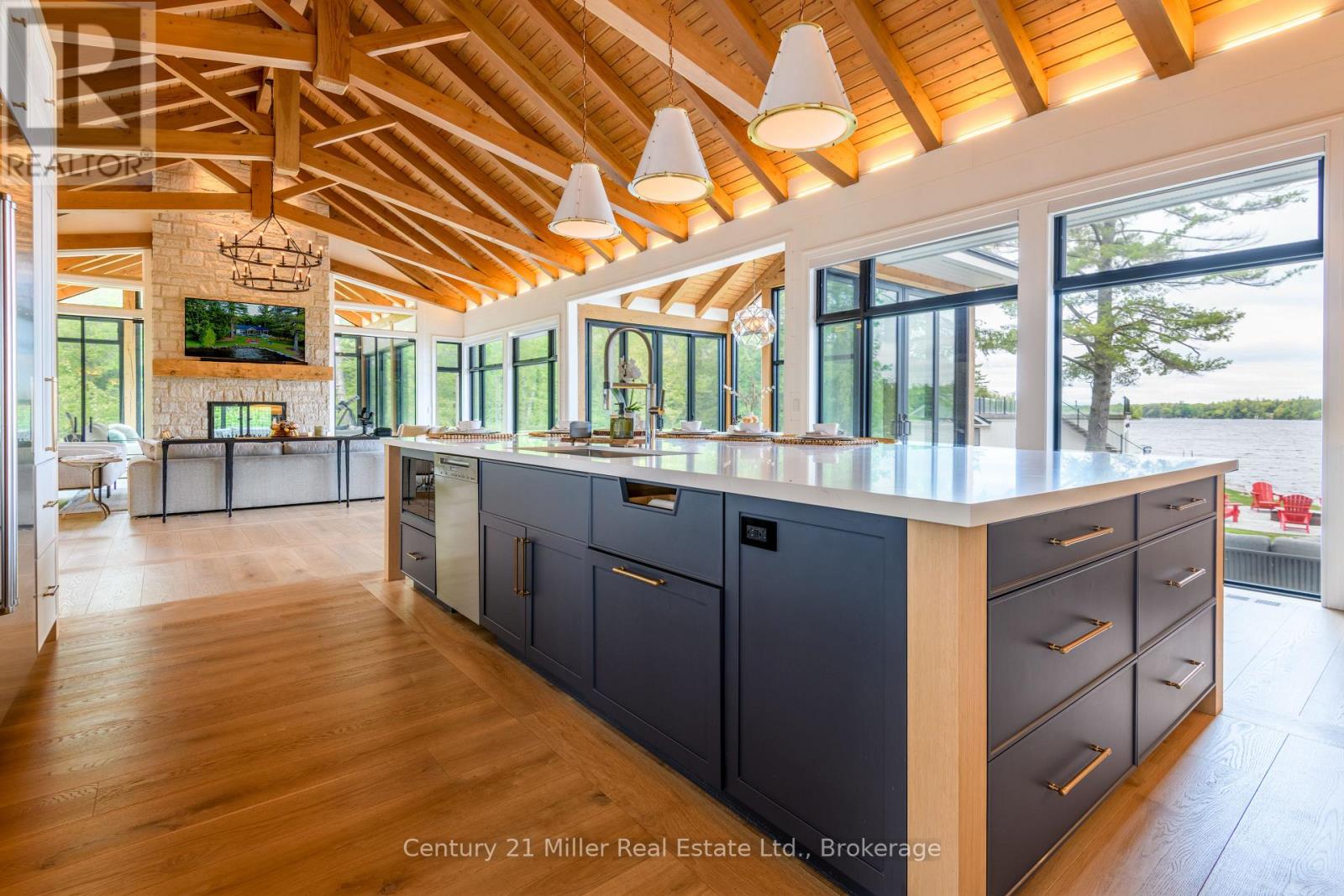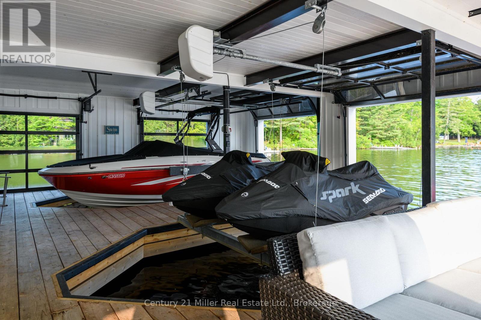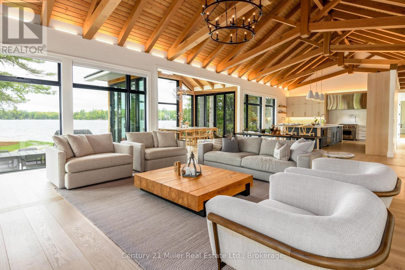 This luxuriously appointed custom-built retreat sits on a spectacular level lot with 500+ feet of pristine shoreline, offering exceptional privacy, breathtaking sunset views, and the quintessential Muskoka lifestyle. Built by the renowned Cobalt Custom Homes, the property showcases outstanding craftsmanship and thoughtful design. The main cottage is a masterclass in refined lakeside living, highlighted by soaring vaulted open-beam ceilings, a striking double-sided limestone fireplace, and dramatic floor-to-ceiling windows that fill the interior with natural light while framing panoramic lake views. The gourmet kitchen is a chef's dream, fully equipped with Wolf and Sub-Zero appliances, butler pantry, and flows seamlessly into an expansive dining space anchored by an impressive harvest table-an ideal setting for gathering family and friends and truly the heart of cottage living. The cottage features six spacious bedrooms accommodating 20+ guests, including a private primary wing with a luxurious ensuite, oversized walk-in closet, and sliding doors leading to a tranquil patio. An inviting all-season Muskoka room allows you to enjoy the surrounding landscape comfortably all year. Additional guest accommodations include a two-bedroom bunkie, offering visitors their own relaxing retreat. The three-car garage is topped by a beautifully finished loft complete with a gym and extra sleeping quarters-perfect for overflow guests or a quiet escape after a day on the water. A two-slip boathouse with glass roll-up doors opens onto a generous dock ideal for swimming, sunbathing, and launching lake adventures. The elevated sundeck with glass railings provides sweeping views across the bay, an exceptional place to enjoy Muskoka's famous sunsets with a beverage. A short boat ride to Bala for shopping and dining-or a summer evening at The Kee. A year-round municipal road access, a drilled well, and a sandy lake bottom perfect for kids, creating a truly turn-key four-season sanctuary. (id:64974)