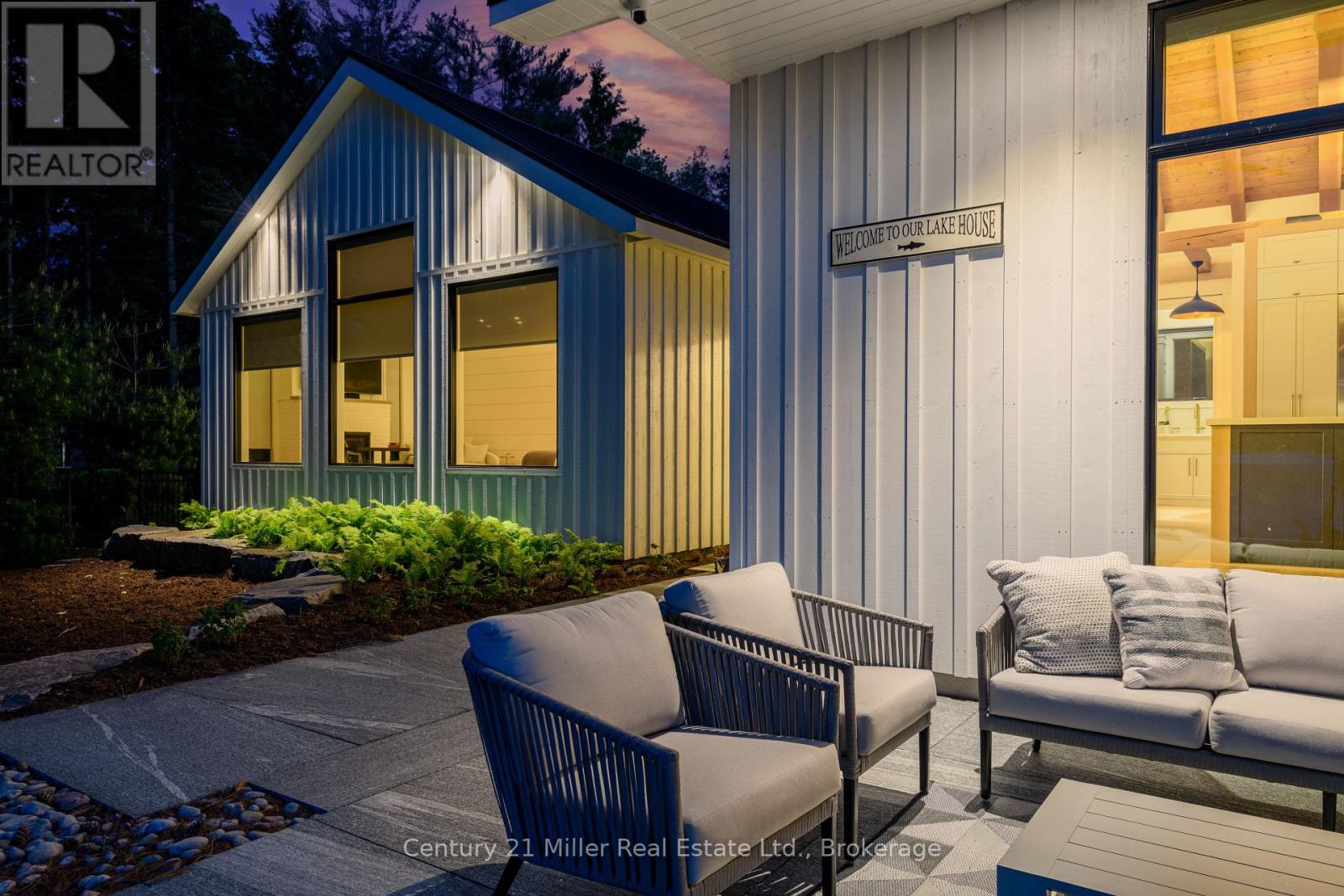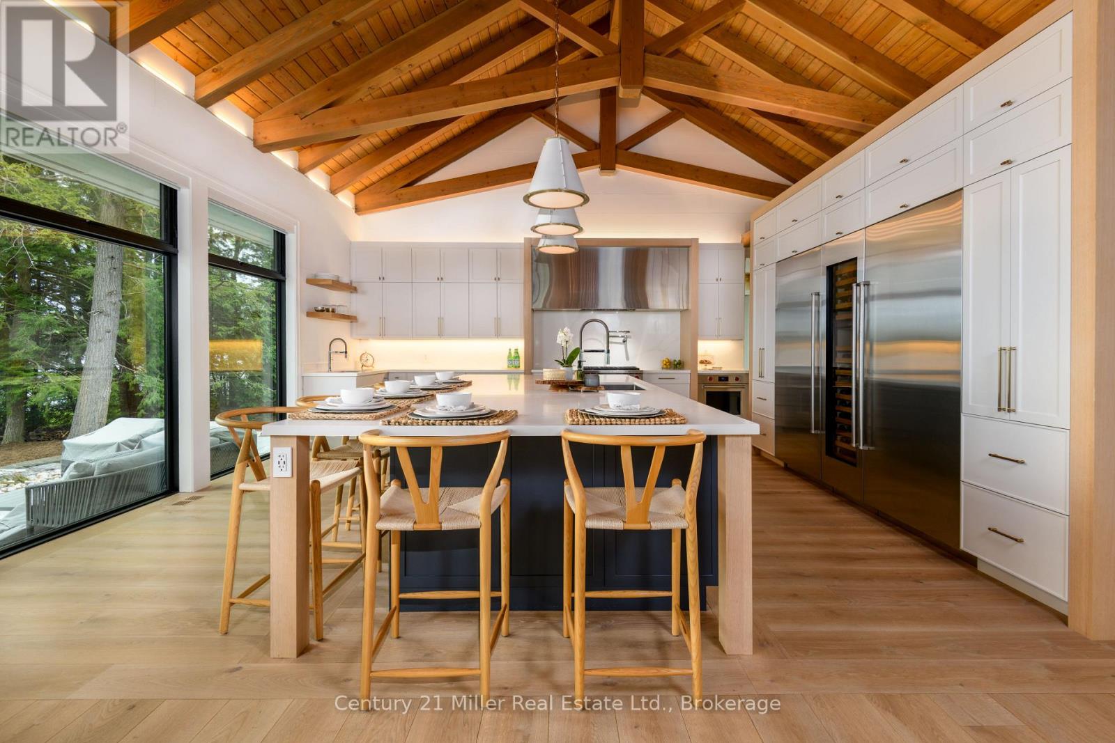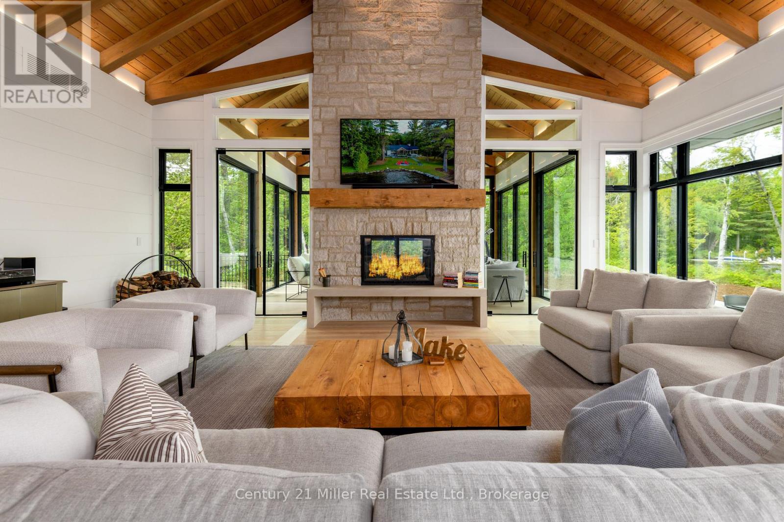 This luxuriously appointed custom-built retreat sits on a spectacular level lot with 500+ feet of pristine shoreline, offering exceptional privacy, breathtaking sunset views, and the quintessential Muskoka lifestyle. Built by the renowned Cobalt Custom Homes, the property showcases outstanding craftsmanship and thoughtful design. The main cottage is a masterclass in refined lakeside living, highlighted by soaring vaulted open-beam ceilings, a striking double-sided limestone fireplace, and dramatic floor-to-ceiling windows that fill the interior with natural light while framing panoramic lake views. The gourmet kitchen is a chef's dream, fully equipped with Wolf and Sub-Zero appliances, butler pantry, and flows seamlessly into an expansive dining space anchored by an impressive harvest table-an ideal setting for gathering family and friends and truly the heart of cottage living. The cottage features six spacious bedrooms accommodating 20+ guests, including a private primary wing with a luxurious ensuite, oversized walk-in closet, and sliding doors leading to a tranquil patio. An inviting all-season Muskoka room allows you to enjoy the surrounding landscape comfortably all year. Additional guest accommodations include a two-bedroom bunkie, offering visitors their own relaxing retreat. The three-car garage is topped by a beautifully finished loft complete with a gym and extra sleeping quarters-perfect for overflow guests or a quiet escape after a day on the water. A two-slip boathouse with glass roll-up doors opens onto a generous dock ideal for swimming, sunbathing, and launching lake adventures. The elevated sundeck with glass railings provides sweeping views across the bay, an exceptional place to enjoy Muskoka's famous sunsets with a beverage. A short boat ride to Bala for shopping and dining-or a summer evening at The Kee. A year-round municipal road access, a drilled well, and a sandy lake bottom perfect for kids, creating a truly turn-key four-season sanctuary. (id:64974)