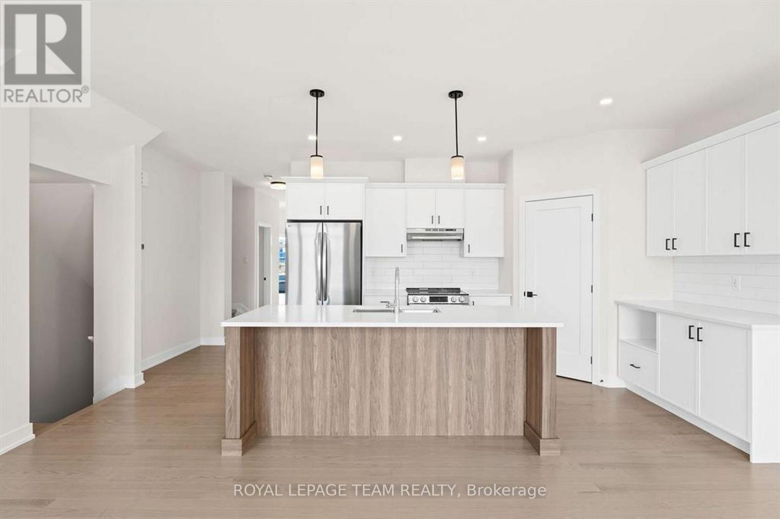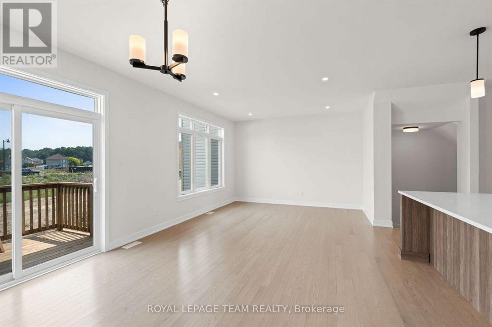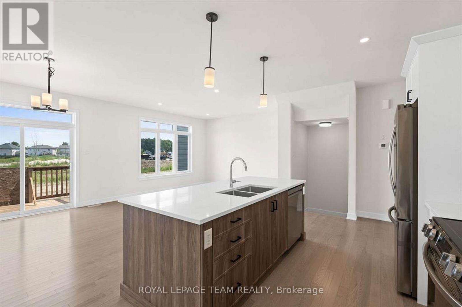 Discover this beautifully crafted semi-detached home in the sought-after Stirling Meadows community in Brockville. Available May 1, 2026, this newly built "Thornbury" model by Mackie Homes offers approximately 1,868 sq. ft. of thoughtfully designed living space, featuring 3 bedrooms, 3 bathrooms, and an oversized garage. The main floor welcomes you with a bright, open-concept layout designed for comfortable everyday living. The living and dining area features large windows, pot lighting, and hardwood flooring throughout, with direct access to the sun deck - perfect for relaxing or entertaining. The stylish kitchen blends form and function with quartz countertops, a subway tile backsplash, a centre island, a pantry, and stainless steel appliances. A convenient powder room completes the main level. Upstairs, the spacious primary suite includes a large walk-in closet and a 4-piece ensuite with a soaker tub and glass shower. Two additional bedrooms, a full bathroom, and a dedicated laundry room provide plenty of space and convenience for families or guests. Ideally located with quick access to Highway 401 and close to shopping, dining, and everyday amenities, this home offers the perfect balance of comfort, style, and convenience in one of Brockville's newest communities. (id:64974)