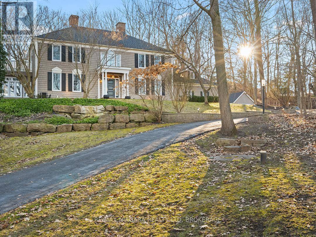 Camelot Hill Estate: A custom-built Georgian Colonial set on 1.2 acres of manicured, tree-lined grounds overlooking winding Lakeshore Road West, just outside the lakeside town of Port Colborne. With over 3,700 sq ft of finished living space, the home commands a striking hillside presence while offering privacy and a peaceful setting. The columned entrance opens to a grand foyer with a sweeping oak staircase, leading into formal living and dining rooms defined by classic architectural details. The main floor also features a private office, a bright Florida room with French doors to the terrace, and a comfortable family room-well suited for both everyday living and entertaining.The kitchen was updated in 2022 with new cabinetry and flooring, blending traditional style with modern function, and includes granite countertops, high-end appliances, and a breakfast area overlooking the grounds. Upstairs, there are 4-5 generous bedrooms and 2.5 updated bathrooms. Restored hardwood floors, two gas fireplaces, and abundant natural light highlight the home's timeless character throughout.The lower level is unfinished, offering excellent potential to further expand the living space. Major updates include a new roof (2021), new windows and doors (2022), garage doors, lighting, and a new water system. A dedicated internet tower provides reliable high-speed connectivity.The landscaped grounds feature terraces, gardens, and a heated garden shed-ideal for relaxing, gathering, or creative use. 10187 Lakeshore Road is a rare estate offering a serene wooded setting, strong presence, and quick possession. (id:64974)