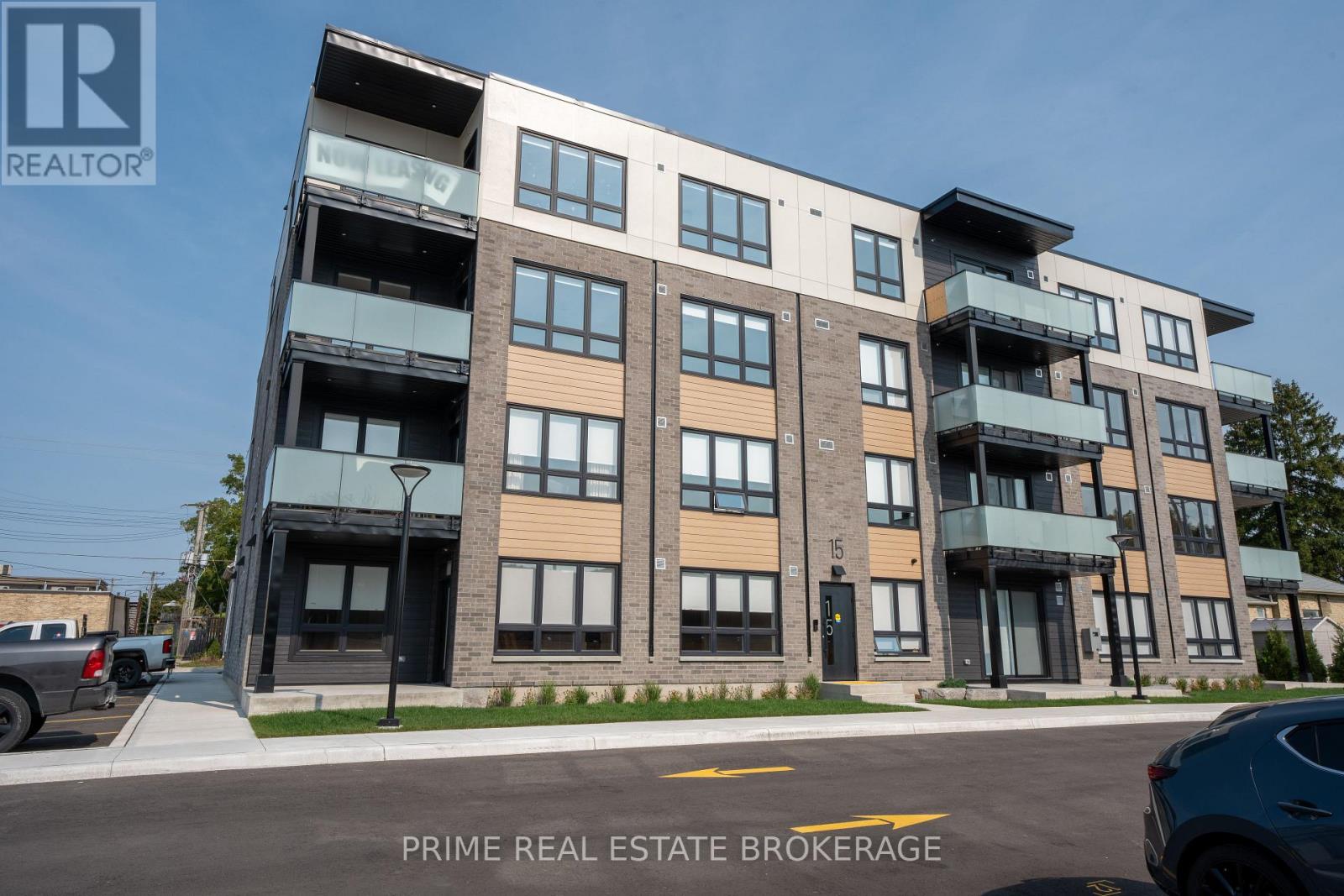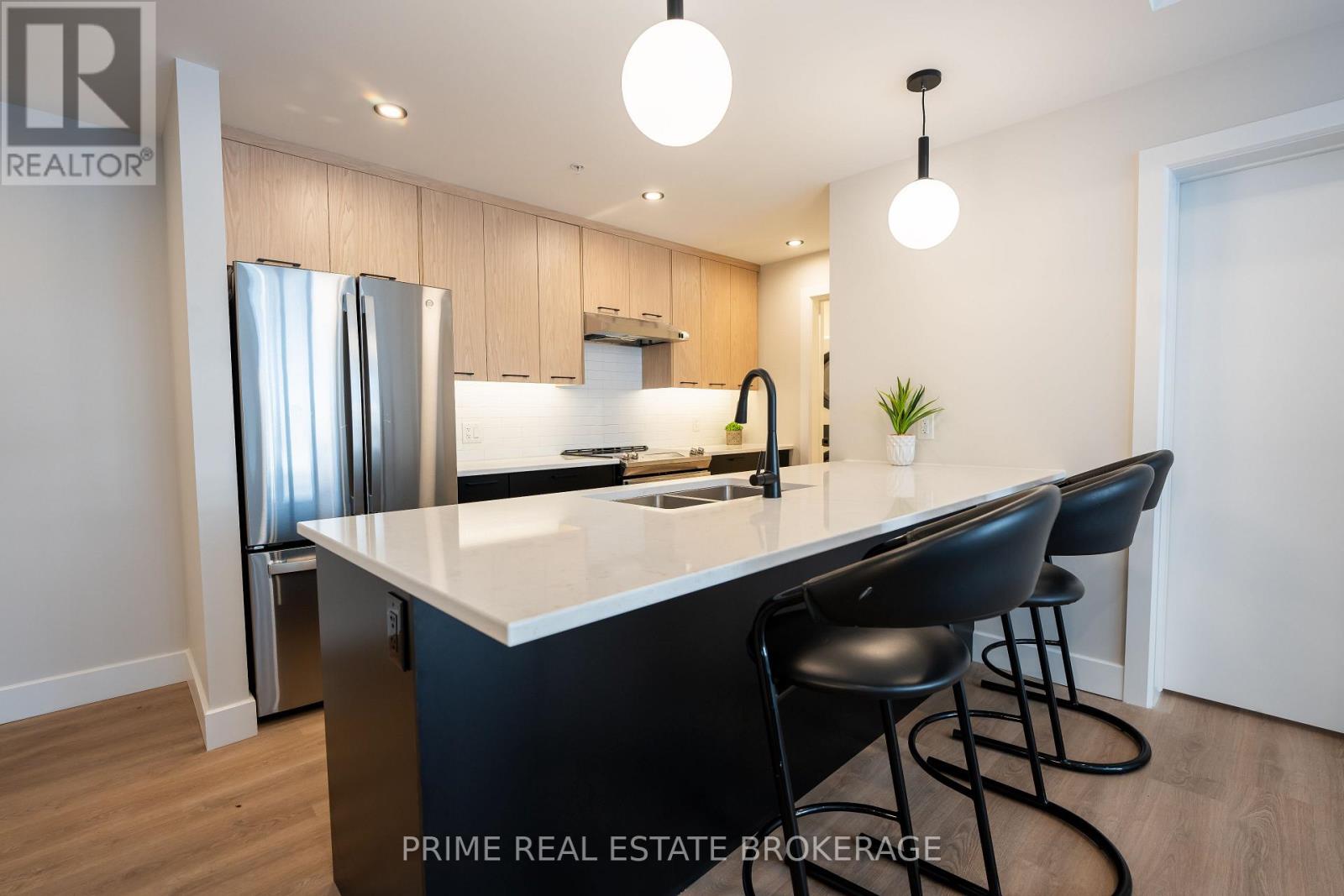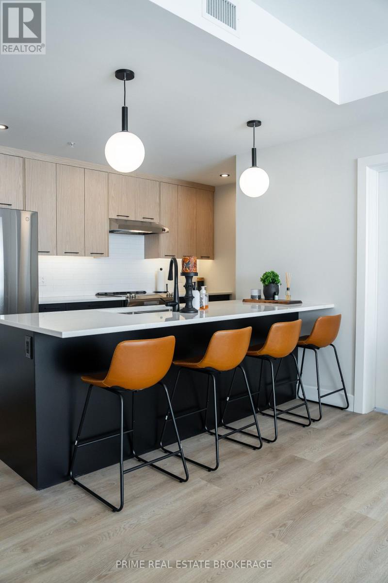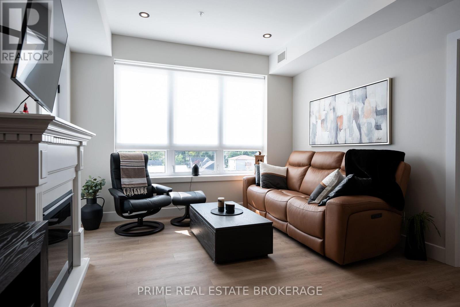 Available January 1, 2026! This barrier-free, 2 bedroom main floor suite at James Street Commons is an aesthetically pleasing, well-designed property located just one block from the vibrant MainStreet core with shopping, dining and the hospital nearby, and a quick 35 minute commute to London or Stratford. Conveniently located yet situated on a quiet residential street with 24/7 secure access, the interior boasts luxurious finishes, oversized windows and 9 foot ceiling that provide for an elegant, yet bright and comfortable space to call home. The stylish open concept kitchen/dining area features stainless steel appliances, quartz countertops, two-tone cabinetry, subway tile backsplash, and an island. An in-suite laundry room is a bonus, while a large primary bedroom with a spacious walk-in closet, and a second bedroom share a 3 pc washroom with a tiled shower. A private covered patio is perfect for relaxing during the warmer months. (id:64974)