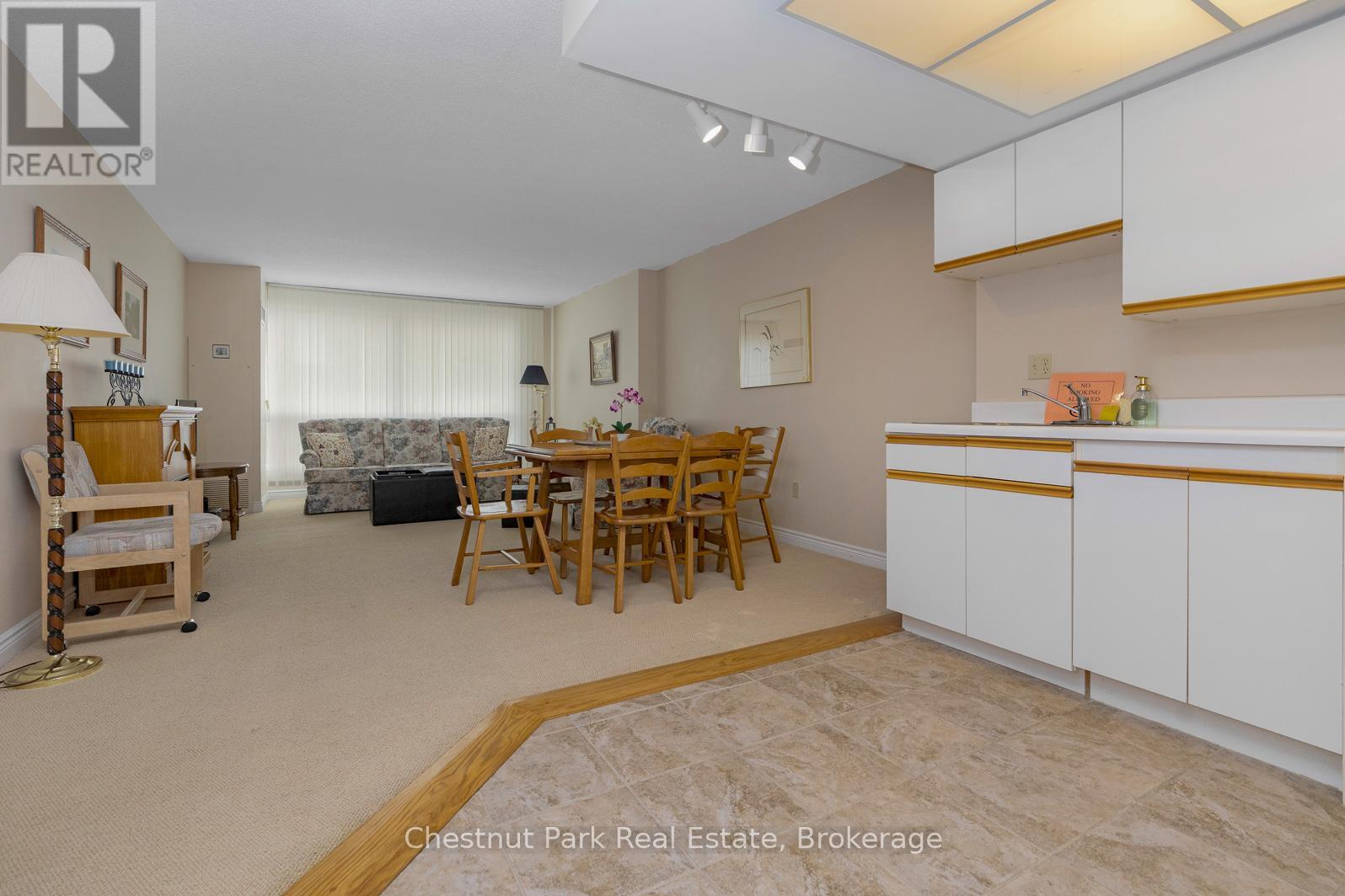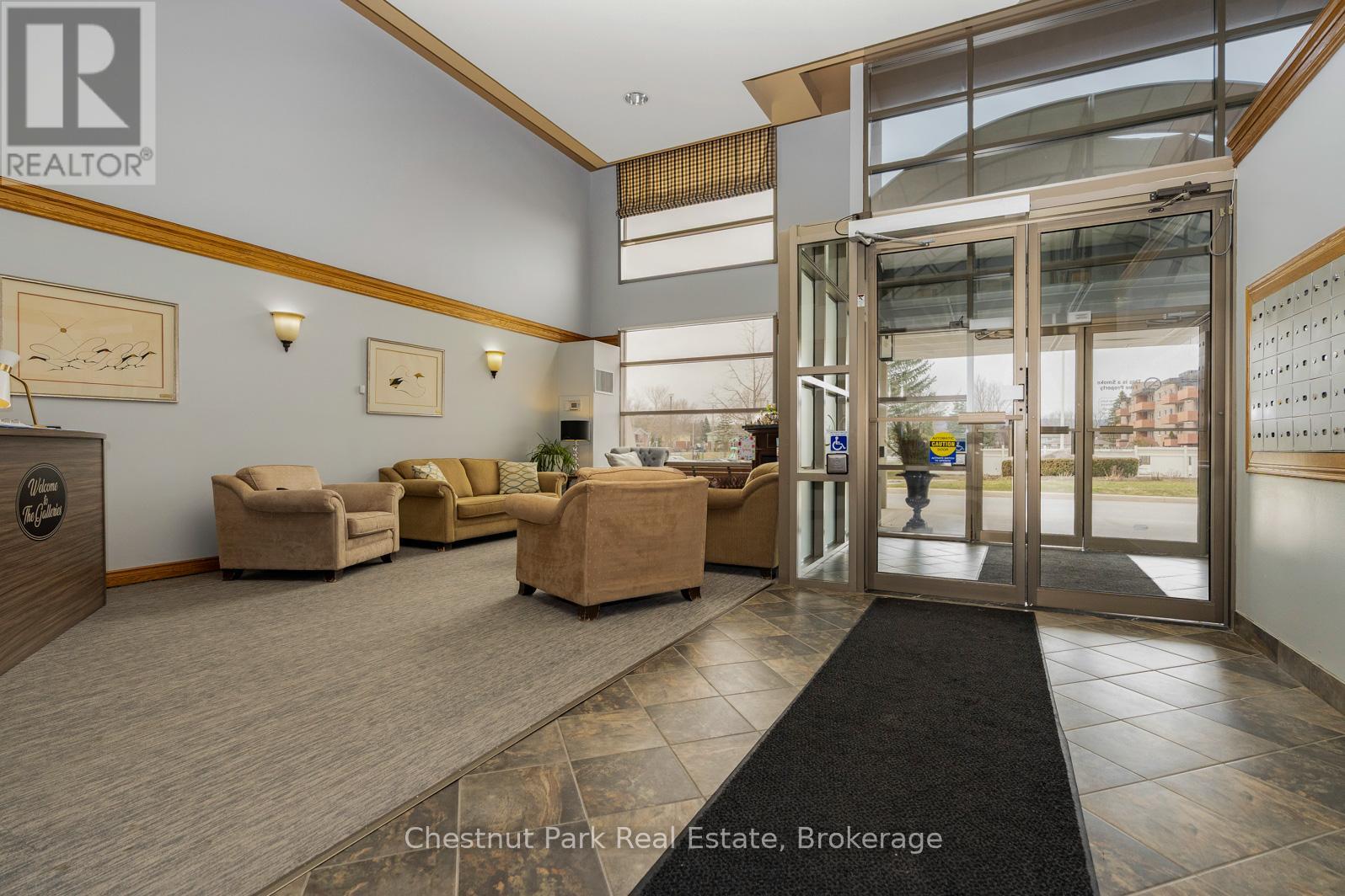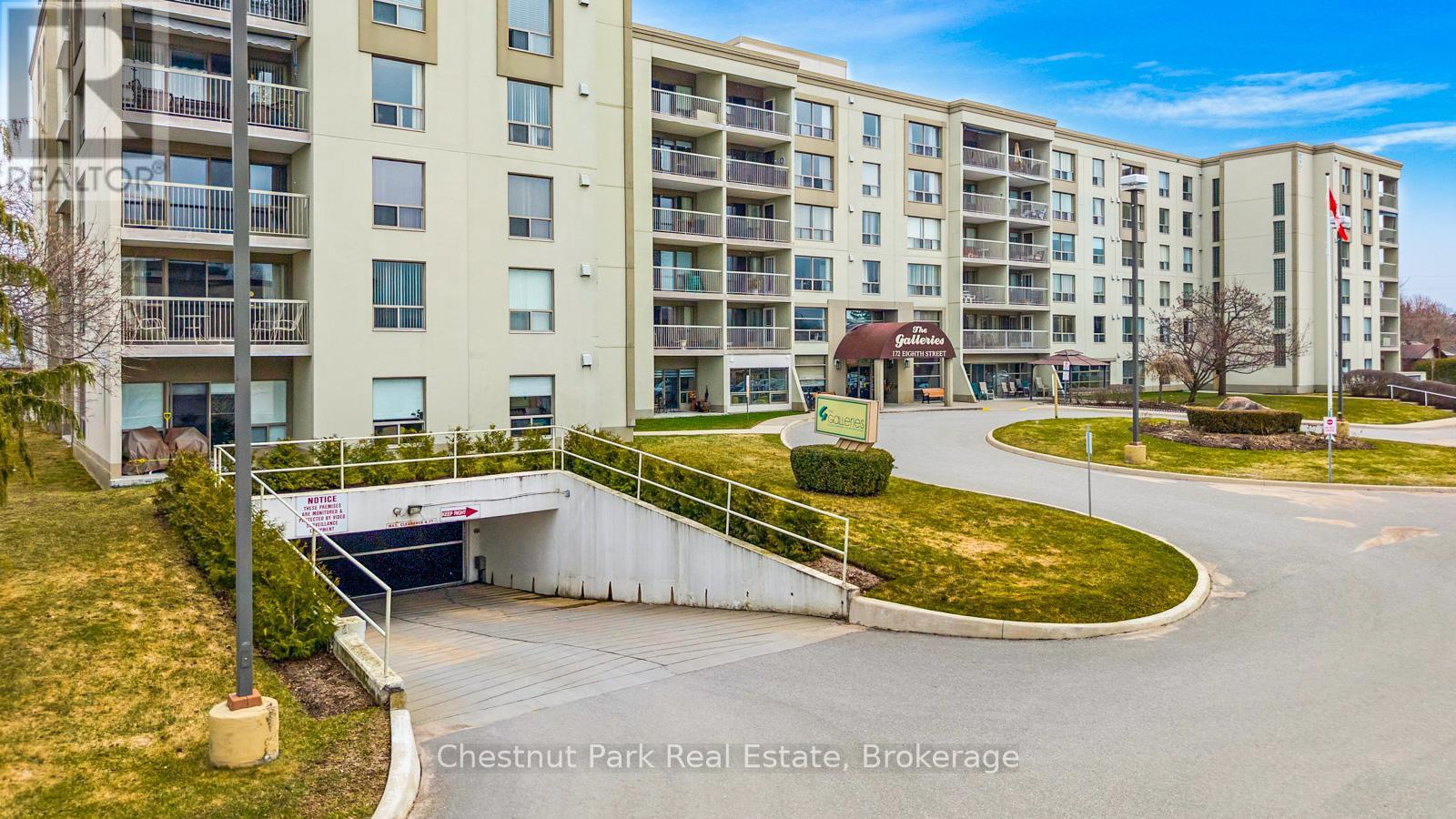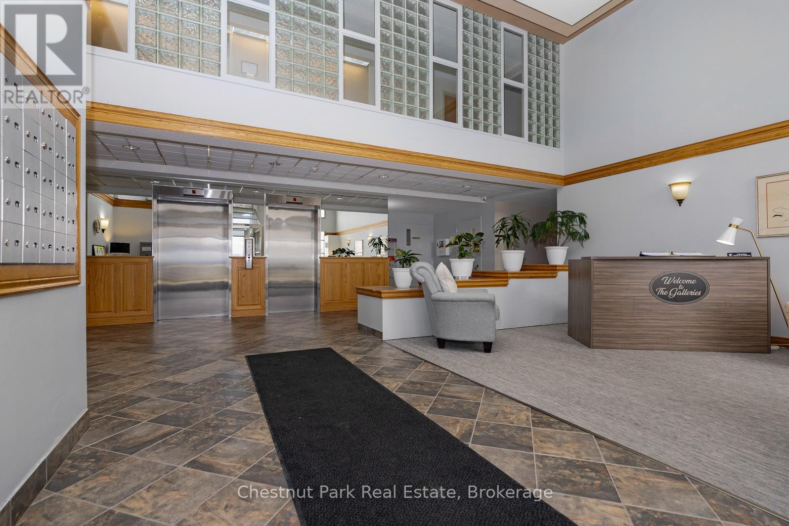 Bright and light 2 bedroom condo on the main floor in The Galleries. This west facing unit boasts ample space with over 1100 sqft; newly installed vinyl plank flooring; and freshly painted. Easy access to the secure front entrance with concierge service or keyless fob side entry to the building, no elevator is needed! Enjoy the convenience of main floor living, easy access to the sauna/fitness/games room, the social room/library, the guest suite (rental rates apply), and your locker. Your heated underground parking space #27 is conveniently located near your unit, access it using the stairs closest to your unit or the elevator just down the hall. Your condominium fees conveniently include heating, air conditioning, water and parking. The building is pet friendly for small pets. Located on the town bus route, giving you access to all in town amenities ~ downtown, shoppes, grocery stores, Georgian Bay, and a short drive to Blue Mountain Resort. This move in ready condominium offers something for everyone, comfort, convenience, and camaraderie! Enjoy the westerly sunshine and escarpment views from your new home. (id:64974)