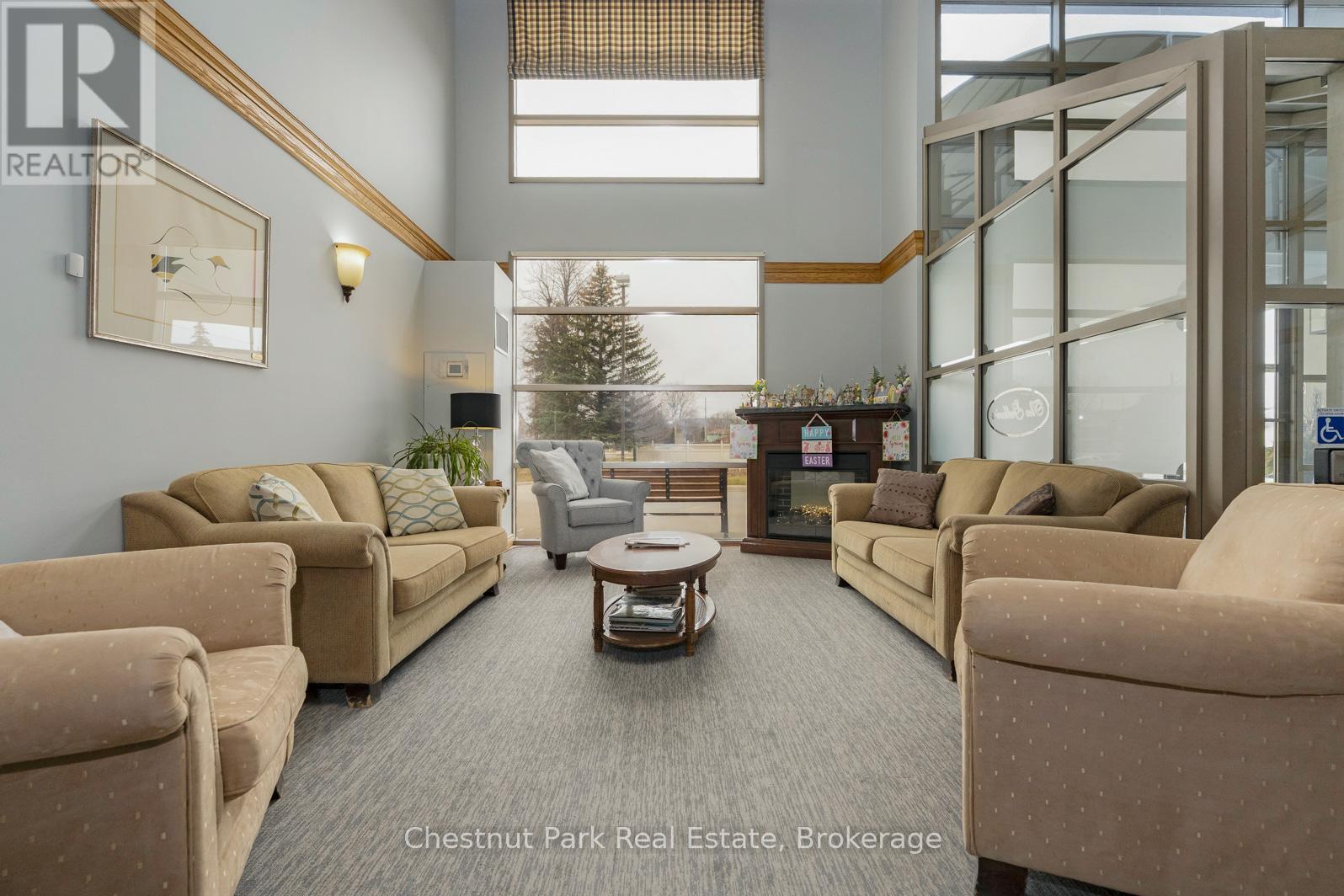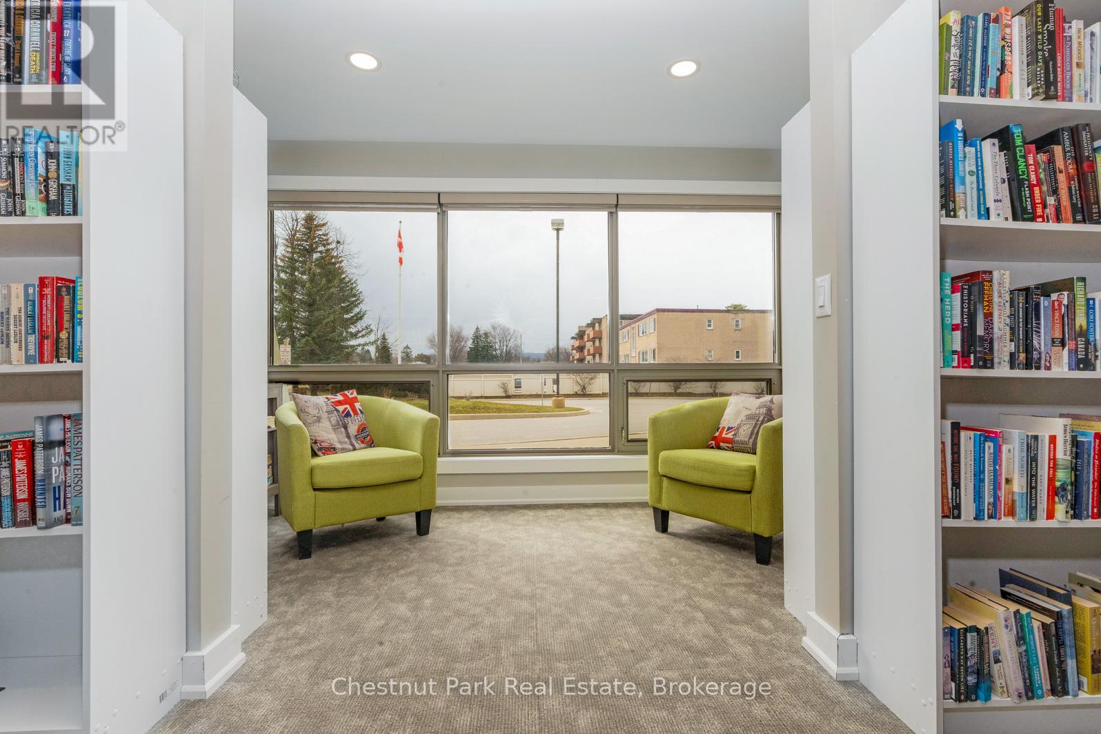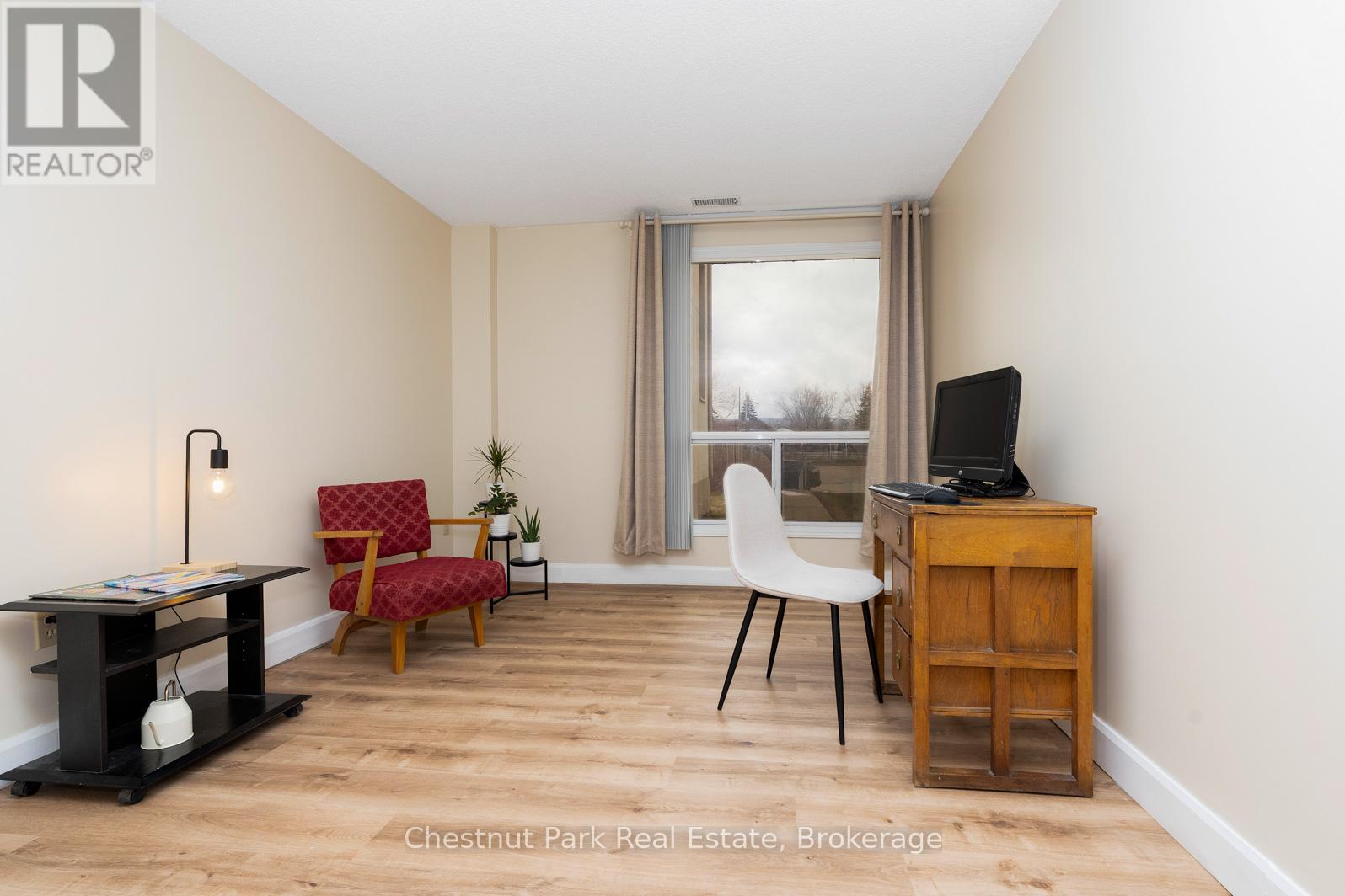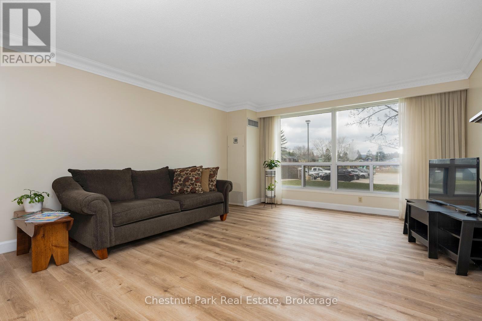 Bright and light 2 bedroom condo on the main floor in The Galleries. This west facing unit boasts ample space with over 1100 sqft; newly installed vinyl plank flooring; and freshly painted. Easy access to the secure front entrance with concierge service or keyless fob side entry to the building, no elevator is needed! Enjoy the convenience of main floor living, easy access to the sauna/fitness/games room, the social room/library, the guest suite (rental rates apply), and your locker. Your heated underground parking space #27 is conveniently located near your unit, access it using the stairs closest to your unit or the elevator just down the hall. Your condominium fees conveniently include heating, air conditioning, water and parking. The building is pet friendly for small pets. Located on the town bus route, giving you access to all in town amenities ~ downtown, shoppes, grocery stores, Georgian Bay, and a short drive to Blue Mountain Resort. This move in ready condominium offers something for everyone, comfort, convenience, and camaraderie! Enjoy the westerly sunshine and escarpment views from your new home. (id:64974)