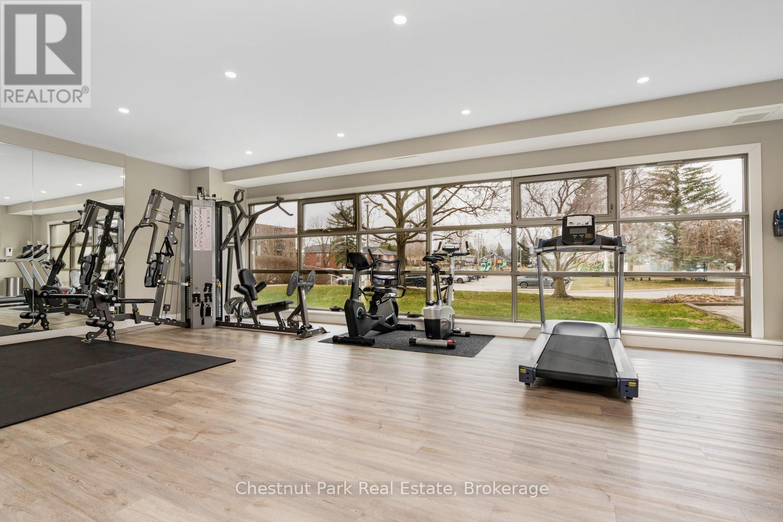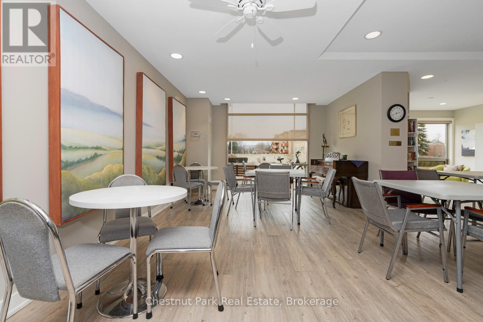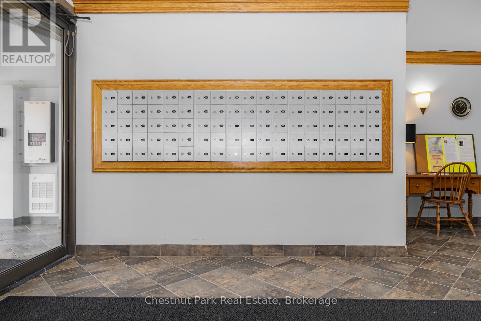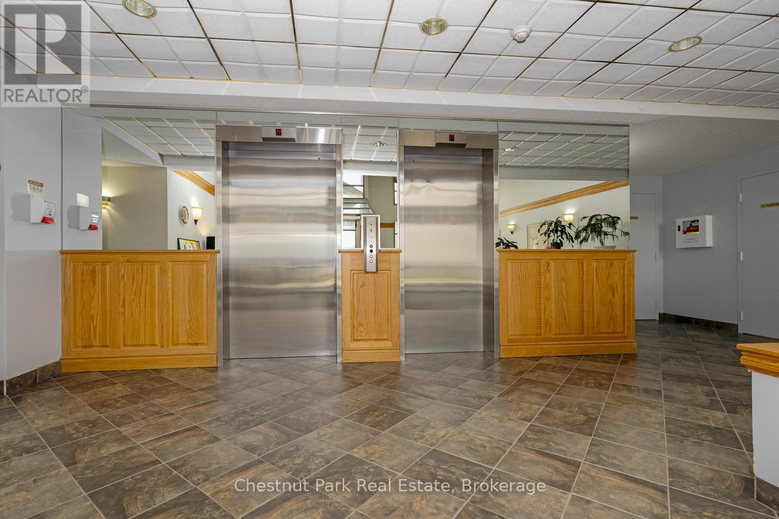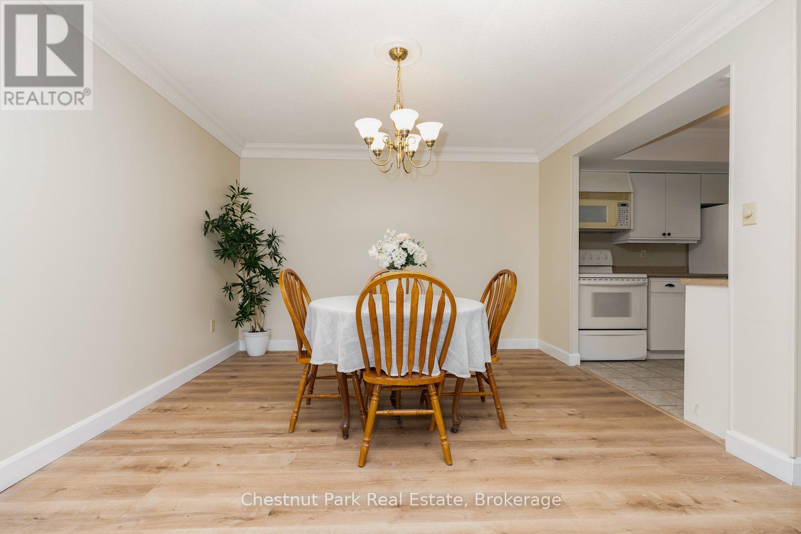 Bright and light 2 bedroom condo on the main floor in The Galleries. This west facing unit boasts ample space with over 1100 sqft; newly installed vinyl plank flooring; and freshly painted. Easy access to the secure front entrance with concierge service or keyless fob side entry to the building, no elevator is needed! Enjoy the convenience of main floor living, easy access to the sauna/fitness/games room, the social room/library, the guest suite (rental rates apply), and your locker. Your heated underground parking space #27 is conveniently located near your unit, access it using the stairs closest to your unit or the elevator just down the hall. Your condominium fees conveniently include heating, air conditioning, water and parking. The building is pet friendly for small pets. Located on the town bus route, giving you access to all in town amenities ~ downtown, shoppes, grocery stores, Georgian Bay, and a short drive to Blue Mountain Resort. This move in ready condominium offers something for everyone, comfort, convenience, and camaraderie! Enjoy the westerly sunshine and escarpment views from your new home. (id:64974)