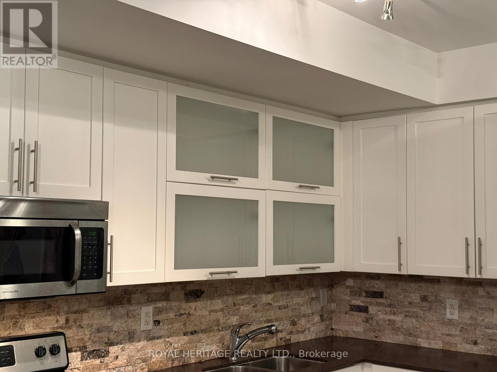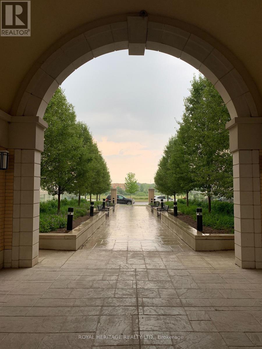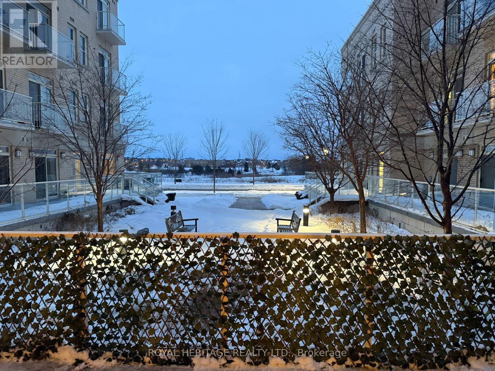 Discover a peaceful retreat in this beautifully maintained 4-storey boutique building - a rare main-floor suite that feels more like a private oasis than a condo. The moment you step inside, you're welcomed by 9-foot smooth ceilings and an open, airy layout that makes everyday living feel effortless. The open-concept kitchen is designed for both style and function, featuring granite countertops, an undermount sink, a modern backsplash, and seamless flow into the living area. Laminate flooring runs throughout, giving the space a clean, cohesive look. What truly sets this home apart is the massive 8 ft x 30 ft balcony - accessible through two sliding doors - overlooking serene greenspace and a tranquil pond. It's the kind of outdoor space that transforms your summer living: morning coffee in the sun, quiet reading in the afternoon, or unwinding in the evening with a peaceful view. The suite includes a spacious bedroom plus a separate den, perfect for working from home in comfort and privacy. Located just minutes from Highways 404 and 407, commuting is simple and convenient, while the surrounding neighborhoods offers everything you need close by. This is more than a place to live - it's a place to breathe, relax, and enjoy a setting that feels tucked away from the everyday rush. (id:64974)