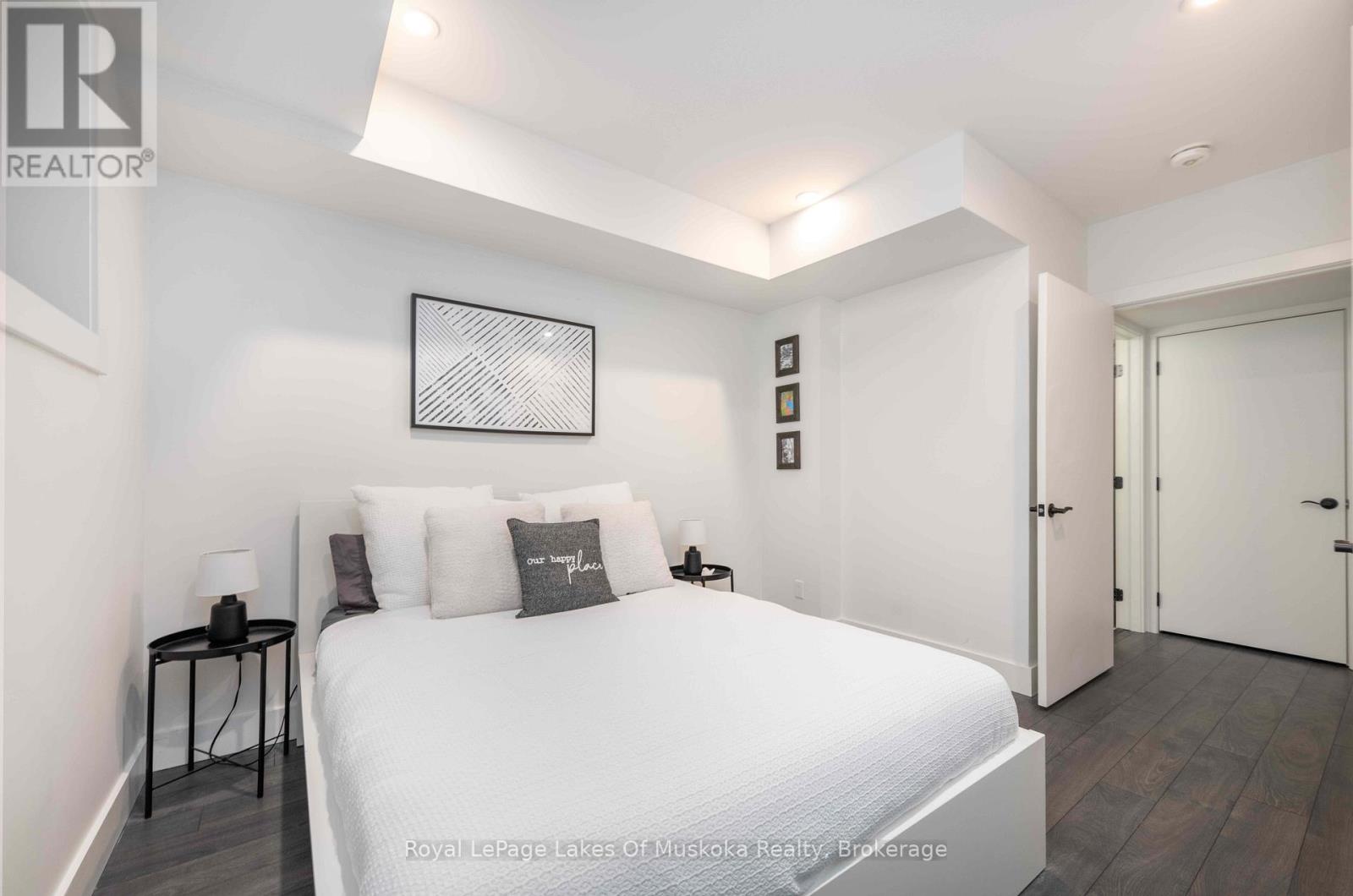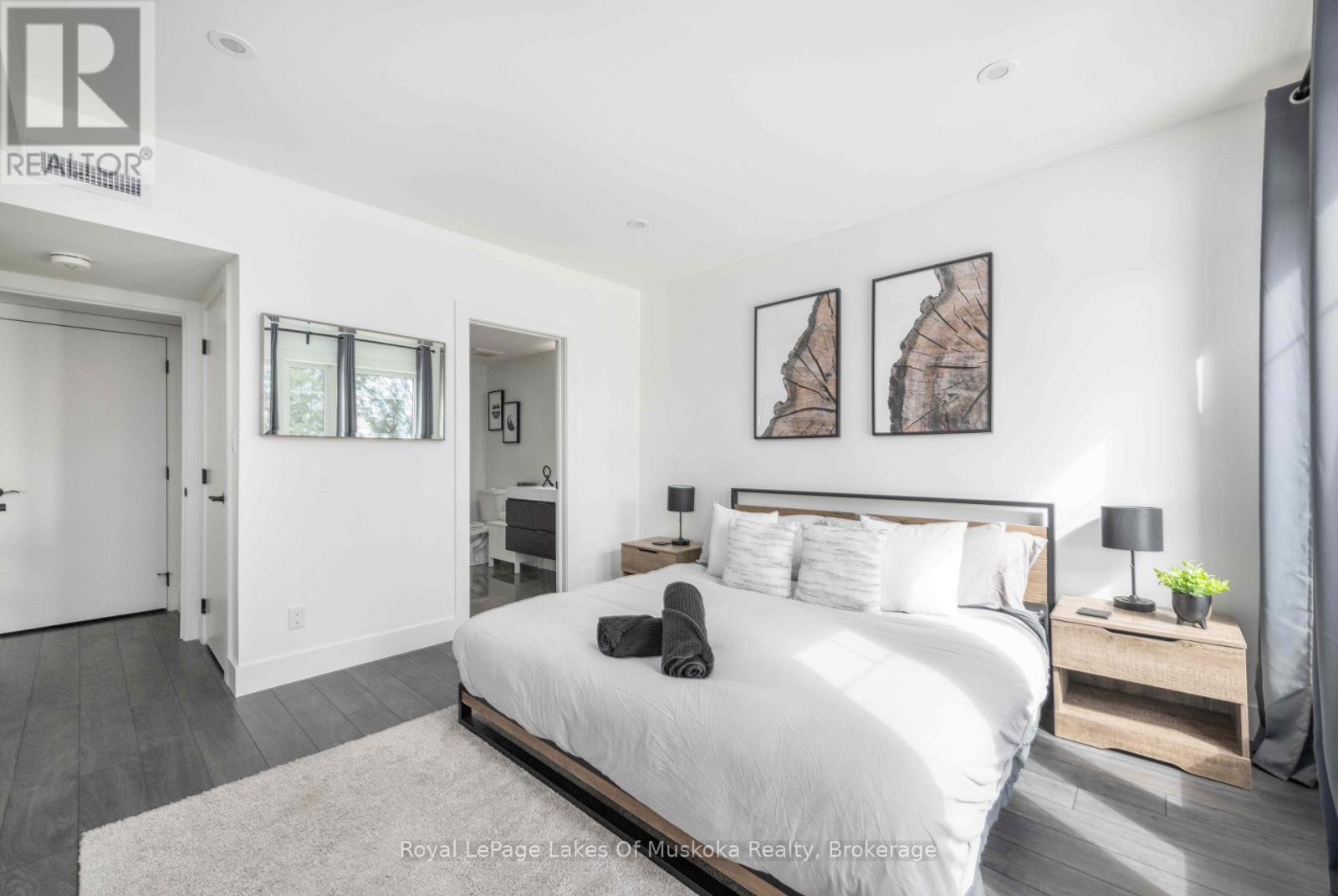 An incredible opportunity to own this beautiful condo built in 2019 and tucked within a private, quiet enclave in the heart of Huntsville's premier recreational area. Enjoy an exceptional lifestyle in this 2-bedroom, 2-bathroom condo featuring upscale finishes and a thoughtfully designed open-concept layout. The unit offers one set of stairs at the entry, with convenient single-level living thereafter and a walkout to the outdoors. Perfect for pet owners, the condo features durable high-end vinyl flooring and a walkout to your private ground-level patio overlooking a wall of trees. Designed for both comfort and style, the home includes in-floor heating, a cozy gas fireplace, glass shower in the ensuite, ample storage, and convenient in-suite laundry. Bright and sun-filled, the spacious layout is ideal for relaxing or entertaining after a day of skiing, golfing, boating, or exploring the outdoors. Enjoy quiet evenings on your patio while barbecuing or unwinding in nature. Owners have access to 300+ feet of sandy beachfront on beautiful Peninsula Lake-part of Huntsville's renowned 4-lake chain-complete with a beach volleyball court and playground. The property is located just down the street from Hidden Valley Highlands Ski Area, where the initiation fee is covered should you choose to become a member. The ski hill also offers extensive hiking and mountain biking trails throughout the spring, summer, and fall. Initiation fees are also covered at the nearby Mark O'Meara golf course, a prestigious ClubLink Platinum-level course. Ideally situated across the road from Deerhurst Resort on a quiet dead-end street, you can easily walk to restaurants, the beach, ski hill, mountain biking and hiking trails, and more.This is a fantastic low-maintenance option for a year-round residence or an alternative cottage retreat. This condo allows short term rentals and unit comes furnished and equipped. An inground pool is also planned for future construction on the property. (id:64974)