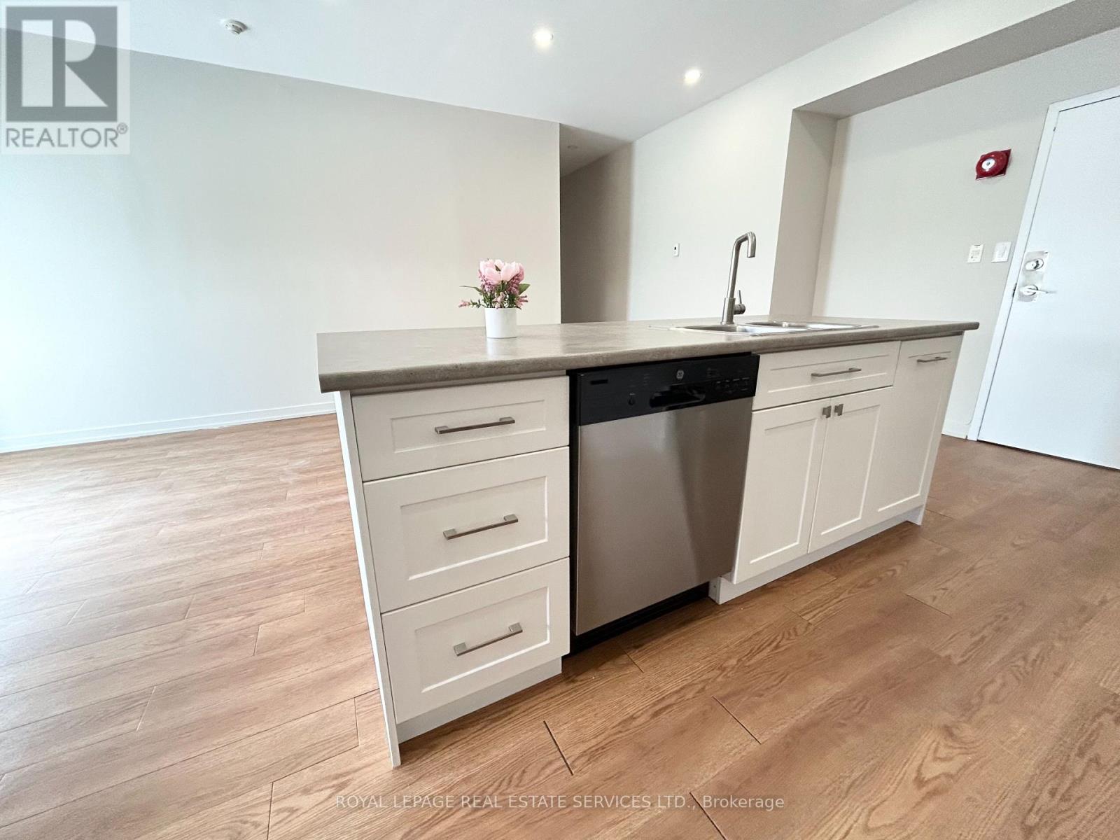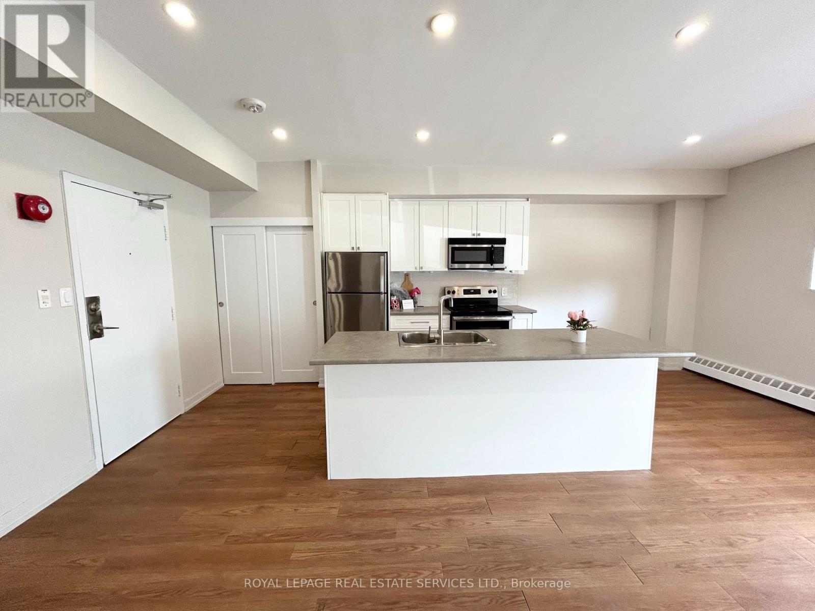**Welcome to Silvercreek Towers , Where Nature Meets Convenience** Nestled in a peaceful natural setting yet just minutes from the many amenities of Georgetown, Silvercreek Towers offers the perfect blend of tranquility and accessibility. This open concept ground floor suite boasts approximately 905 sqft of living space, featuring neutral paint throughout, updated flooring and high ceilings. The kitchen offers designer cabinetry with ample storage, 4 stainless steel appliances, modern backsplash, a double sink and generous breakfast island perfect for entertaining. Building Amenities Include: Fitness room, Community BBQ area, Gazebo with picnic space, Pet-friendly environment, Onsite laundry facilities, Covered parking available. With easy access to GO Train and GO Bus services, and within walking distance to downtown Georgetown, shops, restaurants, parks, and trails, Silvercreek Towers offers the best of both worlds: serene surroundings and urban convenience. This is more than just a suite, it's a place you will love to call home. (id:64974)