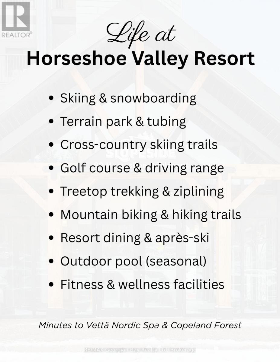 HERE'S WHY 102-80 HORSESHOE VALLEY ROAD COULD BE YOUR NEXT MOVE:- Room to live and breathe. With nearly 1,200 sq ft, 2 bedrooms plus a den, and 2 full bathrooms, this thoughtfully designed layout gives you the flexibility for full-time living, weekend escapes, or working from home.***COMFORT MEETS CHARM***The fireplace adds the perfect cozy touch, while walk-outs to the balcony offer a peaceful place to relax and unwind.-***LOW-MAINTENANCE EASY LIVING*** Condo ownership means no exterior upkeep - just more time to enjoy everything this four-season community has to offer.***A LIFESTYLE LOCATION***. Set on the grounds of Horseshoe Resort with immmediate access to hiking, golf, skiing, and very close the renowned Vettä Nordic Spa, this is where everyday living feels like a getaway.-***FLEXIBILITY FOR YOUR FUTURE***Whether for personal use or with the potential to participate in the resort rental program, this is a smart move in more ways than one. (id:64974)