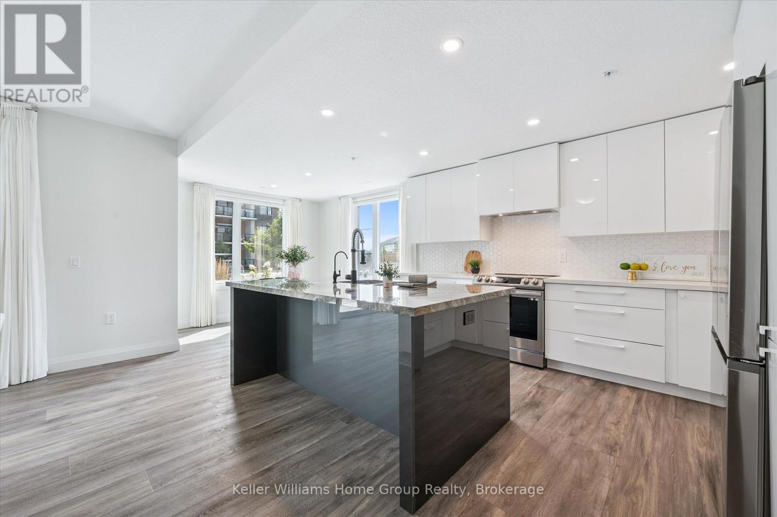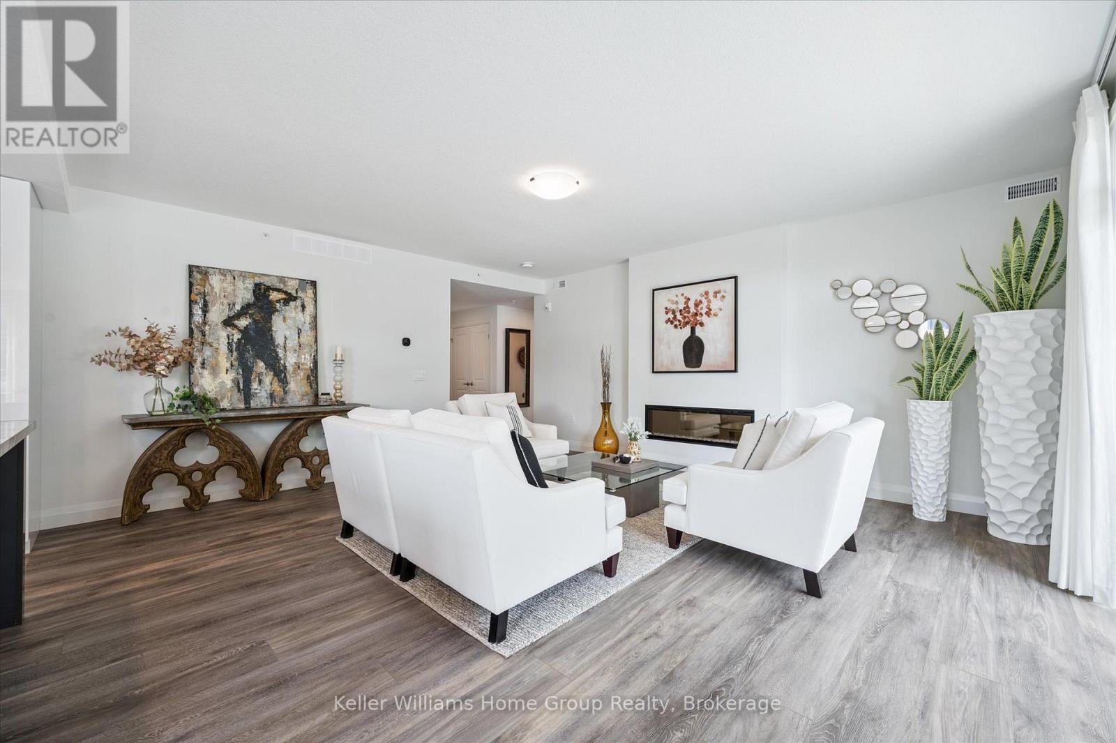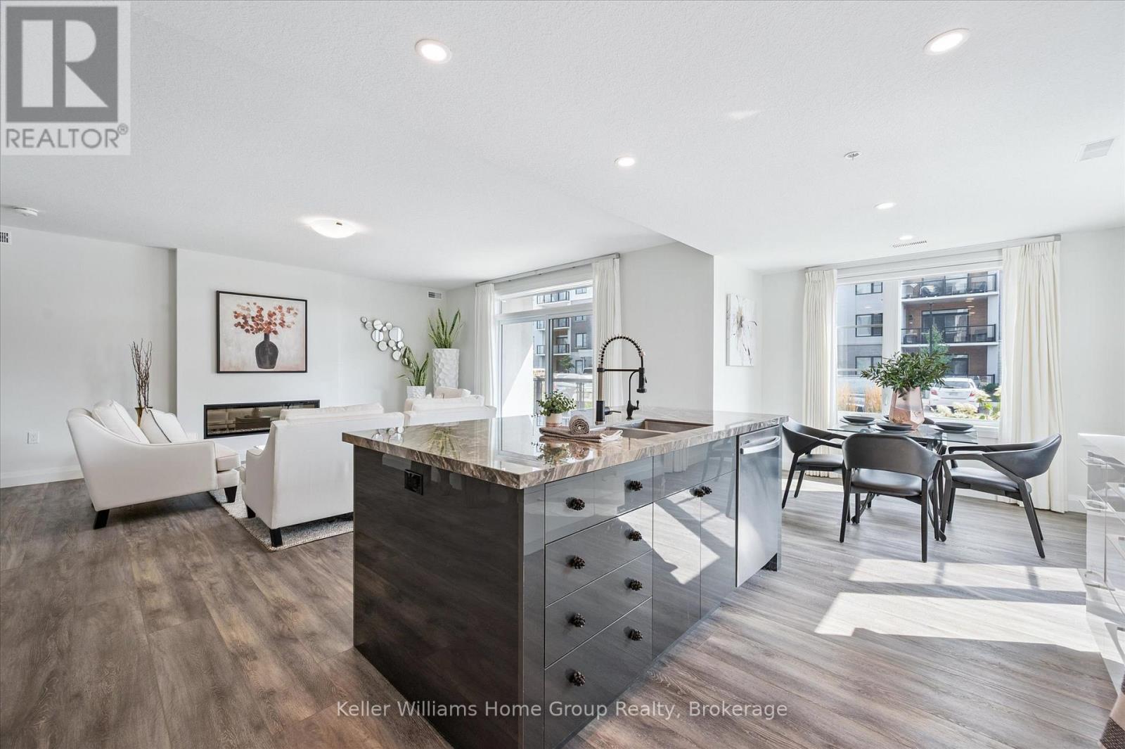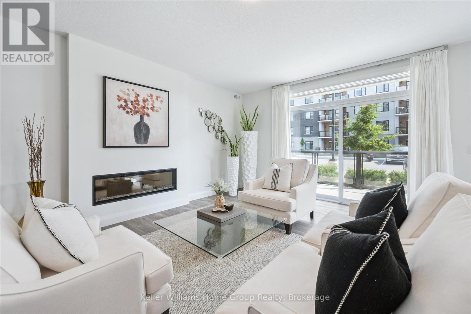 Welcome to elevated living in this stunning corner unit condo, offering over 1,300 square feet of thoughtfully designed space. Built in 2022 by Keating Construction, this 2-bedroom, 2-bathroom ground-floor home combines upscale finishes with everyday comfort in a layout that's both functional and elegant. Natural light floods the open-concept living area, where a striking modern electric fireplace creates a cozy yet contemporary focal point. The designer kitchen is a true show stopper featuring upgraded cabinetry, sleek surfaces, and premium fixtures that make cooking and entertaining a pleasure. Enjoy the added luxury of automatic blinds and custom drapery throughout, bringing style and ease to every room. The spacious primary suite includes a well-appointed en-suite and generous closet space, while the second bedroom offers flexible use for guests or a home office. With direct ground-floor access and a private balcony perfect for your morning coffee, this condo is ideal for those seeking low-maintenance, high-quality living. Whether you're downsizing, investing, or purchasing your first home, this exceptional unit offers modern flair, convenience, and lasting value in a vibrant community. (id:64974)