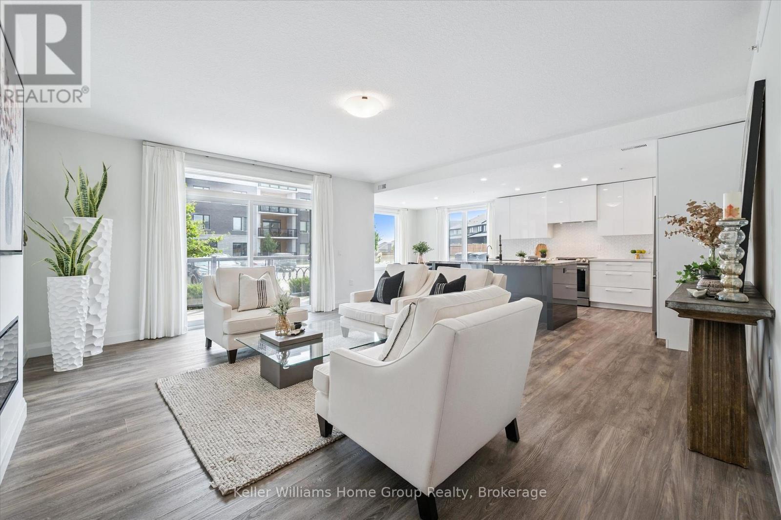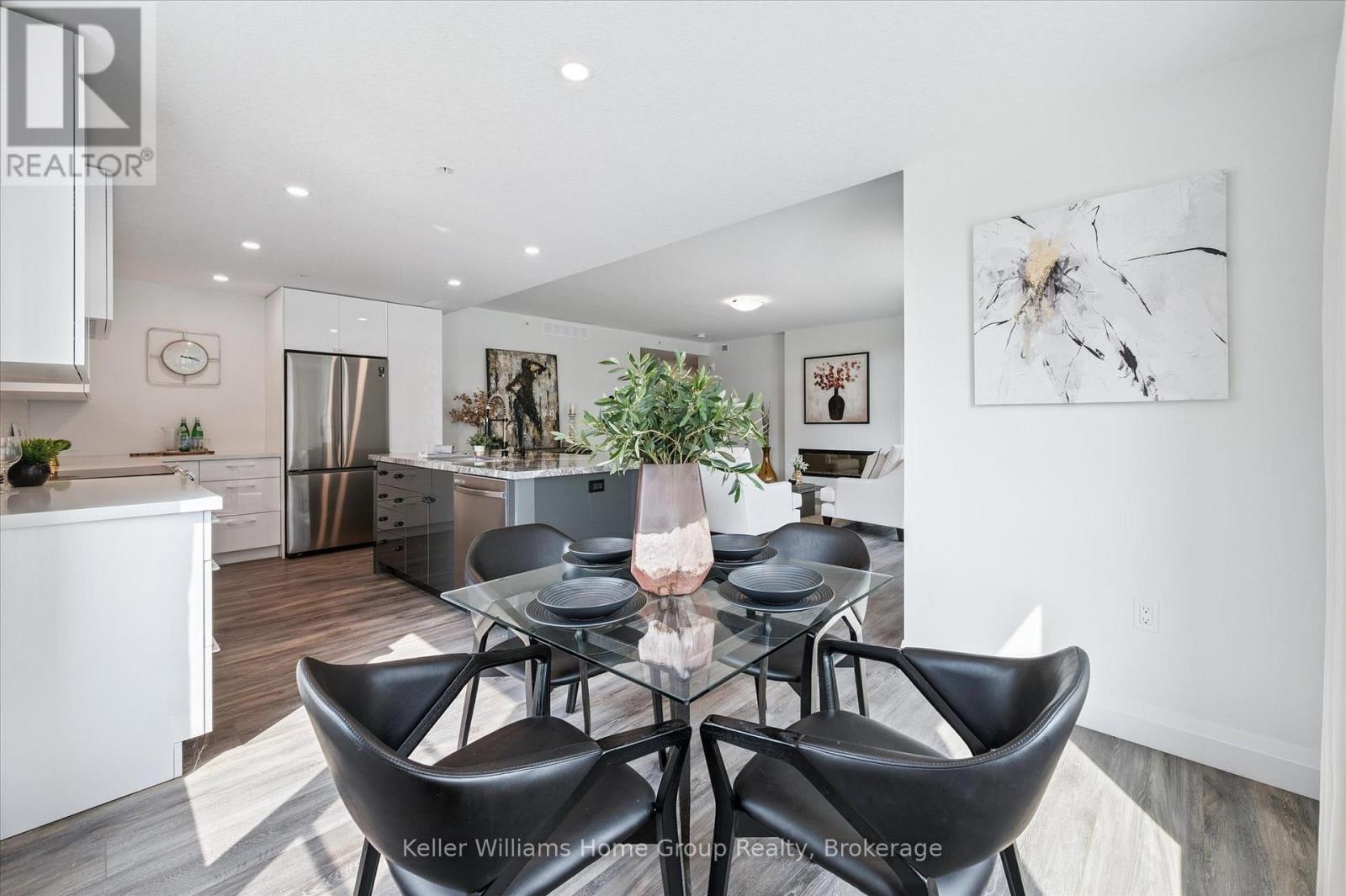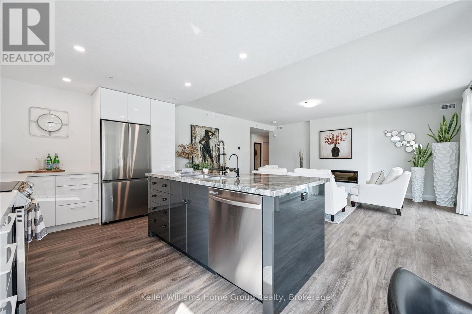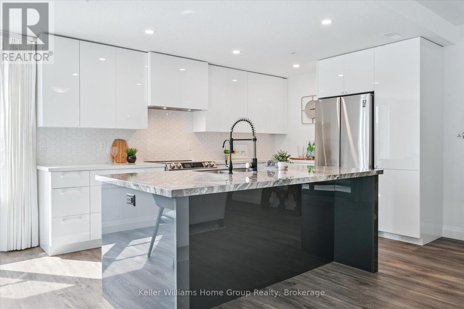 Welcome to elevated living in this stunning corner unit condo, offering over 1,300 square feet of thoughtfully designed space. Built in 2022 by Keating Construction, this 2-bedroom, 2-bathroom ground-floor home combines upscale finishes with everyday comfort in a layout that's both functional and elegant. Natural light floods the open-concept living area, where a striking modern electric fireplace creates a cozy yet contemporary focal point. The designer kitchen is a true show stopper featuring upgraded cabinetry, sleek surfaces, and premium fixtures that make cooking and entertaining a pleasure. Enjoy the added luxury of automatic blinds and custom drapery throughout, bringing style and ease to every room. The spacious primary suite includes a well-appointed en-suite and generous closet space, while the second bedroom offers flexible use for guests or a home office. With direct ground-floor access and a private balcony perfect for your morning coffee, this condo is ideal for those seeking low-maintenance, high-quality living. Whether you're downsizing, investing, or purchasing your first home, this exceptional unit offers modern flair, convenience, and lasting value in a vibrant community. (id:64974)