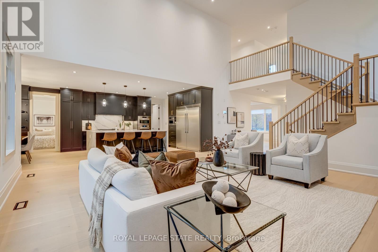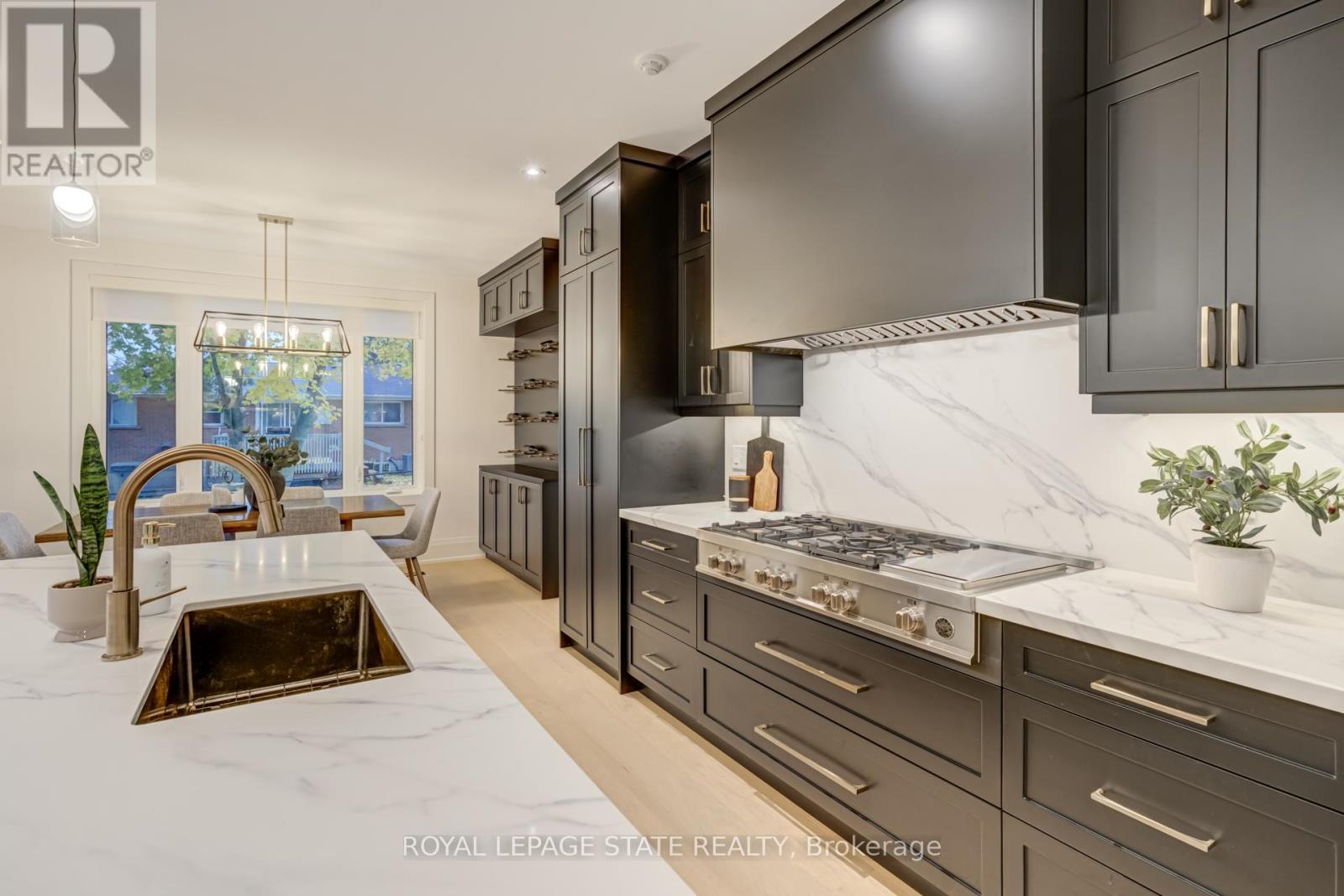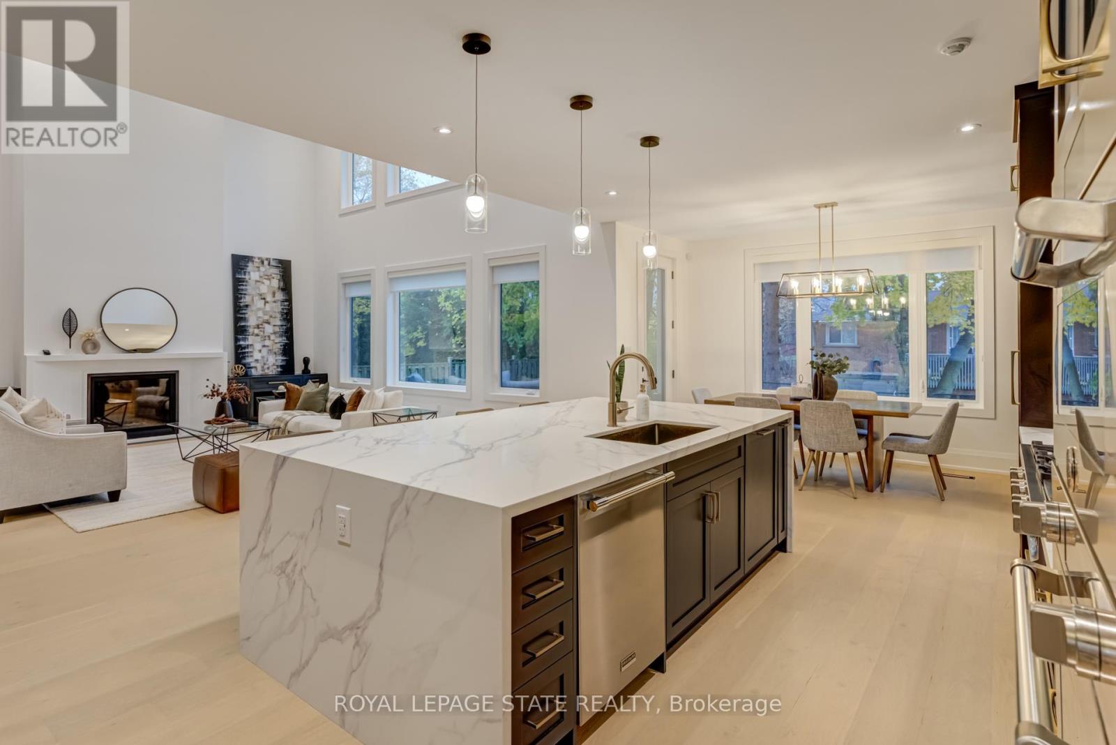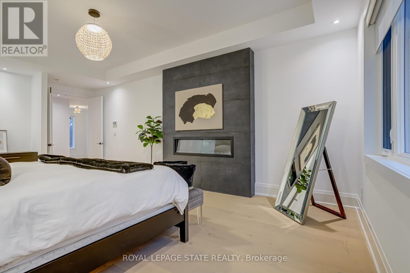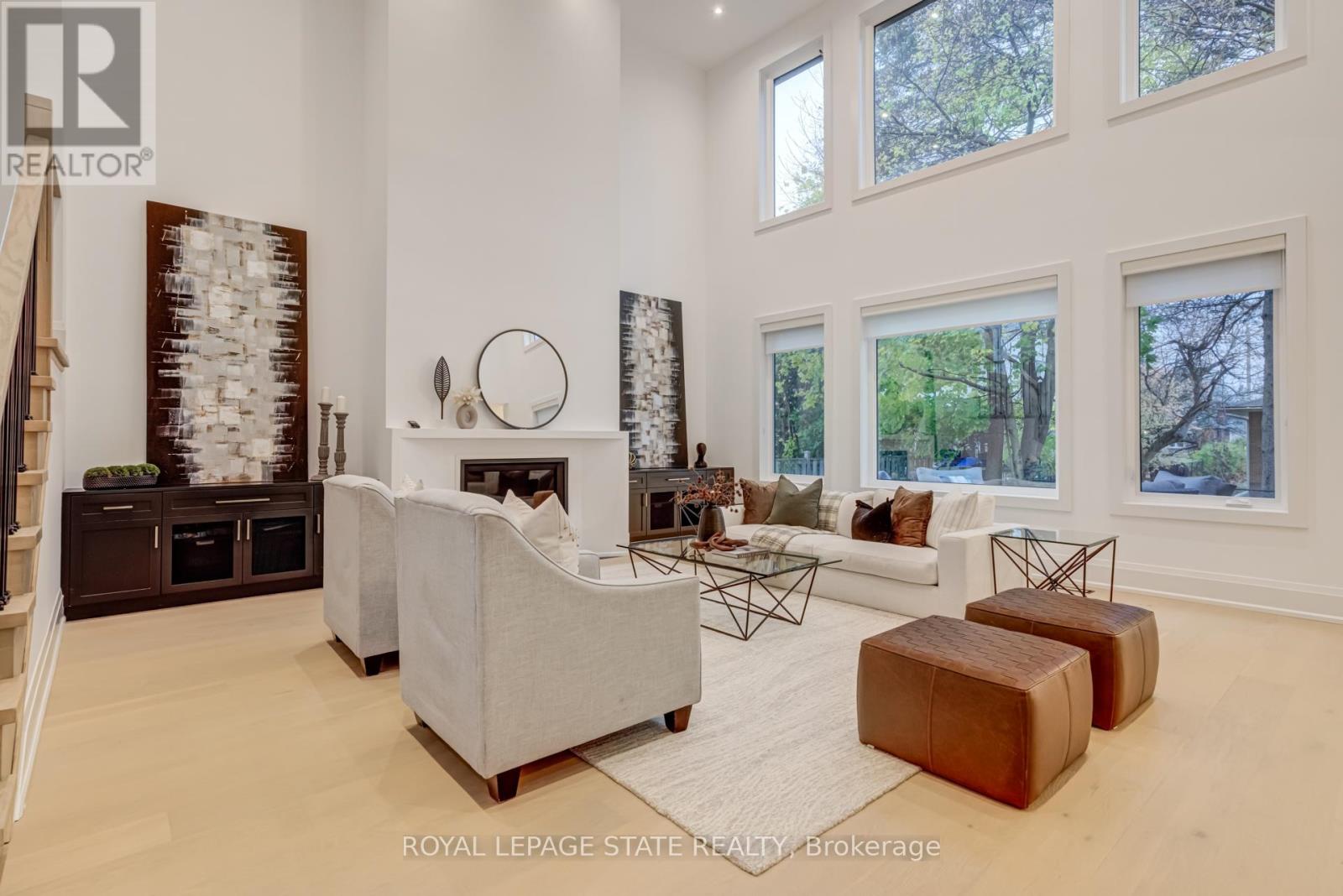 Crafted with exceptional attention to detail and completed in 2025 (Tarion warranty), this custom two-storey luxury home offers nearly 6,000 sqft. of finished living, 5+1 bedrooms, 6 total baths, and a contemporary transitional design blending sophistication with family-friendly functionality. Situated on a 75 x 105 ft lot in Ancaster's Nakoma neighbourhood, it features striking curb appeal with a stone-and-stucco exterior and a 2.5-car triple tandem garage. Inside, soaring 9 ft ceilings on all three levels, wide-plank white oak hardwood, 8 ft solid core doors, 9 baseboards, and oversized windows create a sense of grandeur. The 19-ft great room showcases floor-to-ceiling windows and a 42 gas fireplace flanked by custom cabinetry. A main-floor office with built-ins, formal dining room, and powder room provide elegant, purposeful spaces, while the dining table converts into a pool table for dual-purpose entertaining. The gourmet kitchen features black cabinetry, a 9' x 5' waterfall quartz island, full-slab quartz backsplash, champagne and honey bronze fixtures, Bertazzoni appliances, and a walk-in pantry and servery with black stainless-steel sink. Adjacent are the mudroom/laundry with garage entry and a main-level bedroom with ensuite. Upstairs, four bedrooms each have ensuite access, including a primary retreat with 10 ft tray ceiling, oversized walk-in closet, linear fireplace, and spa-inspired 5-piece ensuite with heated floors. The finished lower level offers 9 ft ceilings, oversized windows, sixth bedroom, full bathroom, linear fireplace, and endless possibilities. Additional features include radon mitigation, 200-amp service, hardwired security system, and DryCore subfloor. Outside, the back patio provides a starting point for a dream outdoor space, with a pre-approved building permit for an in-ground pool and gas lines for BBQ. Centrally located, this home offers walkability to schools, parks, shops, and quick access to Hwy 403. (See full list of features.) (id:64974)