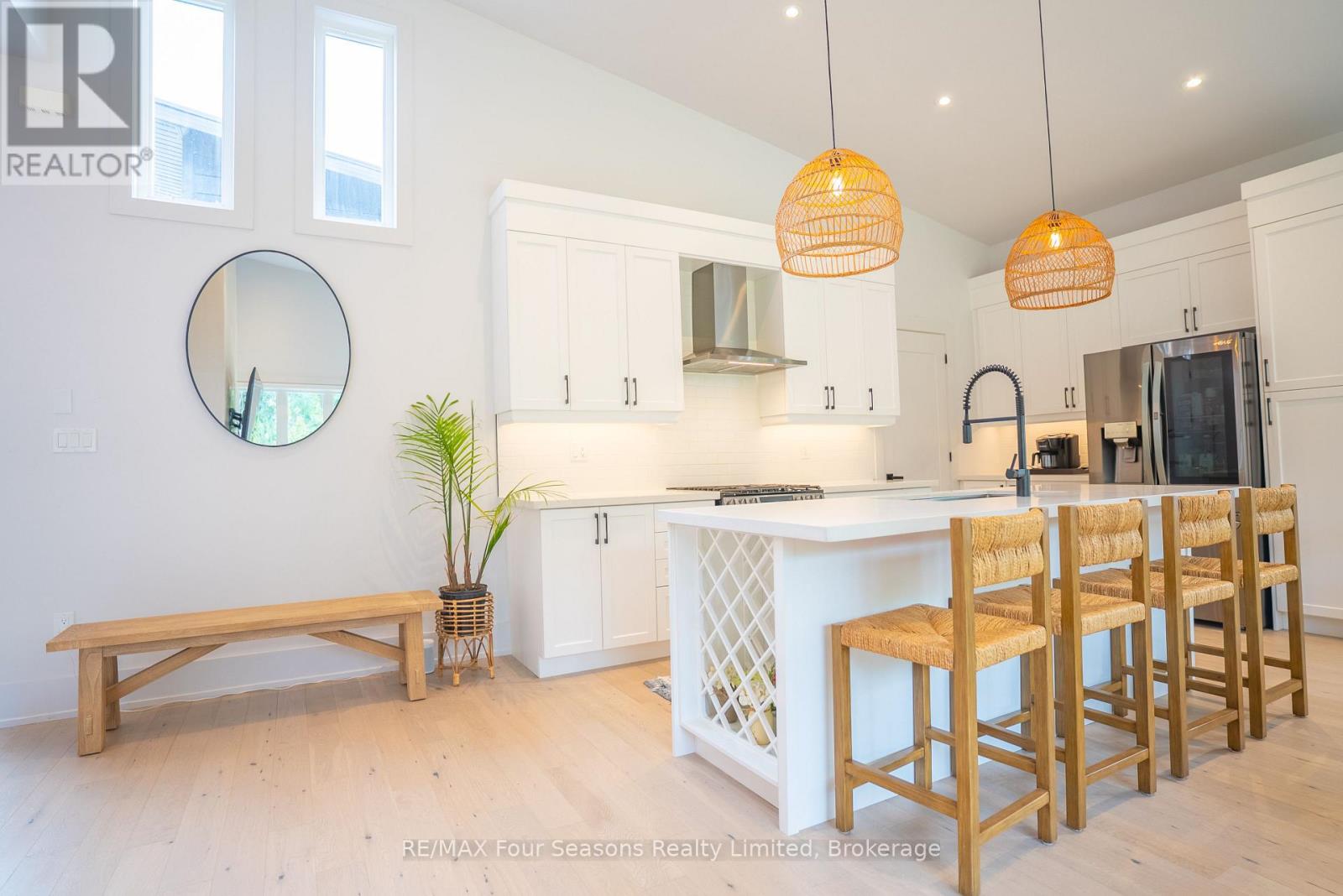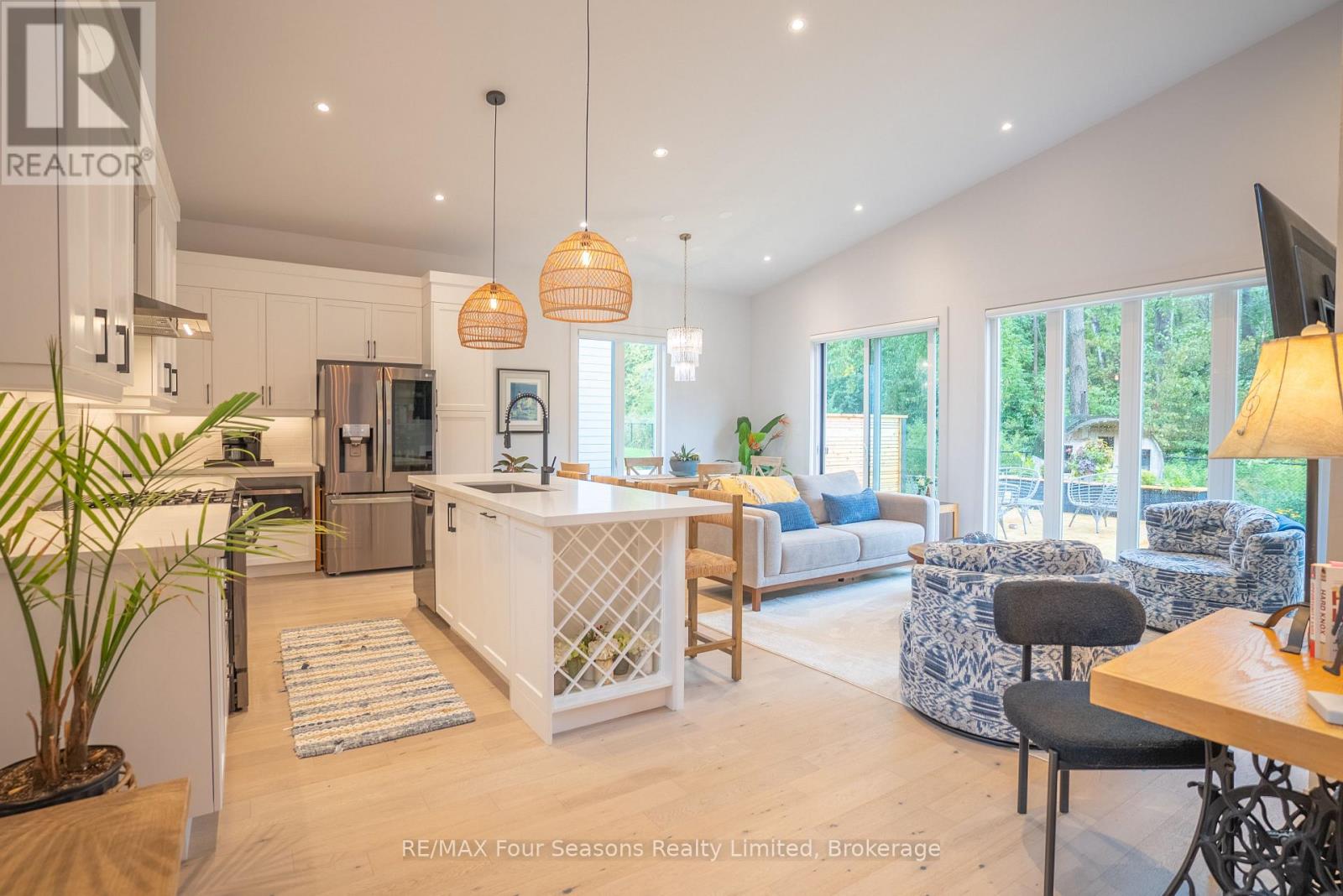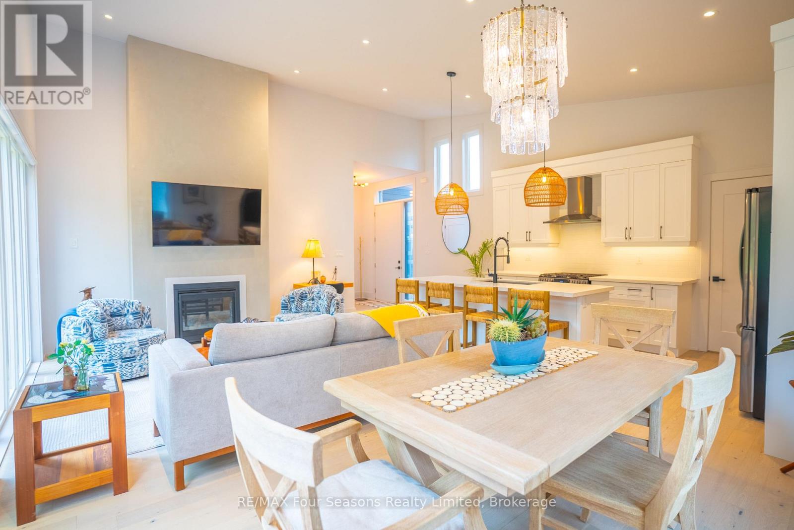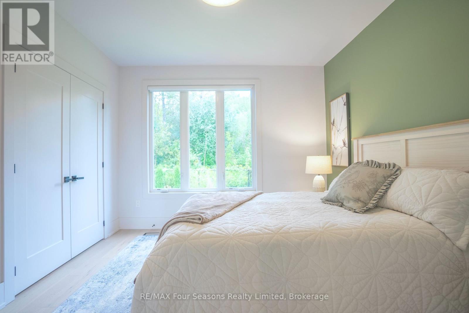 Welcome to a beautifully designed bungalow that blends refined elegance with the ultimate outdoor lifestyle. Perfectly situated for easy access to nature, adventure, and the charm between Collingwood and Thornbury. This home is more than a residence, it's a statement in sophisticated living. Inside, white oak hardwood floors flow throughout the light-filled main level, highlighted by soaring vaulted ceilings and expansive windows that bring the outdoors in. The chef-inspired kitchen is both stylish and functional, featuring a sleek breakfast bar with stone countertops, a premium gas range, and top-tier appliances. Unwind in the serene main-floor primary suite, where tranquil forest views create a true retreat. The spa-like ensuite includes double sinks, a glass shower, and a deep soaker tub, perfect for relaxing after a day on the trails or slopes. A cozy gas fireplace with a custom Venetian plaster surround anchors the living space, ideal for quiet evenings or casual entertaining. The main level also features a bright second bedroom, a powder room, a well-appointed laundry area, and a mudroom with direct access to the heated double garage finished with R12 insulated doors and premium epoxy flooring, ideal for a home gym or workshop. The fully finished basement offers plenty of space for guests or extended family, with a large west-facing great room, a spacious third bedroom, and a full bath with double sinks and a glass shower. Outside, enjoy sunset views from your private, west-facing yard complete with a gorgeous deck, lush landscaping, modern storage shed, and a full irrigation system. A custom stone-surround driveway completes the picture. Just steps from a sandy beach and the Georgian Trail, this location is unbeatable. Bike into town for coffee and shopping, or explore nearby golf courses, wineries, and ski hills. This exceptional home offers the perfect balance of luxury, comfort, and location, a rare find in todays market. (id:64974)