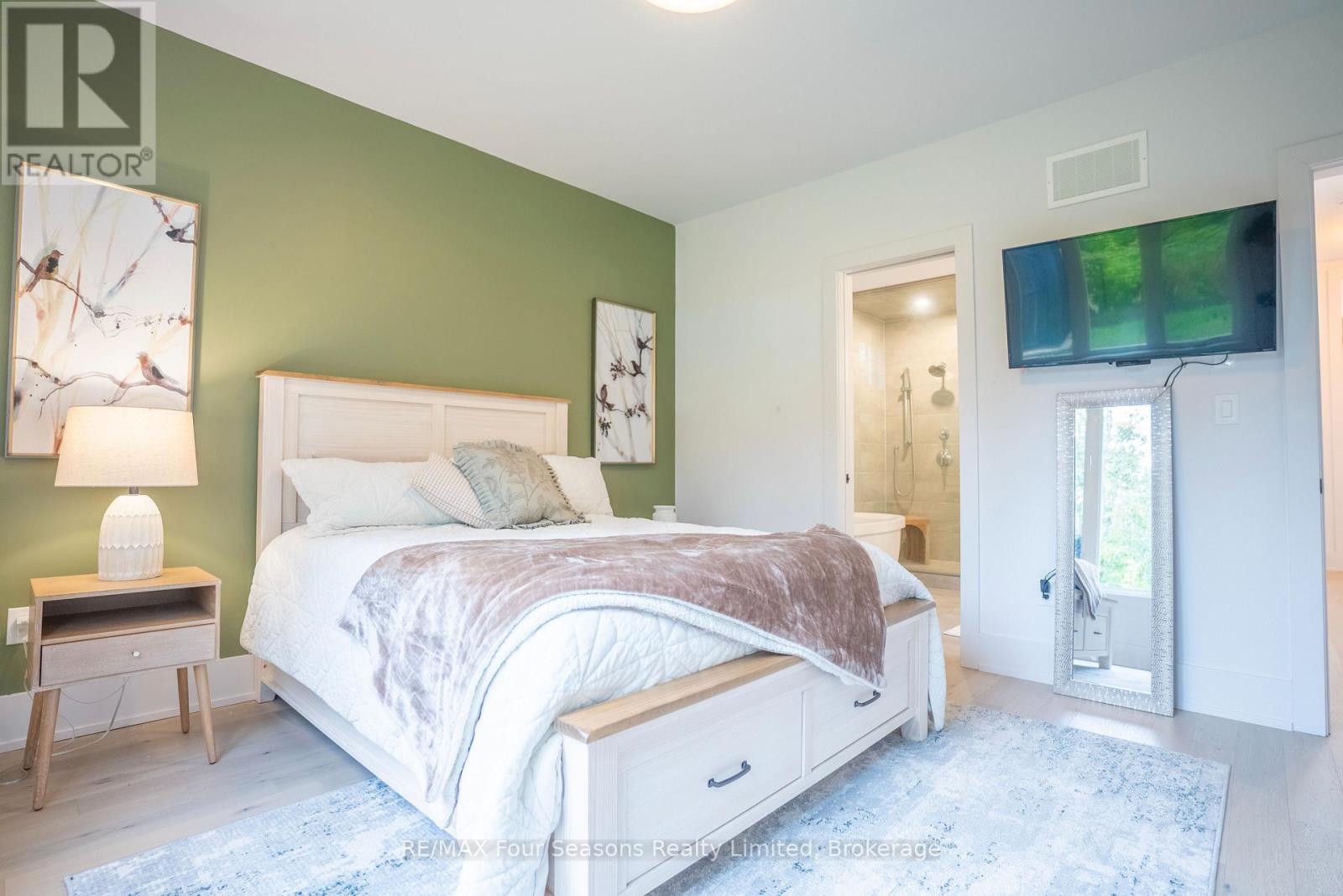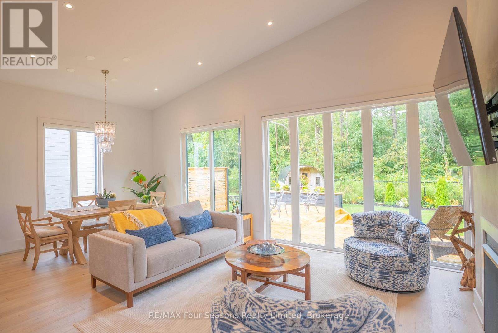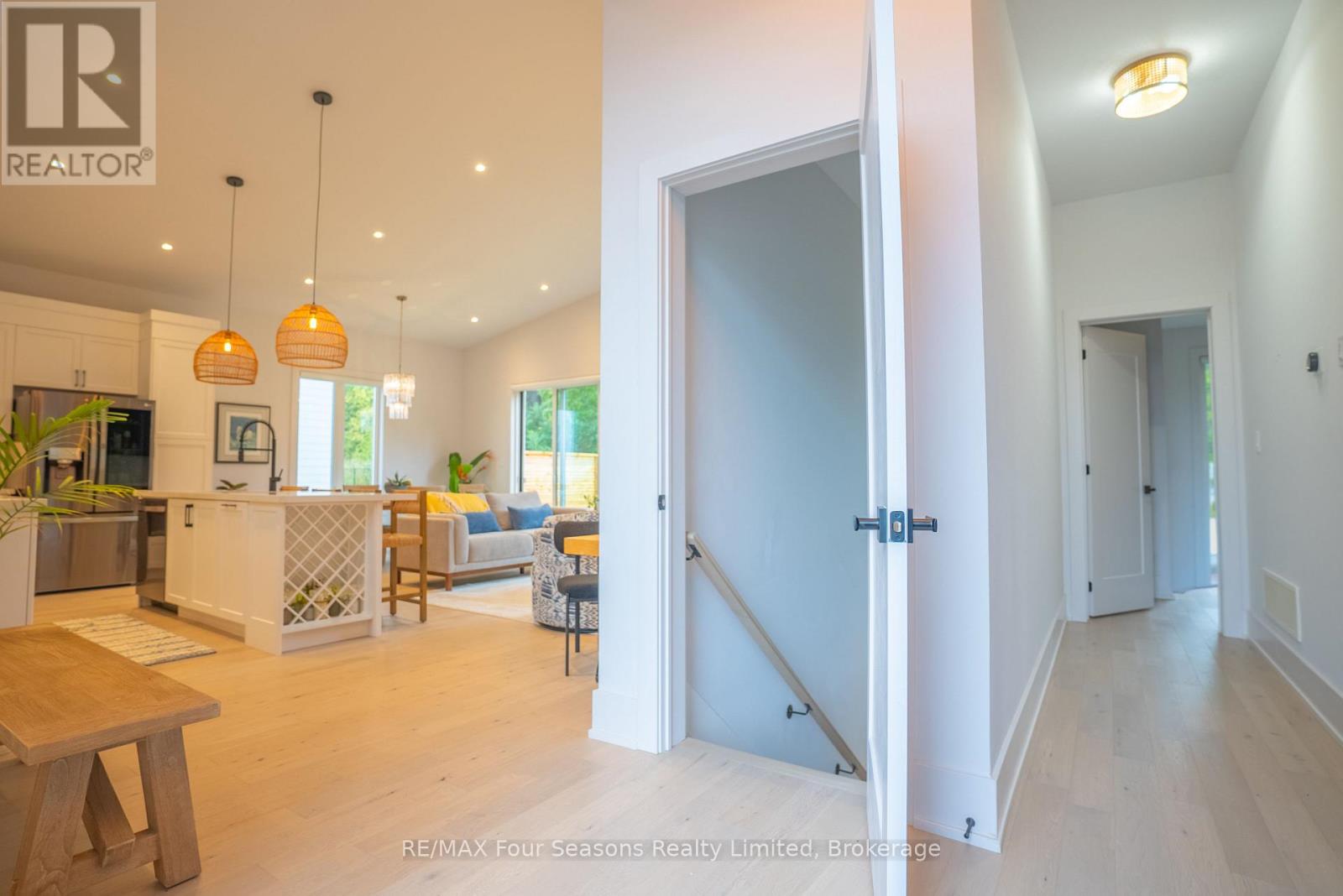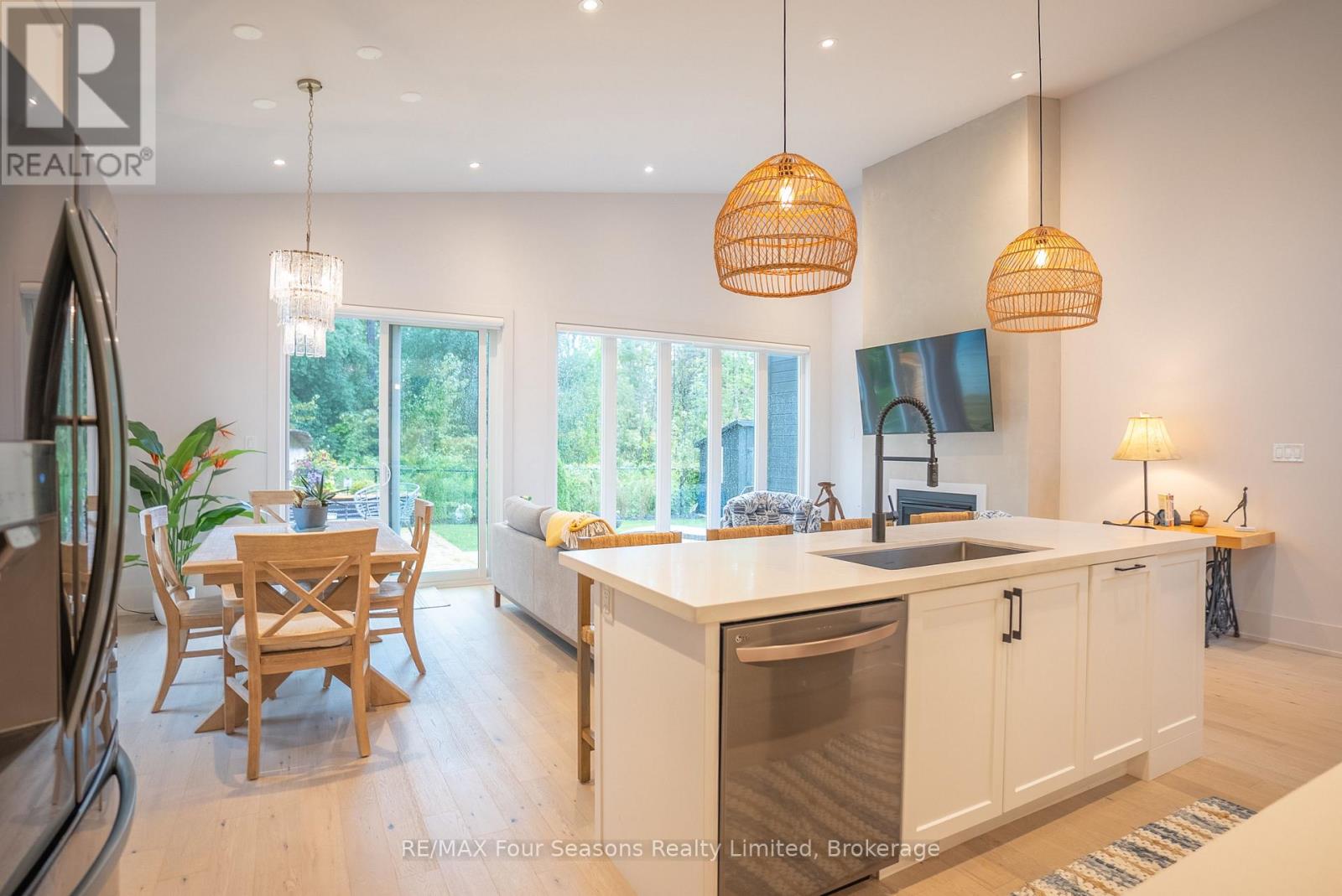 Welcome to a beautifully designed bungalow that blends refined elegance with the ultimate outdoor lifestyle. Perfectly situated for easy access to nature, adventure, and the charm between Collingwood and Thornbury. This home is more than a residence, it's a statement in sophisticated living. Inside, white oak hardwood floors flow throughout the light-filled main level, highlighted by soaring vaulted ceilings and expansive windows that bring the outdoors in. The chef-inspired kitchen is both stylish and functional, featuring a sleek breakfast bar with stone countertops, a premium gas range, and top-tier appliances. Unwind in the serene main-floor primary suite, where tranquil forest views create a true retreat. The spa-like ensuite includes double sinks, a glass shower, and a deep soaker tub, perfect for relaxing after a day on the trails or slopes. A cozy gas fireplace with a custom Venetian plaster surround anchors the living space, ideal for quiet evenings or casual entertaining. The main level also features a bright second bedroom, a powder room, a well-appointed laundry area, and a mudroom with direct access to the heated double garage finished with R12 insulated doors and premium epoxy flooring, ideal for a home gym or workshop. The fully finished basement offers plenty of space for guests or extended family, with a large west-facing great room, a spacious third bedroom, and a full bath with double sinks and a glass shower. Outside, enjoy sunset views from your private, west-facing yard complete with a gorgeous deck, lush landscaping, modern storage shed, and a full irrigation system. A custom stone-surround driveway completes the picture. Just steps from a sandy beach and the Georgian Trail, this location is unbeatable. Bike into town for coffee and shopping, or explore nearby golf courses, wineries, and ski hills. This exceptional home offers the perfect balance of luxury, comfort, and location, a rare find in todays market. (id:64974)