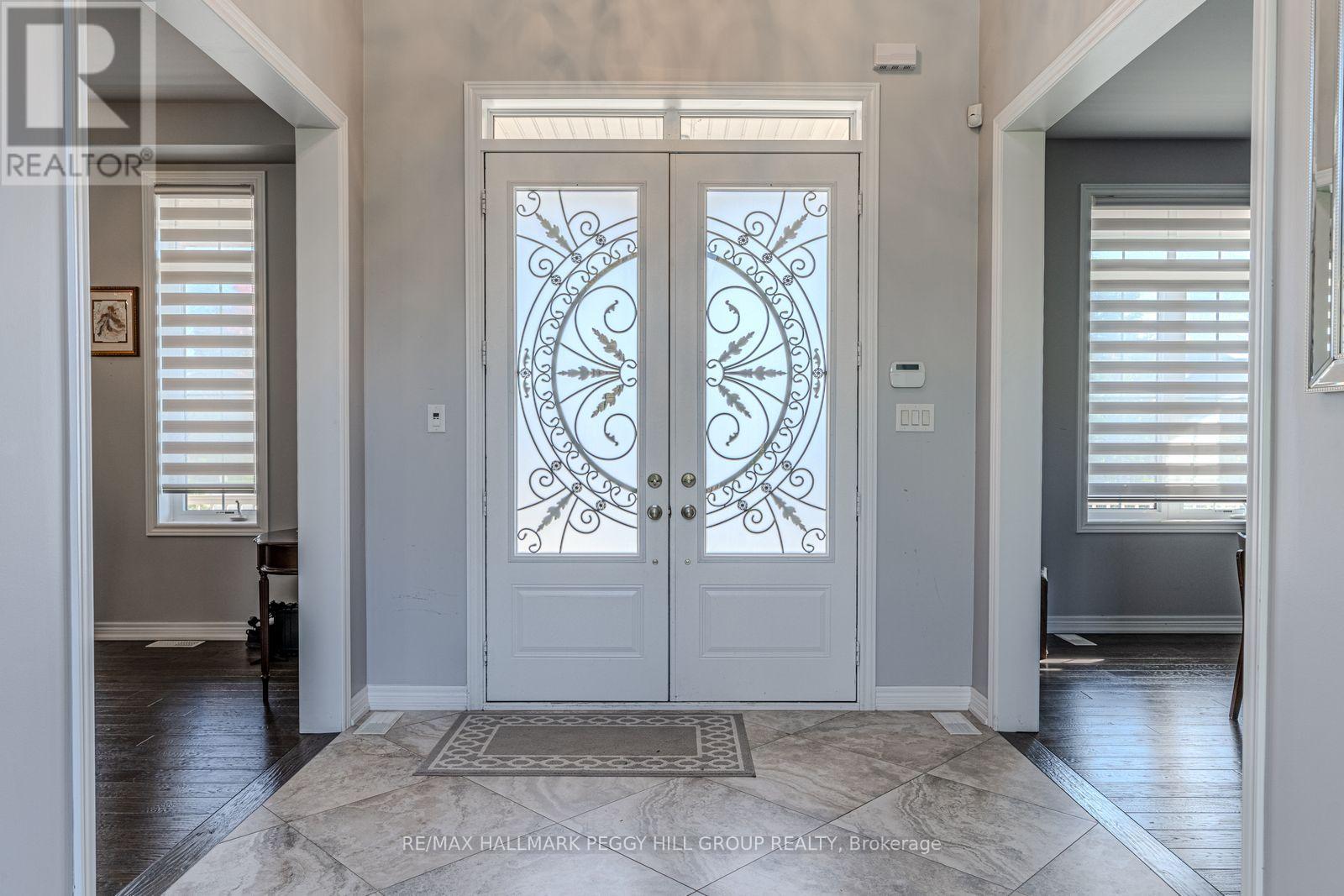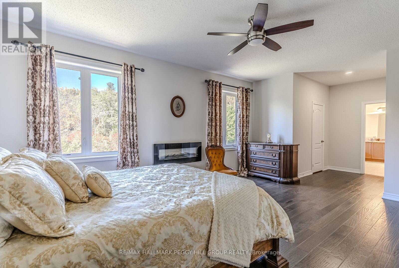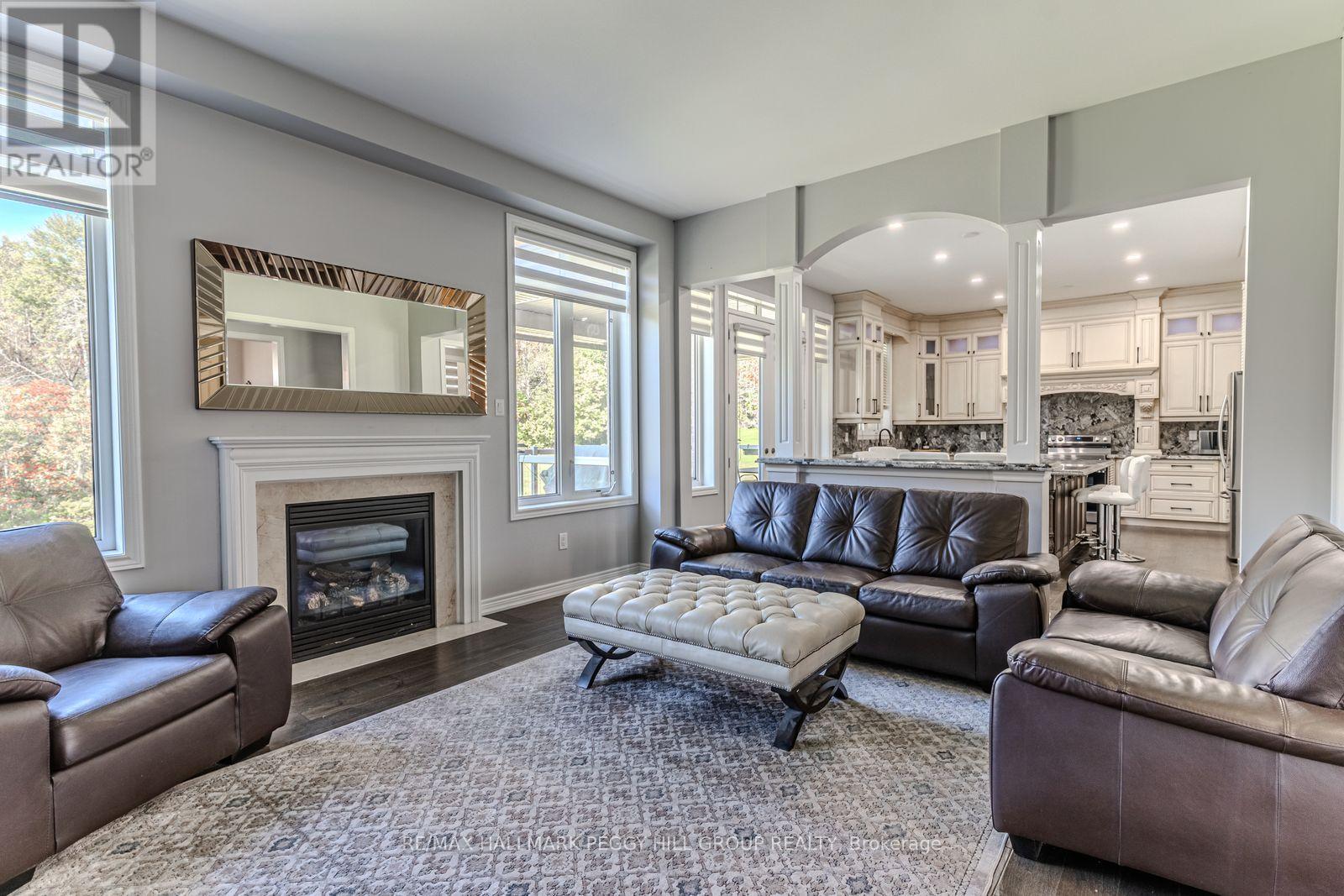 ESTATE HOME SHOWCASING OVER 5,100 SQ FT, IN-LAW POTENTIAL, LUXURIOUS FINISHES, TRIPLE GARAGE, & 2.33-ACRE LOT! Set on a prestigious 2.33-acre estate in The Shires Estates, Bradford's most distinguished country estate community inspired by the timeless charm of the English countryside, this stately all-brick home offers over 5,100 finished square feet of refined living. The impressive exterior showcases a circular driveway, a covered front porch with double doors, soffit lighting, and a triple garage with inside entry. A 20-foot cathedral ceiling, floor-to-ceiling windows, and a grand spiral staircase create a striking first impression, while 10-ft ceilings on the main level and 9-ft ceilings on the upper and lower levels enhance the home's scale. The custom kitchen features granite countertops, a large island, custom cabinetry topped with crown moulding, tile backsplash, stainless steel appliances, and a walkout to the deck. The main level also offers hardwood floors, a formal dining room, a living room with a gas fireplace and built-in cabinetry, two dens, and a laundry room. The generous primary bedroom showcases dual walk-in closets and a 5-piece ensuite with a soaker tub, glass-walled shower, dual vanity, and water closet, while three additional bedrooms feature private or shared ensuite access. The walkout basement provides excellent in-law capability with a kitchen boasting quartz countertops, an island, stainless steel appliances, a large rec room, two bedrooms, two full bathrooms, laundry, and a cantina. Backing onto a ravine with towering trees offering privacy, complete with a covered composite deck with glass railings, a lower-level patio, and an irrigation system. Additional highlights include a drilled well, water softener, filters, UV, reverse osmosis, HRV, high-efficiency furnace, central air conditioning, central vac, and a 200-amp electrical panel. A #HomeToStay of distinction where craftsmanship, scale, and setting exceed expectations. (id:64974)