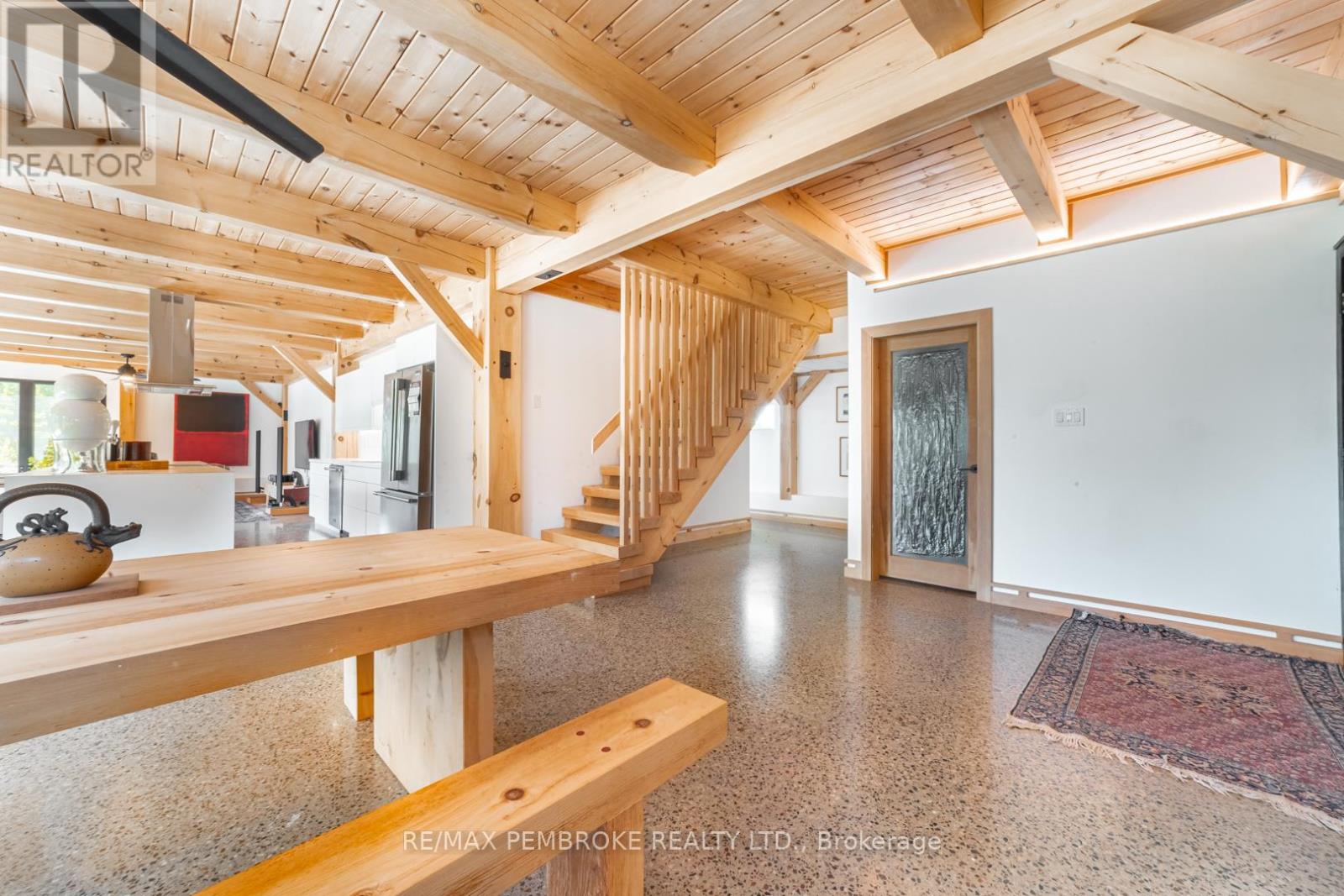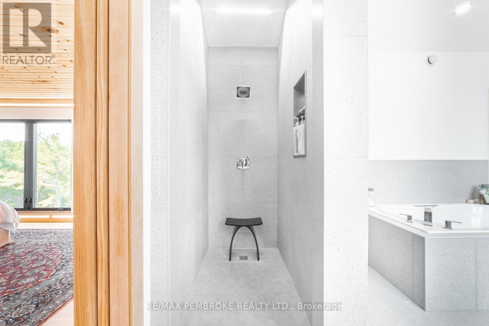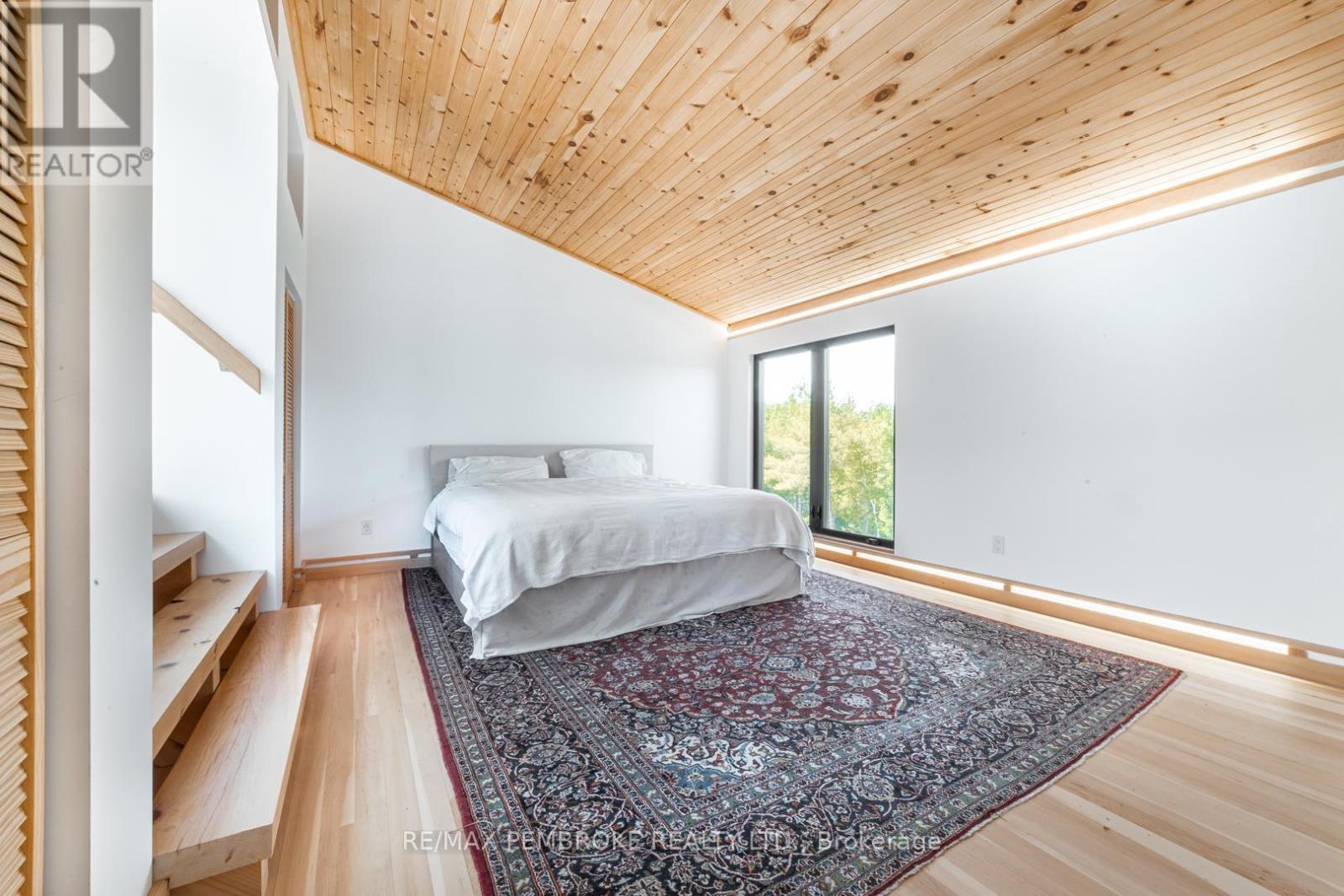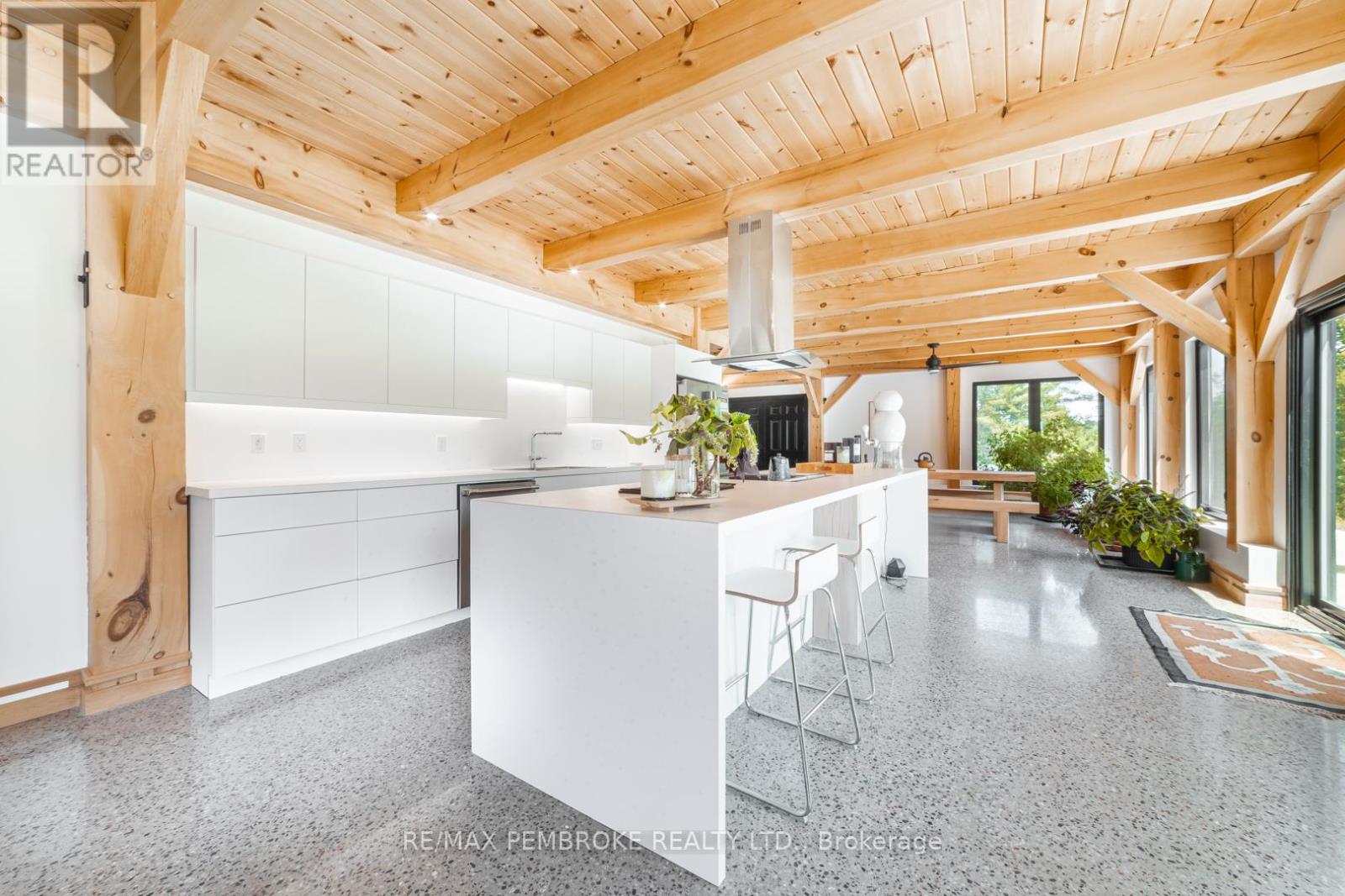 This Scandinavian style chalet is perched atop the rugged Canadian Shield offering sweeping views of the tree tops and glimpses of the Petawawa River. Walk in the door and be awed by the natural light flooding in, seamlessly blending the outside with the inside. Masterful craftsmanship of the post and beam construction done by John R. MacDonald from Algonquin Timberframe. Polished concrete floors, in-floor heating, amazing pine staircase and floor to ceiling windows all give the feeling of being in a spa! The kitchen offers a 12' island with seamless white cabinetry, soft closures and stainless steel appliances. There are 2 primary suites offering attached spa like baths (1 on the main floor and 1 on the 2nd floor). Mud room area with loads of closet space and a main floor laundry. Make your way to the 2nd floor where you will find 2 good sized bedrooms with unique access to the large deck. The 2nd floor deck is private and a relaxing area great for yoga or entertaining and even has its own outdoor shower. The deck has a glass balustrade and waterproof Goodyear membrane. The bedrooms each have energy-efficient heat pumps with AC. This style and location of home is perfect for the outdoor enthusiast and offers easy access to Highway 17 for commuting to CNL, Garrison Petawawa or into Pembroke. (id:64974)