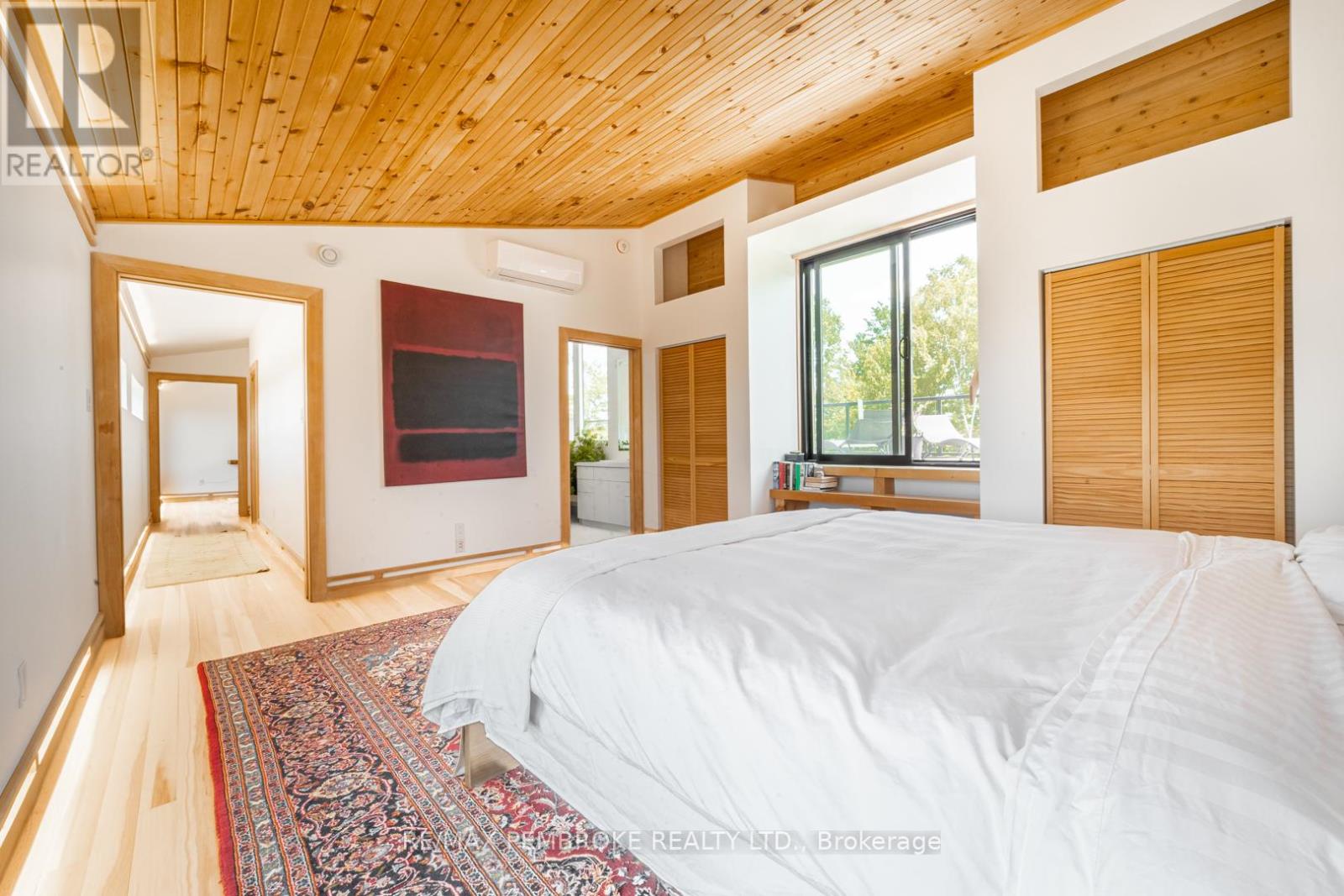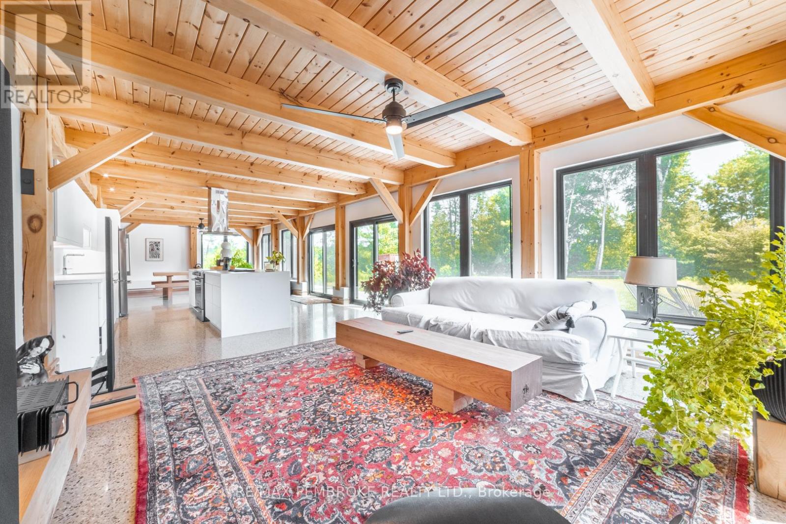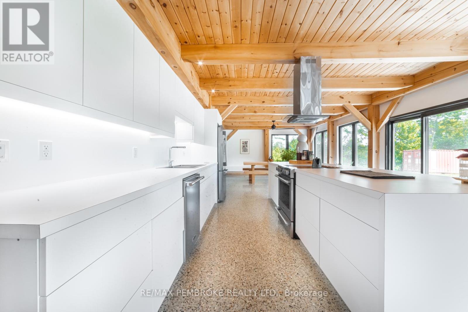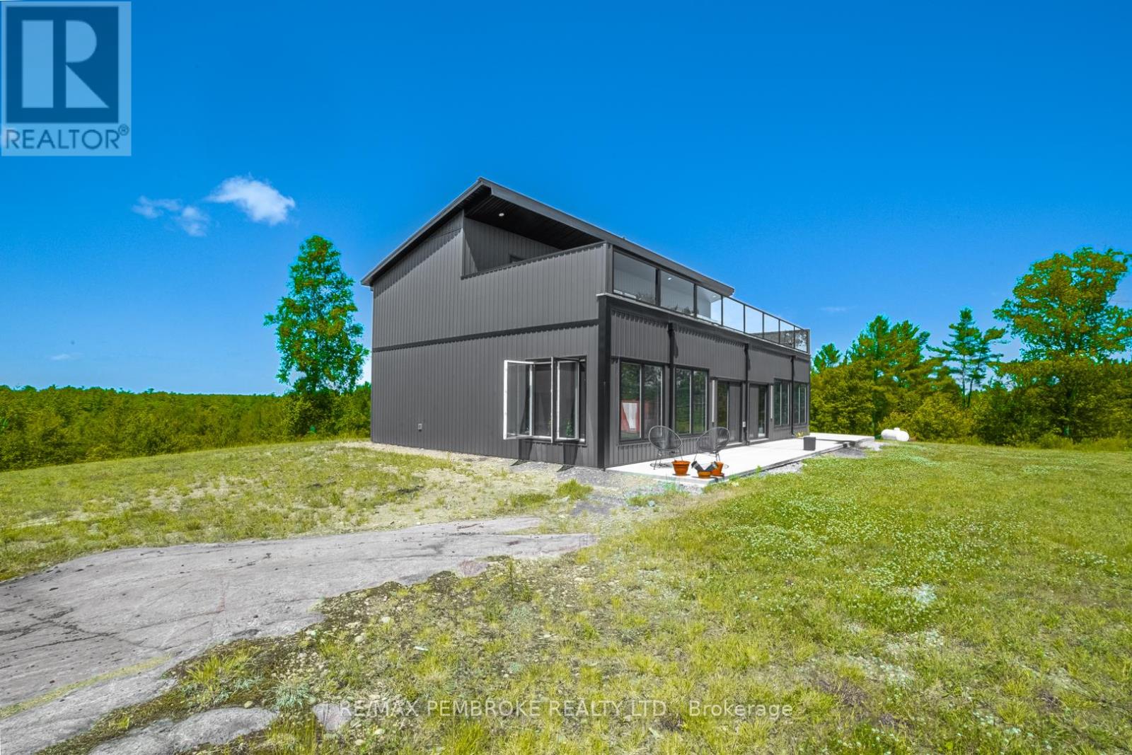 This Scandinavian style chalet is perched atop the rugged Canadian Shield offering sweeping views of the tree tops and glimpses of the Petawawa River. Walk in the door and be awed by the natural light flooding in, seamlessly blending the outside with the inside. Masterful craftsmanship of the post and beam construction done by John R. MacDonald from Algonquin Timberframe. Polished concrete floors, in-floor heating, amazing pine staircase and floor to ceiling windows all give the feeling of being in a spa! The kitchen offers a 12' island with seamless white cabinetry, soft closures and stainless steel appliances. There are 2 primary suites offering attached spa like baths (1 on the main floor and 1 on the 2nd floor). Mud room area with loads of closet space and a main floor laundry. Make your way to the 2nd floor where you will find 2 good sized bedrooms with unique access to the large deck. The 2nd floor deck is private and a relaxing area great for yoga or entertaining and even has its own outdoor shower. The deck has a glass balustrade and waterproof Goodyear membrane. The bedrooms each have energy-efficient heat pumps with AC. This style and location of home is perfect for the outdoor enthusiast and offers easy access to Highway 17 for commuting to CNL, Garrison Petawawa or into Pembroke. (id:64974)