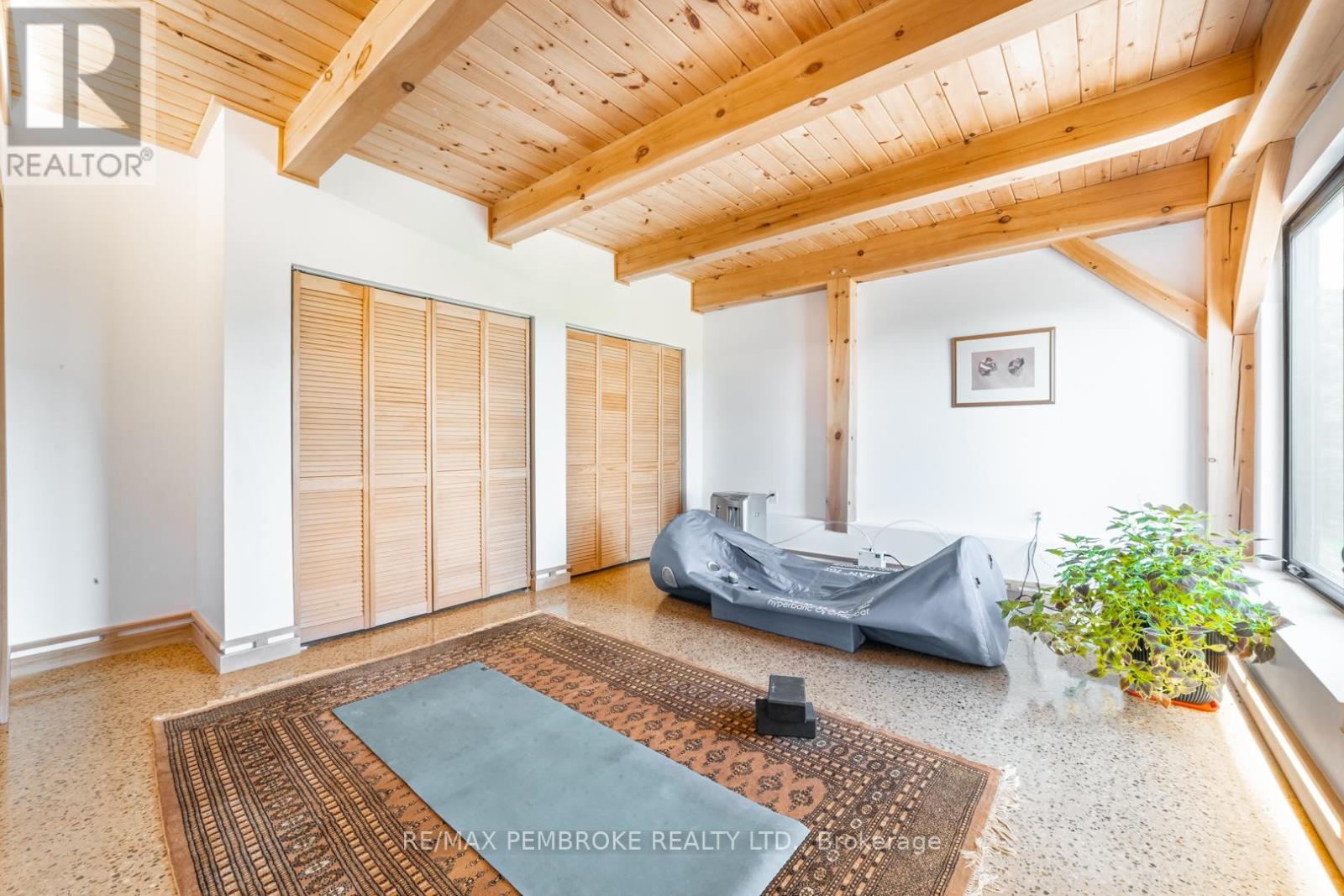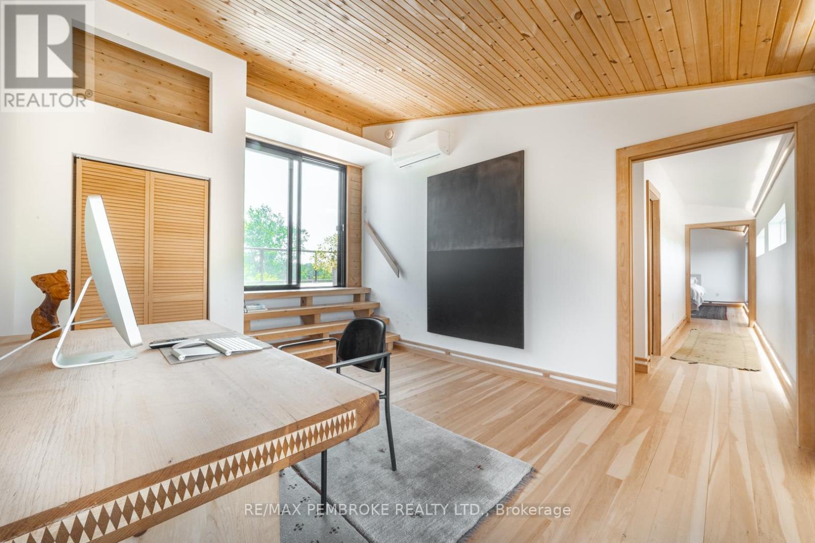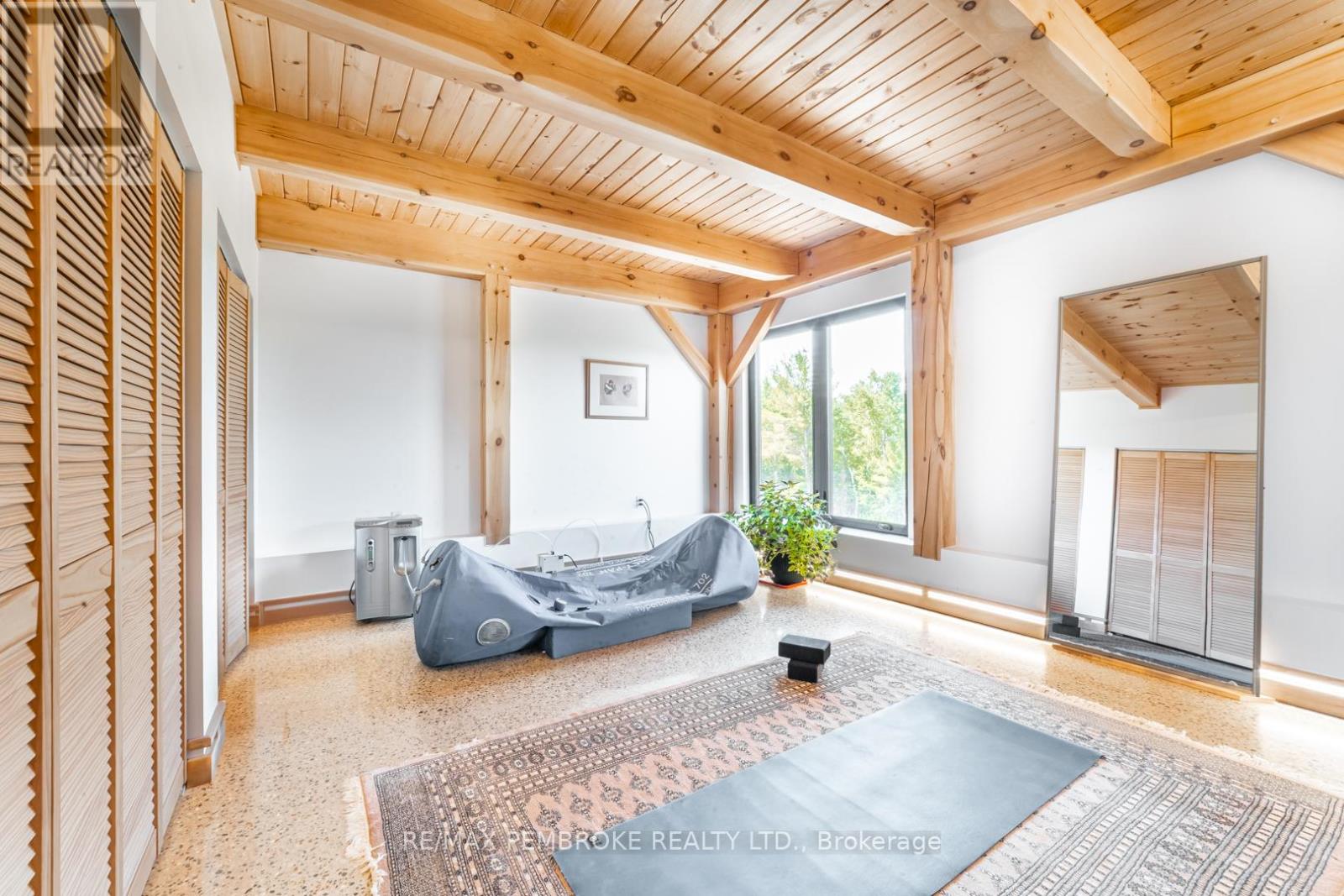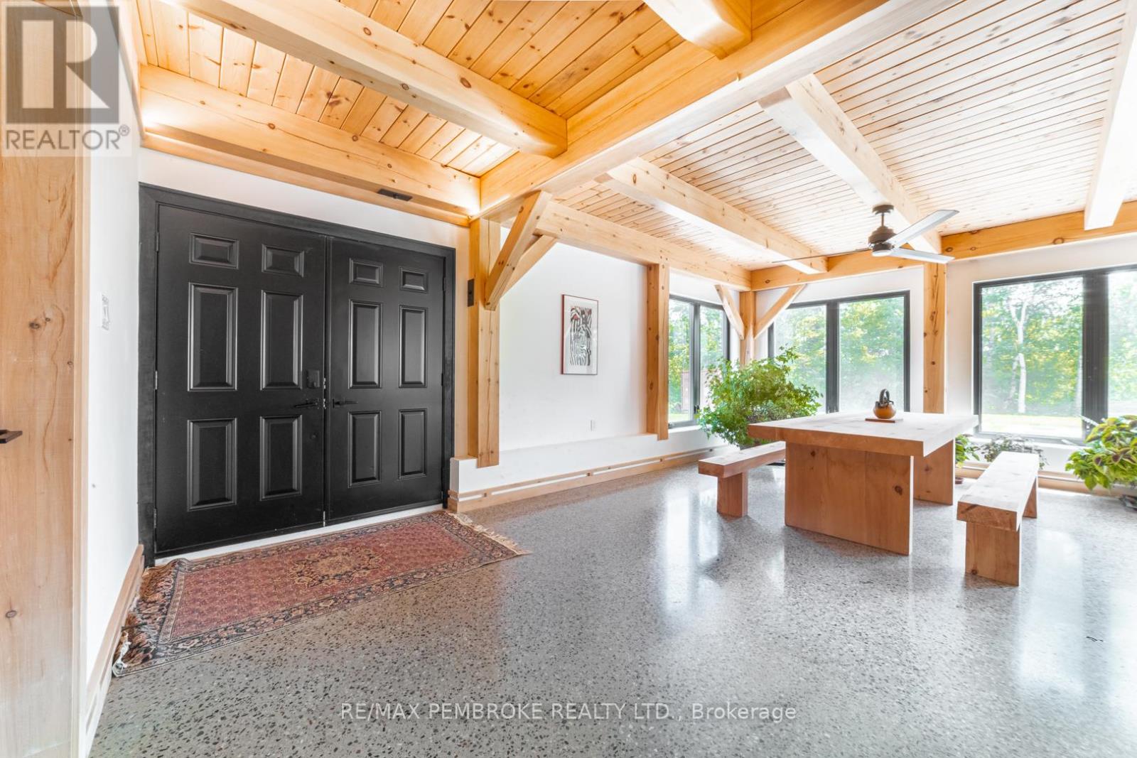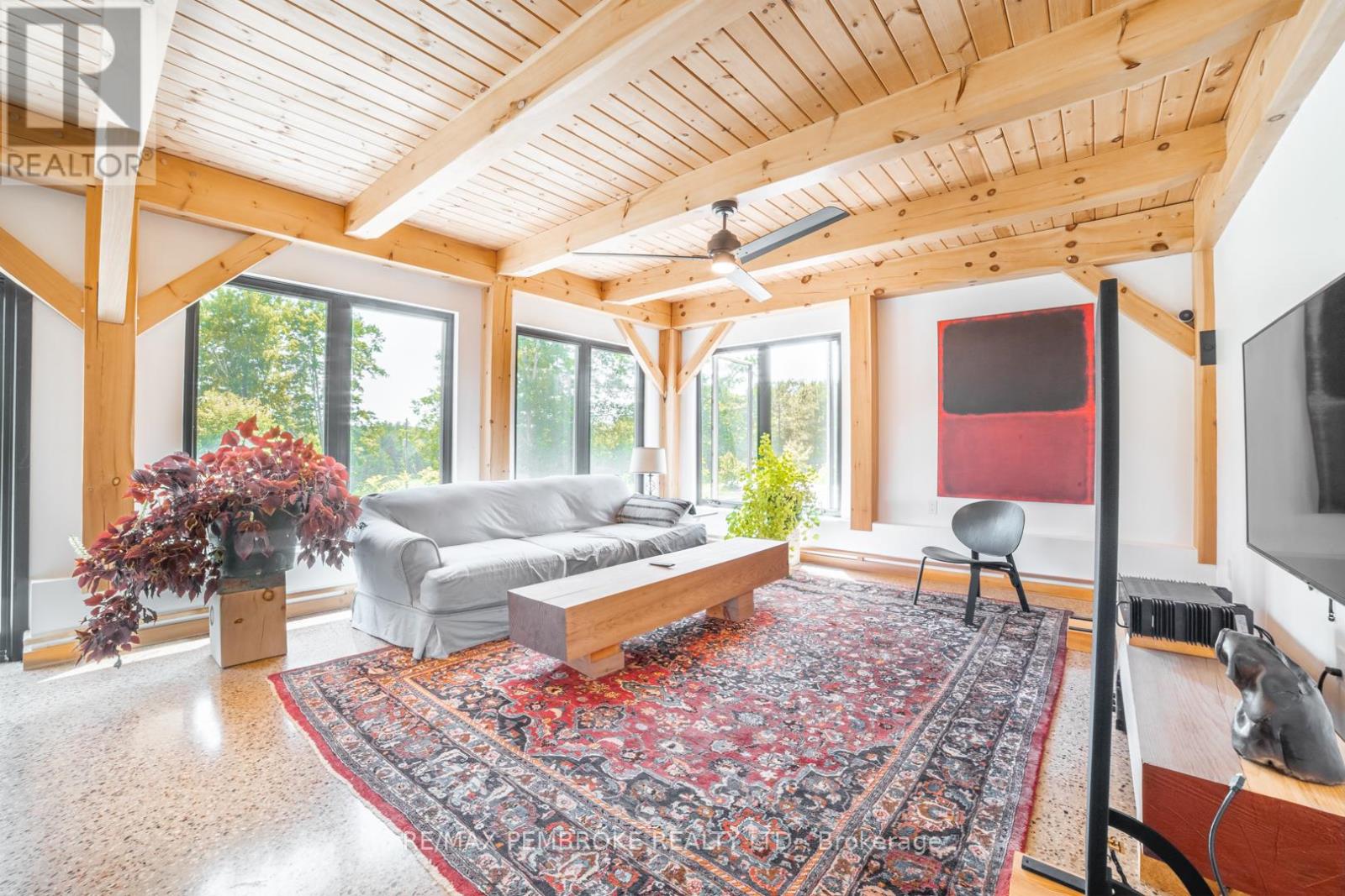 This Scandinavian style chalet is perched atop the rugged Canadian Shield offering sweeping views of the tree tops and glimpses of the Petawawa River. Walk in the door and be awed by the natural light flooding in, seamlessly blending the outside with the inside. Masterful craftsmanship of the post and beam construction done by John R. MacDonald from Algonquin Timberframe. Polished concrete floors, in-floor heating, amazing pine staircase and floor to ceiling windows all give the feeling of being in a spa! The kitchen offers a 12' island with seamless white cabinetry, soft closures and stainless steel appliances. There are 2 primary suites offering attached spa like baths (1 on the main floor and 1 on the 2nd floor). Mud room area with loads of closet space and a main floor laundry. Make your way to the 2nd floor where you will find 2 good sized bedrooms with unique access to the large deck. The 2nd floor deck is private and a relaxing area great for yoga or entertaining and even has its own outdoor shower. The deck has a glass balustrade and waterproof Goodyear membrane. The bedrooms each have energy-efficient heat pumps with AC. This style and location of home is perfect for the outdoor enthusiast and offers easy access to Highway 17 for commuting to CNL, Garrison Petawawa or into Pembroke. (id:64974)