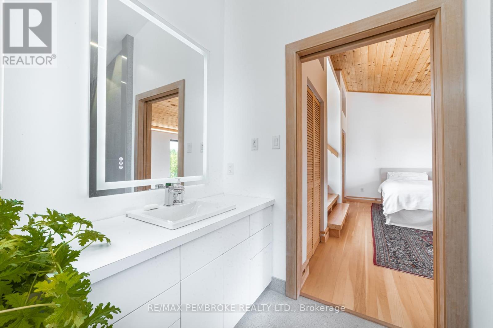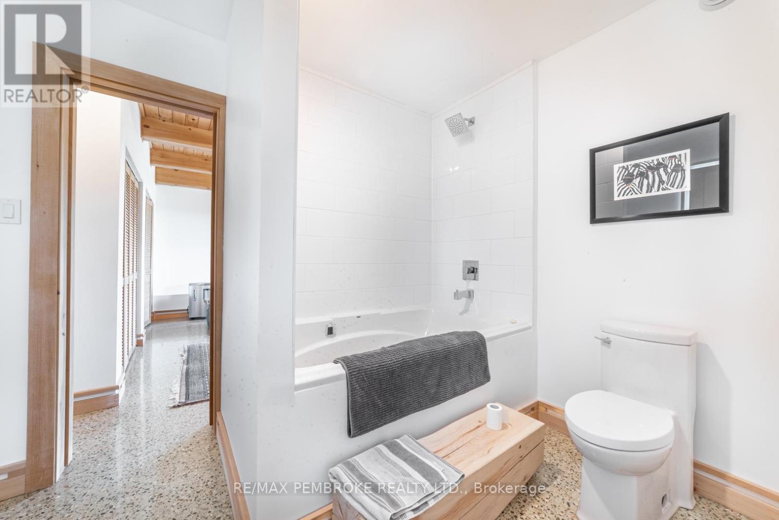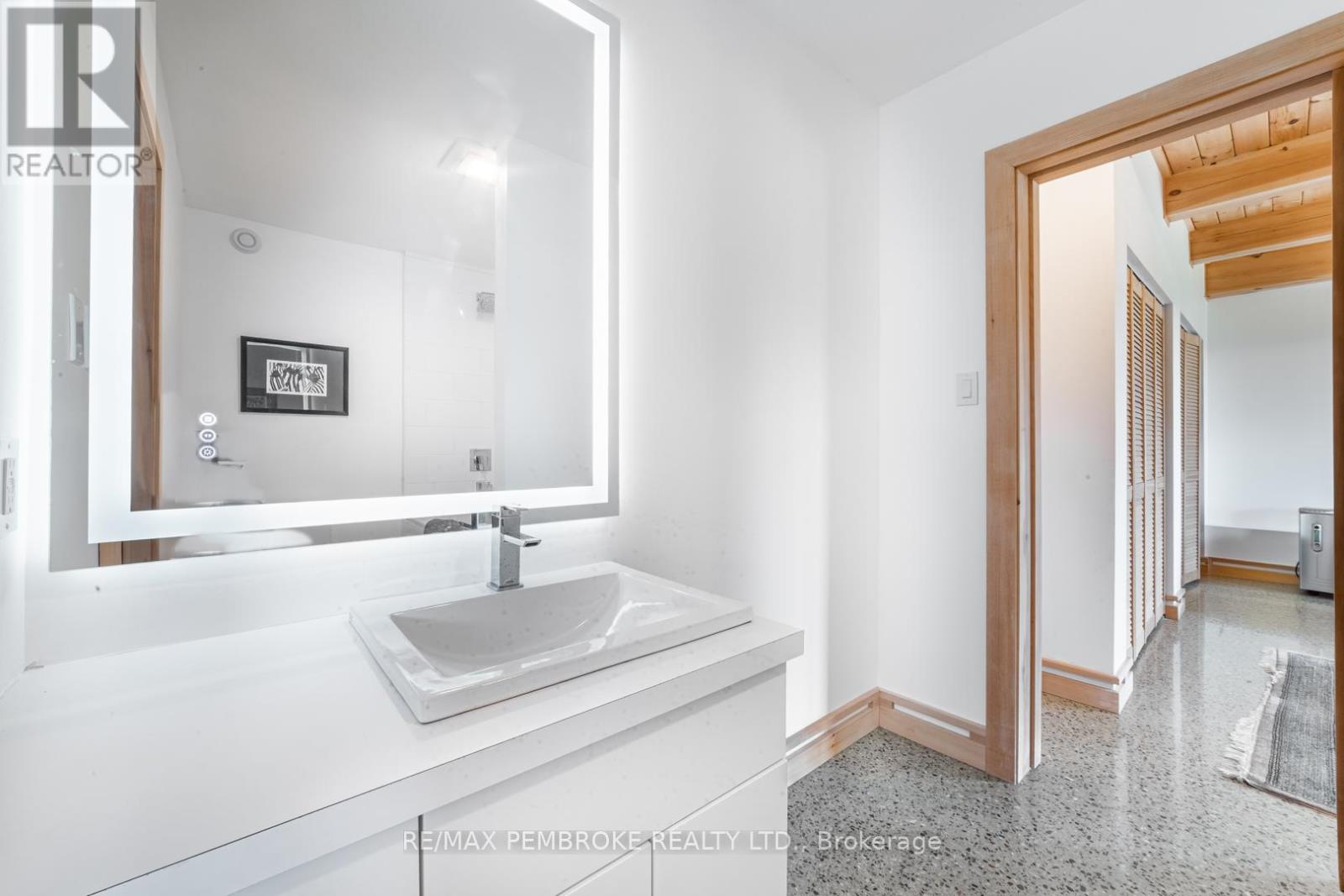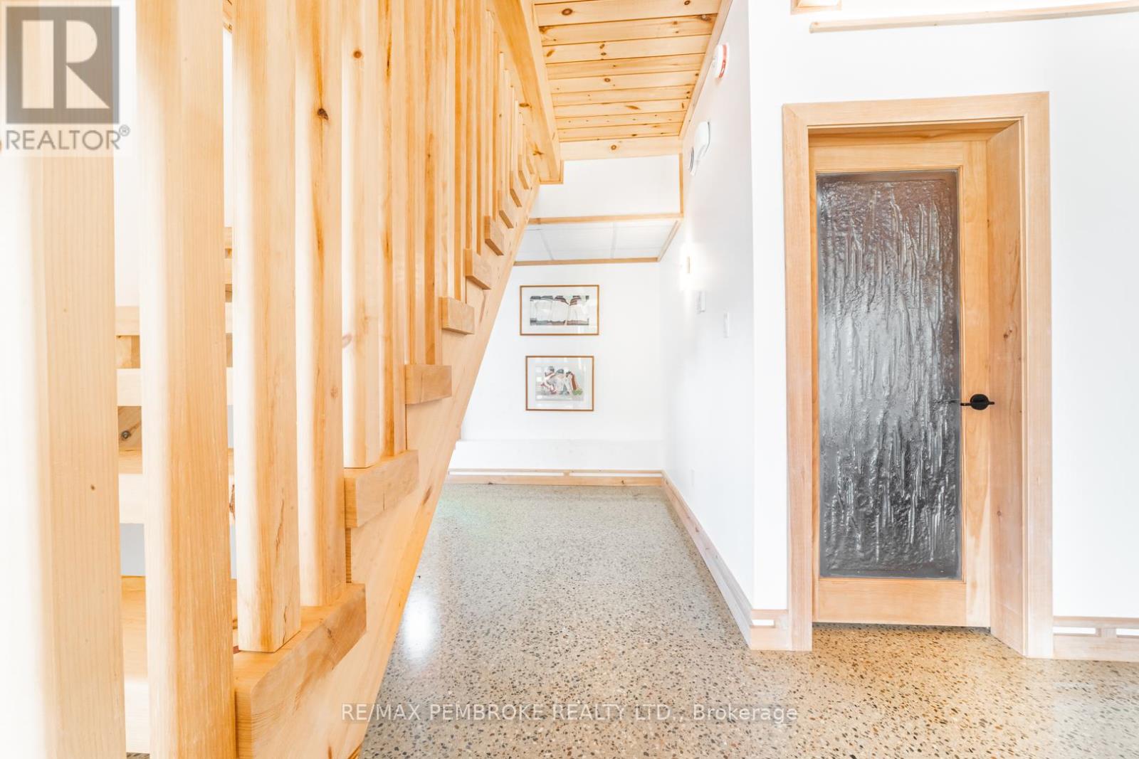 This Scandinavian style chalet is perched atop the rugged Canadian Shield offering sweeping views of the tree tops and glimpses of the Petawawa River. Walk in the door and be awed by the natural light flooding in, seamlessly blending the outside with the inside. Masterful craftsmanship of the post and beam construction done by John R. MacDonald from Algonquin Timberframe. Polished concrete floors, in-floor heating, amazing pine staircase and floor to ceiling windows all give the feeling of being in a spa! The kitchen offers a 12' island with seamless white cabinetry, soft closures and stainless steel appliances. There are 2 primary suites offering attached spa like baths (1 on the main floor and 1 on the 2nd floor). Mud room area with loads of closet space and a main floor laundry. Make your way to the 2nd floor where you will find 2 good sized bedrooms with unique access to the large deck. The 2nd floor deck is private and a relaxing area great for yoga or entertaining and even has its own outdoor shower. The deck has a glass balustrade and waterproof Goodyear membrane. The bedrooms each have energy-efficient heat pumps with AC. This style and location of home is perfect for the outdoor enthusiast and offers easy access to Highway 17 for commuting to CNL, Garrison Petawawa or into Pembroke. (id:64974)