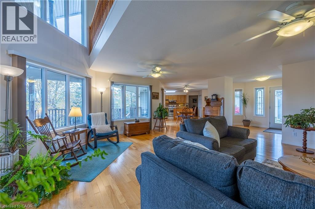 Charming country bungaloft, located between the friendly harbour town of Port Rowan and Long Point's sandy beaches. The bright open-concept main floor has solid oak flooring throughout the spacious living room, dining area and bedrooms. Numerous windows frame stunning sunrises, sunsets, and seasonal lake views. The large covered deck provides convenient outdoor living space. The well-designed kitchen makes meal preparation a breeze, either for quiet dinners or entertaining a crowd. The main floor primary bedroom has double closets and ensuite bath. The second main floor bedroom (currently an office) is beside a second bathroom. Laundry facilities are tucked away close to the kitchen. The airy loft, with its own balcony, is an adaptable space for wellness/creativity/business. Downstairs, part of the basement features a finished bedroom, bathroom, and hallway with access to the garage. The rest of the basement awaits your finishing touches, and includes an inviting hexagonal room with a cheerful Vermont Castings gas fireplace, adjoining workshop, furnace room, and cold cellar. The large attached double garage has lots of storage space. Outside is a tranquil green oasis with conifers, fruit trees, perennials and raised garden beds. A Generac generator provides peace of mind during power outages. Port Rowan offers many active living amenities: walking trails, water sports, tennis, and golfing. Services include a grocery store, primary school, pharmacy, restaurants, medical offices, and boutique shopping. Nearby are Long Point and Turkey Point Provincial Parks, marinas, breweries, wineries, world-class birding, and mountain biking trails. (id:64974)