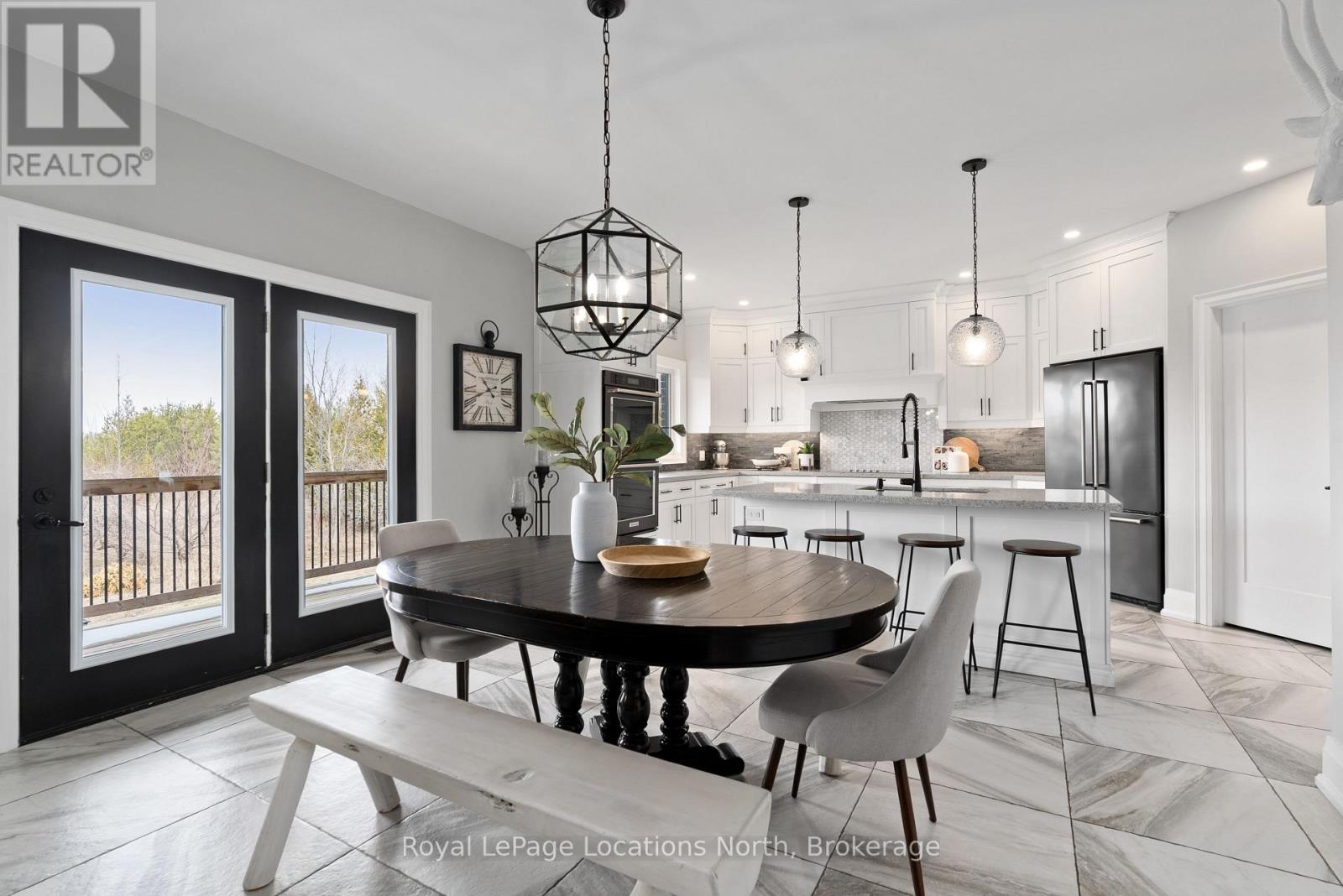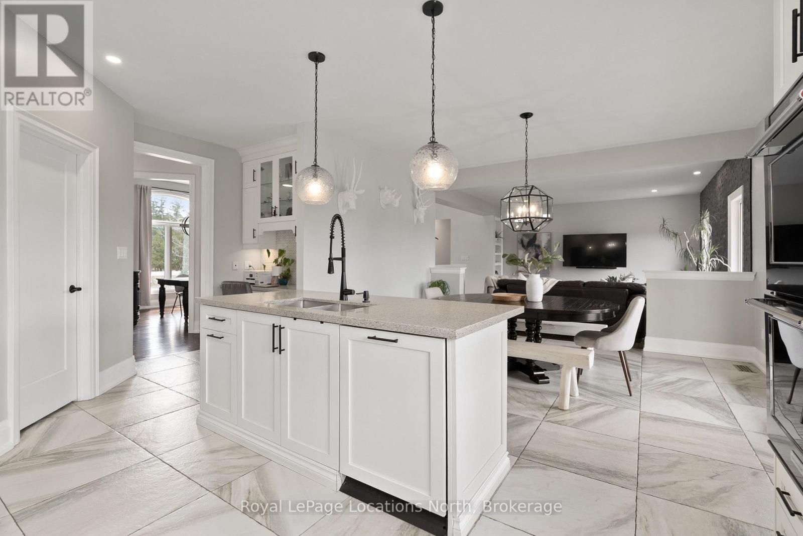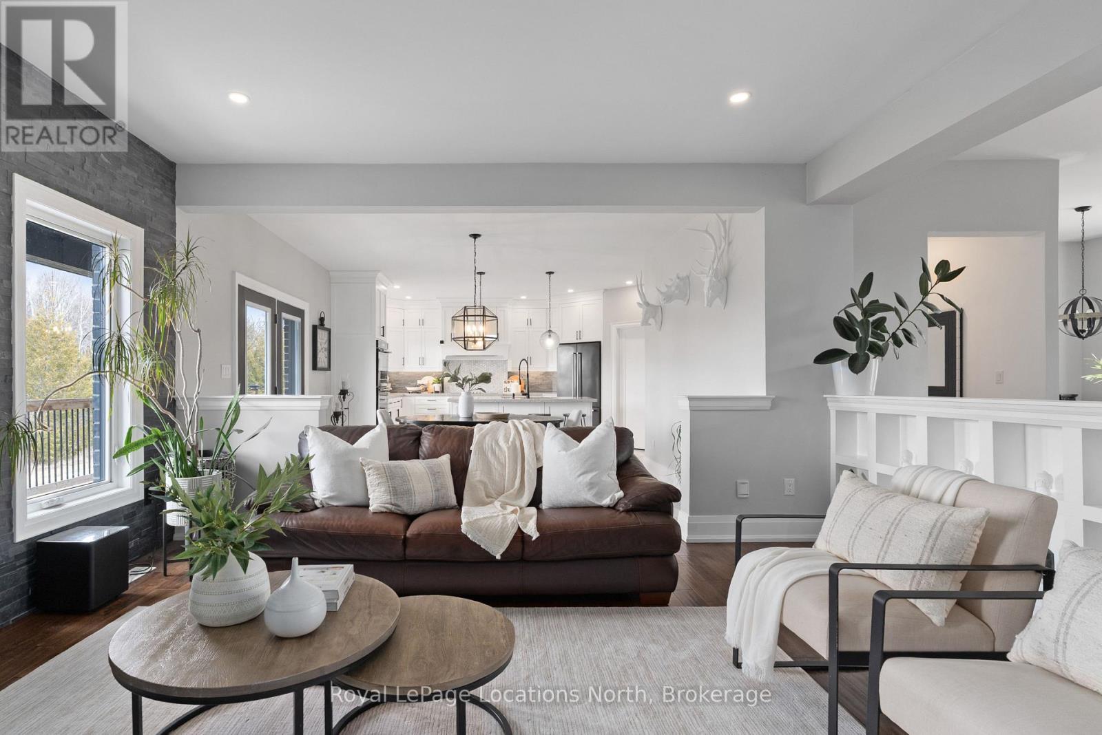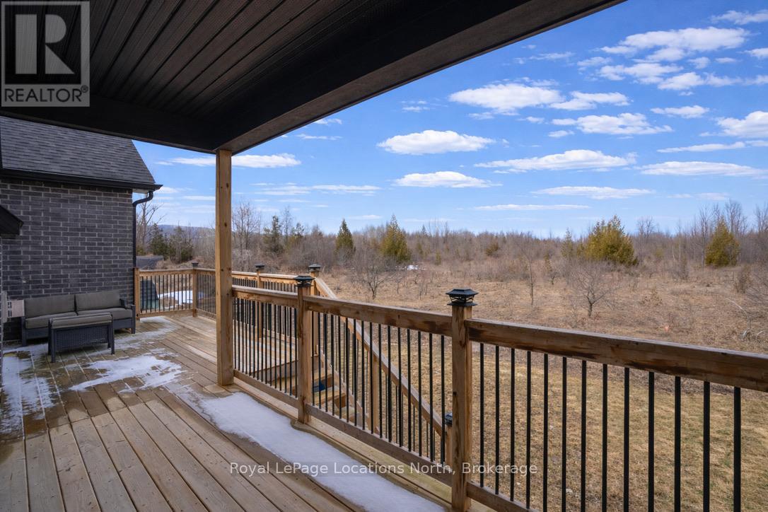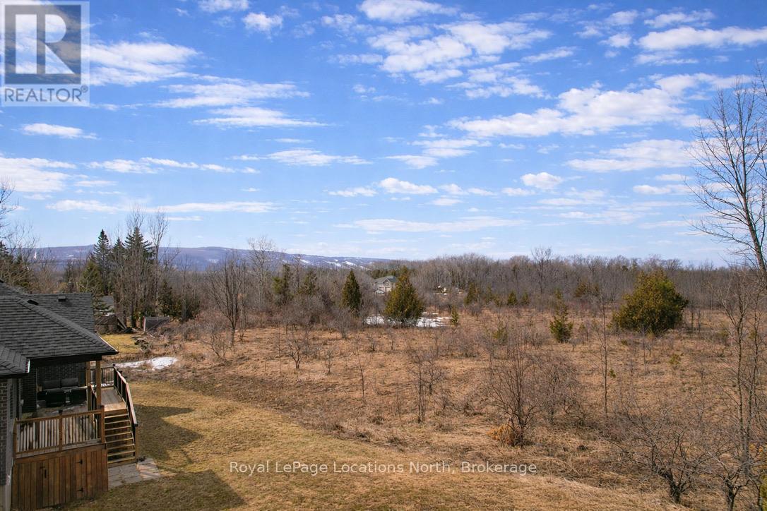 Custom-built all brick and stone bungalow set on an expansive lot in a highly desirable location, offering stunning views toward Osler Bluff and the surrounding escarpment. This thoughtfully designed home features soaring ceilings, hand-scraped oak hardwood flooring, and high-end finishes throughout. The chef-inspired kitchen showcases quartz countertops, custom cabinetry, premium appliances including double wall ovens and an induction cooktop, and a large centre island and breakfast seating-perfect for both everyday living and entertaining, as well as a built-in office nook. The open-concept layout flows seamlessly into the great room and main dining area, while the main-level laundry/mudroom provides convenient inside entry from the oversized insulated two-car garage. The spacious primary suite offers a generous layout, walk-in closet, private outdoor access, and a beautifully finished ensuite. Three additional bedrooms and well-appointed bathrooms continue the theme of quality craftsmanship, complete with designer fixtures and refined finishes. The fully finished lower level with 9-ft ceilings significantly expands the living space, featuring a large recreation room, dedicated gym, and yoga studio or potential in-law suite with a separate entrance-ideal for extended family or flexible lifestyle needs. Enjoy peaceful surroundings with abundant wildlife and long, uninterrupted views of natural greenery, all while being just minutes to Downtown Collingwood, Blue Mountain Village, skiing, golf, and year-round recreation. A rare opportunity to own a beautifully finished bungalow in an exceptional four-season setting surrounded by nature. (id:64974)