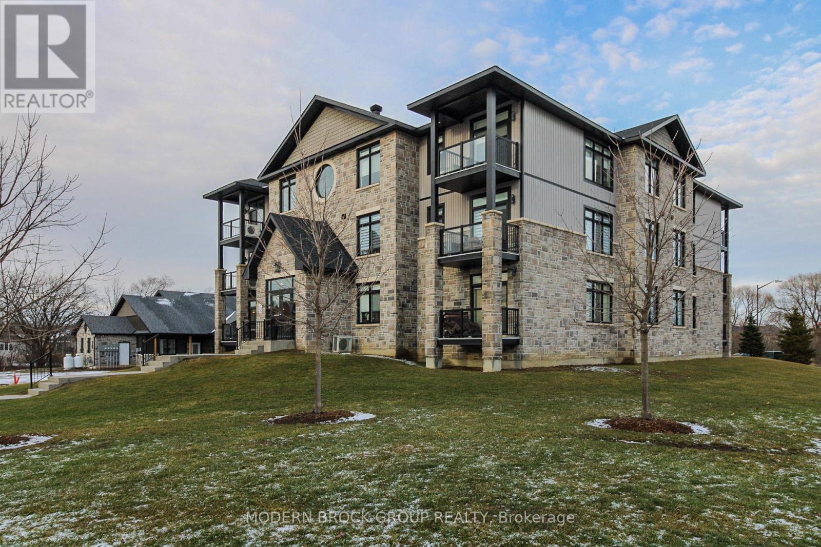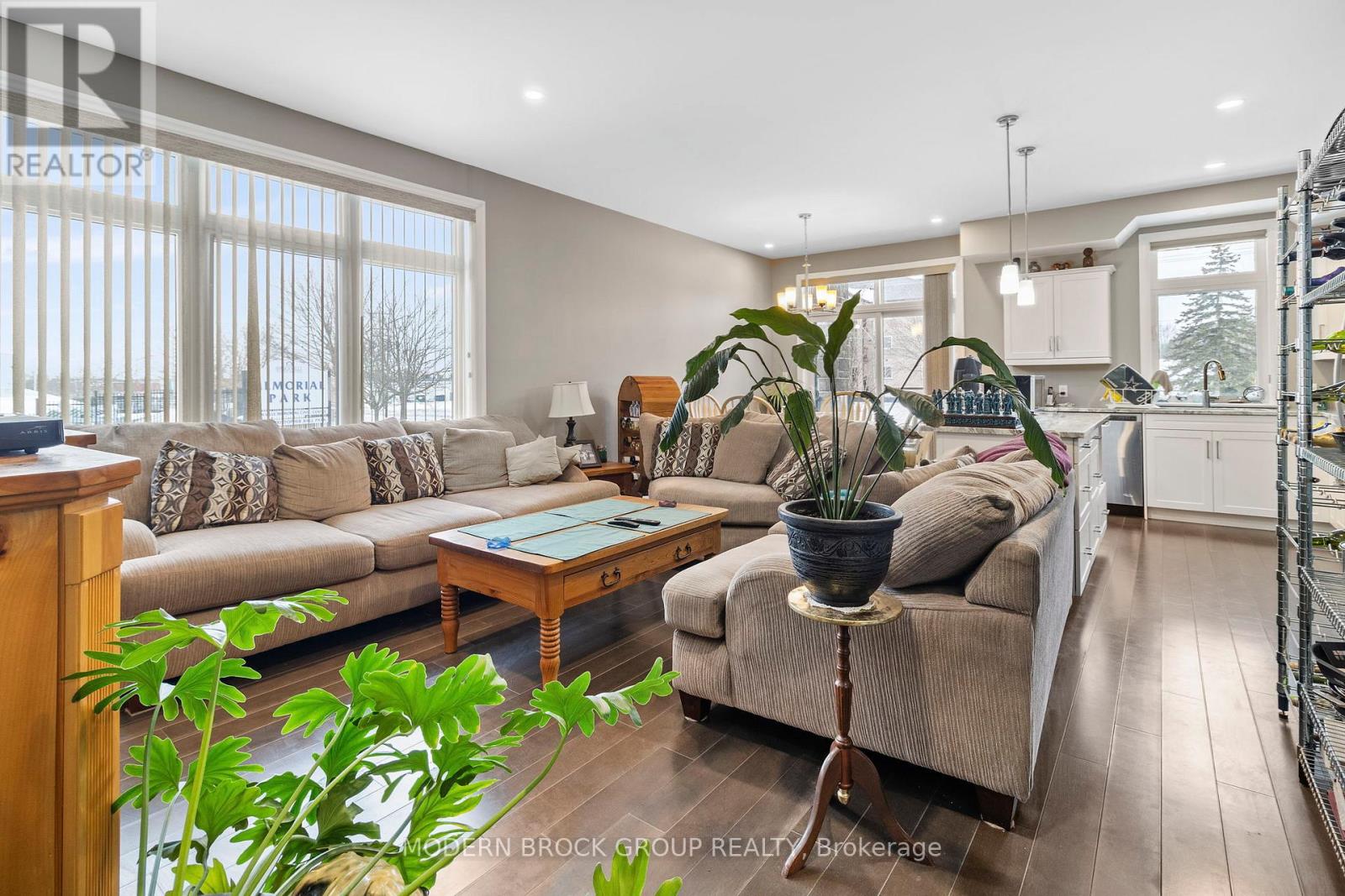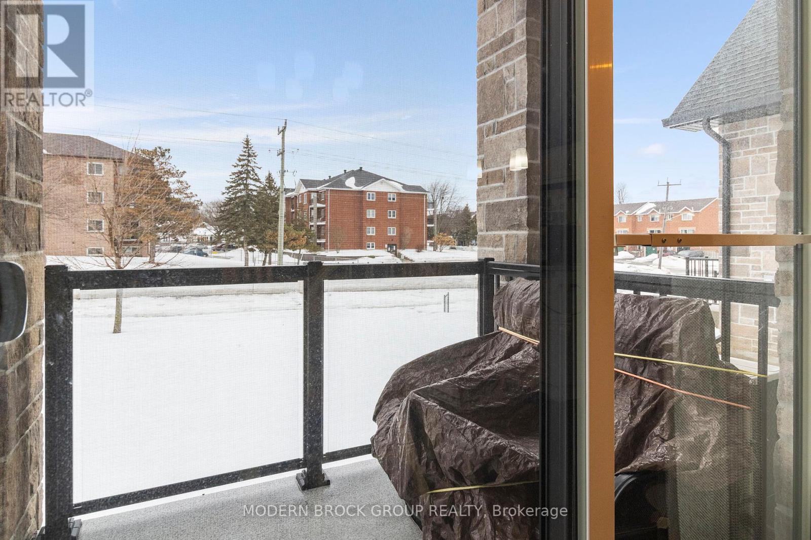 Welcome to a carefree lifestyle in a well managed and stylish luxury building? This bright and spacious open concept, two bedroom, two bathroom condo boasts nine foot ceilings and oversized windows that draw in plenty of natural light even on those dreary winter days. It's conveniently located near shopping, restaurants, recreation and parks in Brockville's North End. You will love the warmth underfoot of the in-floor radiant heat and the convenience of in-suite laundry and secure underground parking. The A/C and air handler were just cleaned and serviced and an upgraded thermostat installed and programmed. There is nothing to do except move in, relax, and enjoy your morning coffee on your private balcony. There is even a secure locker on the garage level to throw your luggage into when you're back from your winter getaway. This suite was recently repainted and new insulated blinds installed. Book your private showing today. (id:64974)
