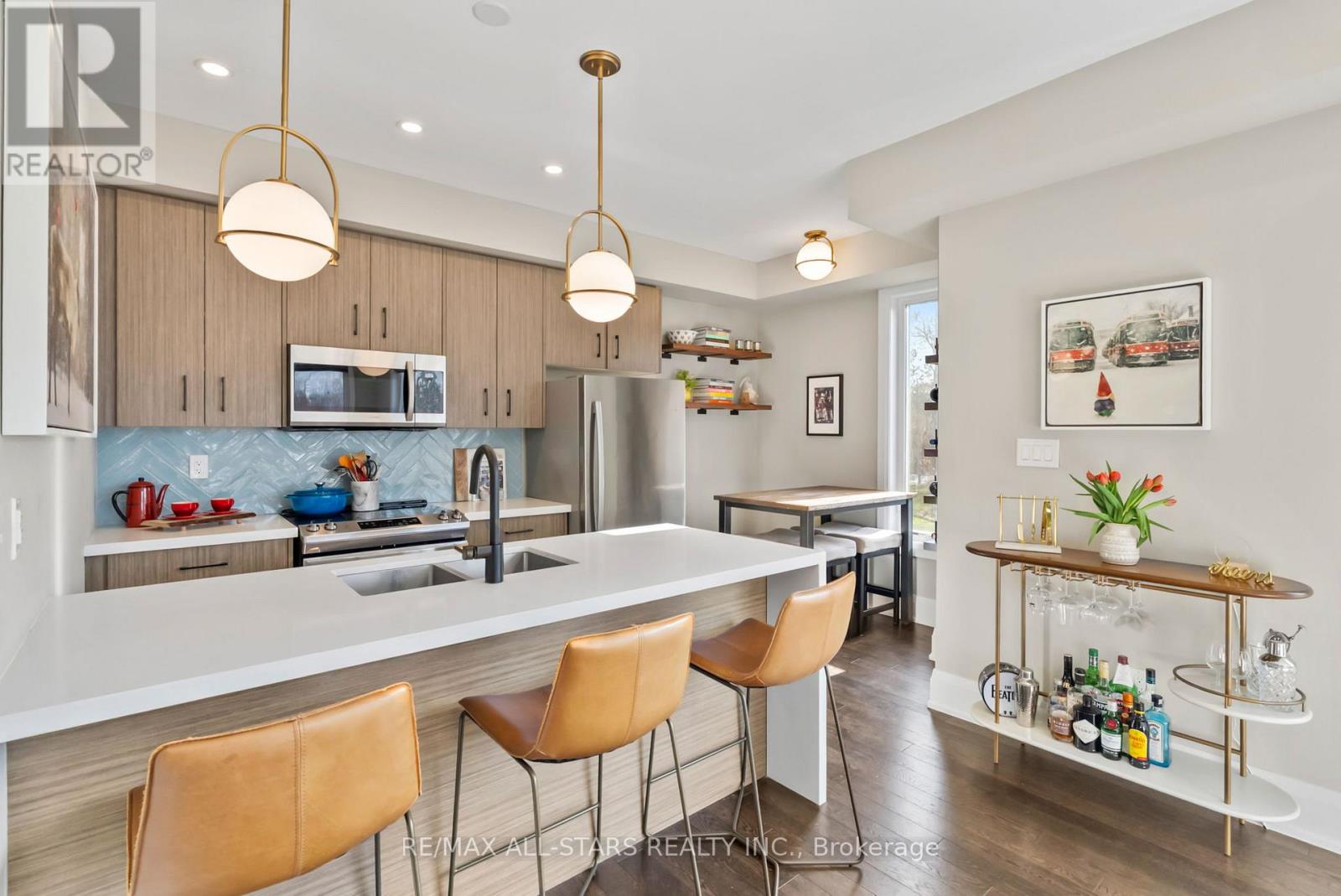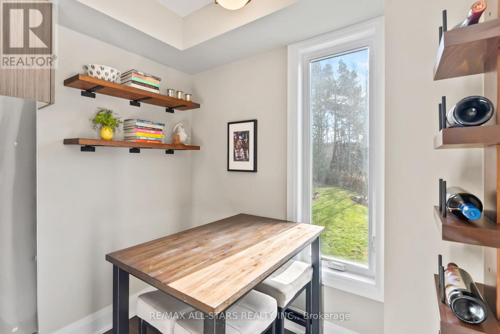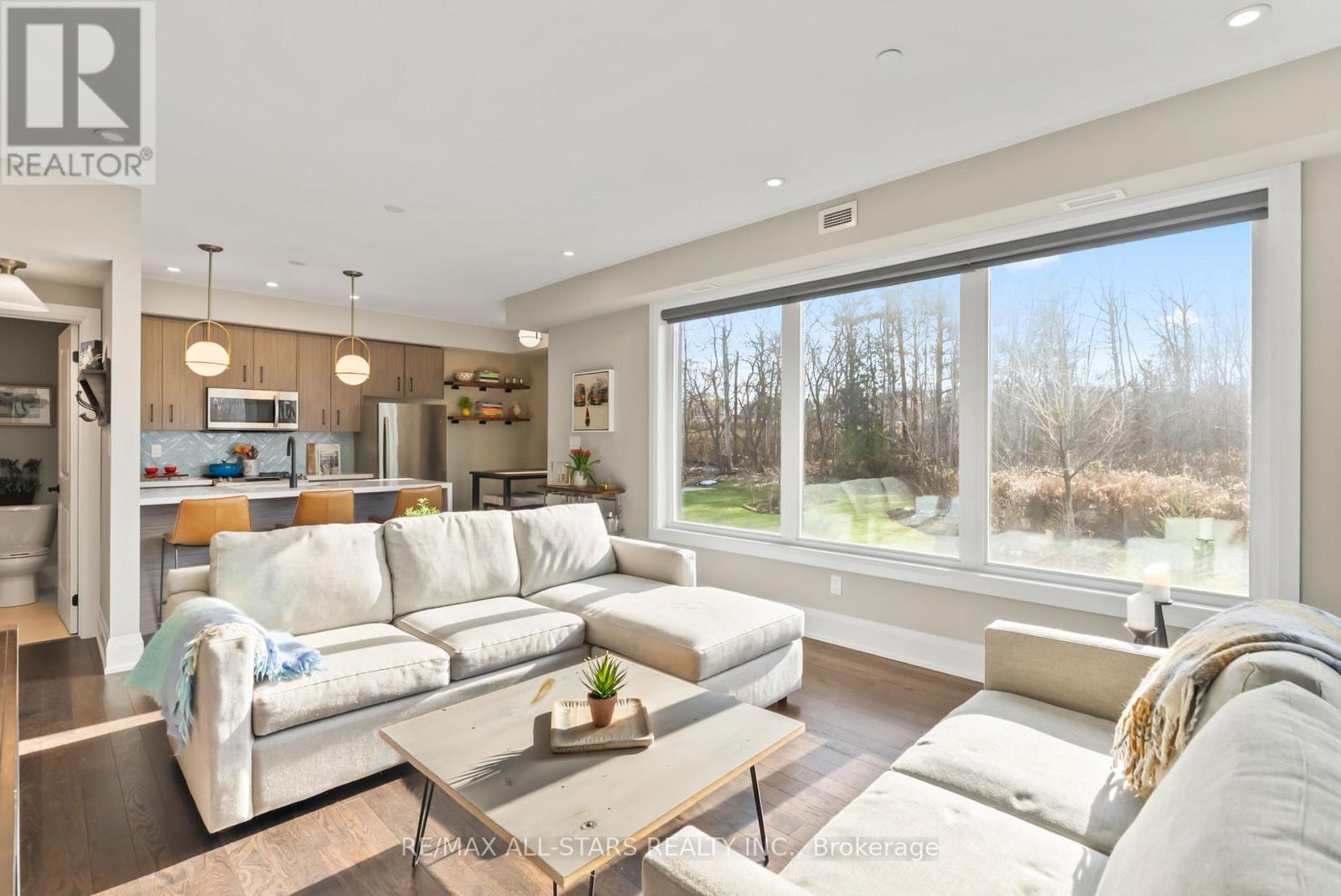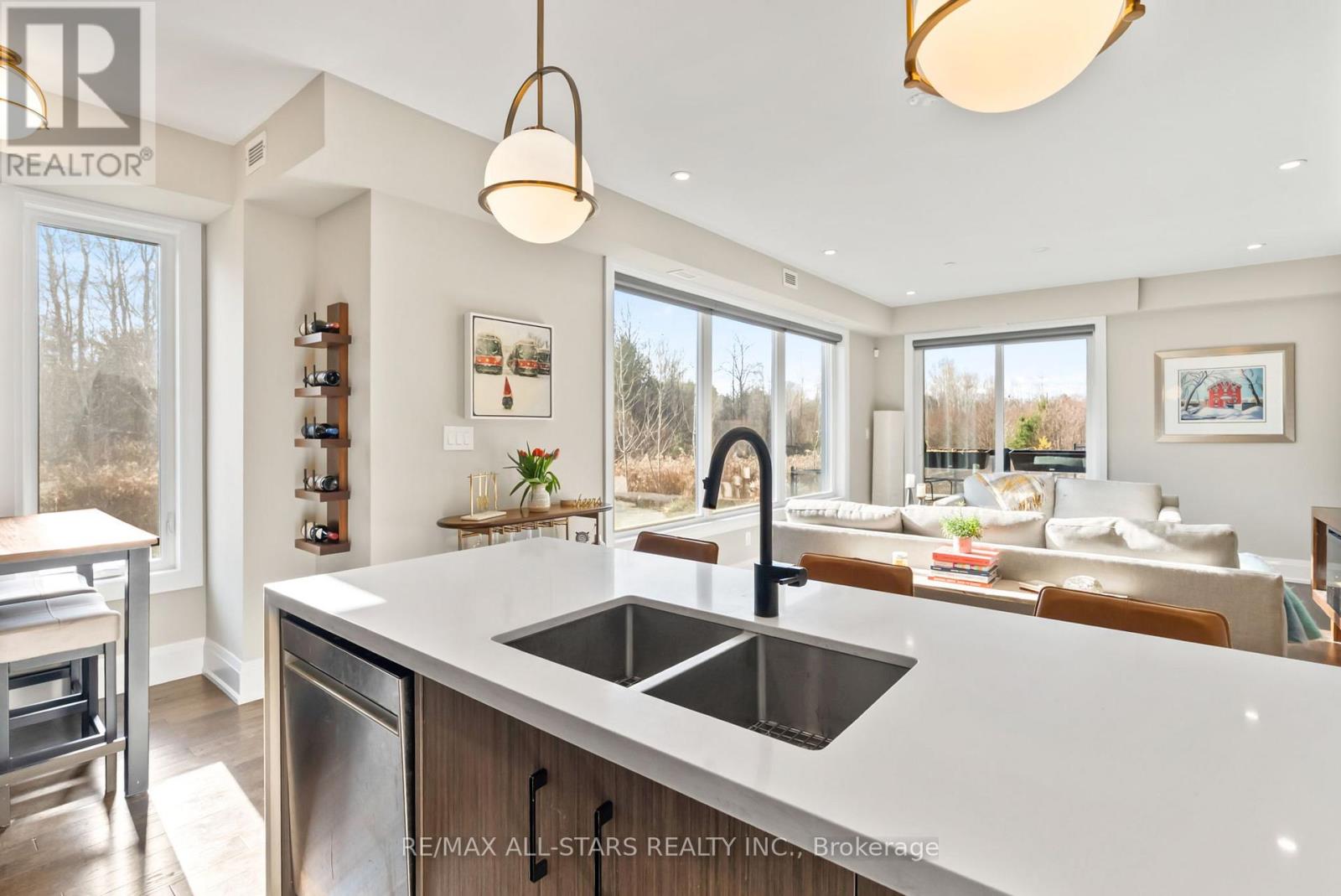 Discover refined living in this beautifully crafted two-level corner condo, offering over 1,207 sq. ft(Per MPAC). of contemporary design in one of Uxbridge's most sought-after boutique residences. The main level welcomes you with an airy, open-concept layout featuring a sleek modern kitchen with a large waterfall-edge island, warm wood cabinetry, stainless steel appliances, and stylish pendant lighting-perfect for effortless entertaining. The spacious living area is framed by expansive windows that showcase serene natural views, filling the space with soft, inviting light. A private balcony extends your living outdoors, creating the perfect spot to unwind in peace and privacy. On the lower level, retreat to two generously sized bedrooms, each enhanced with rich hardwood flooring and oversized windows that bring the tranquility of the outdoors inside. The luxurious 4-piece bathroom offers a spa-inspired experience with stylish heated tile floors and modern finishes, while a chic main-floor powder room adds everyday practicality. Set within an intimate 12-unit building, this residence provides a rare blend of elegance, community, and convenience-complete with a storage locker and dedicated parking. Located just steps from Uxbridge's vibrant downtown, charming local shops, cozy cafés, and scenic trails, this home delivers the perfect balance of upscale modern living and small-town comfort. A truly exceptional opportunity in one of Uxbridge's most desirable locations. (id:64974)