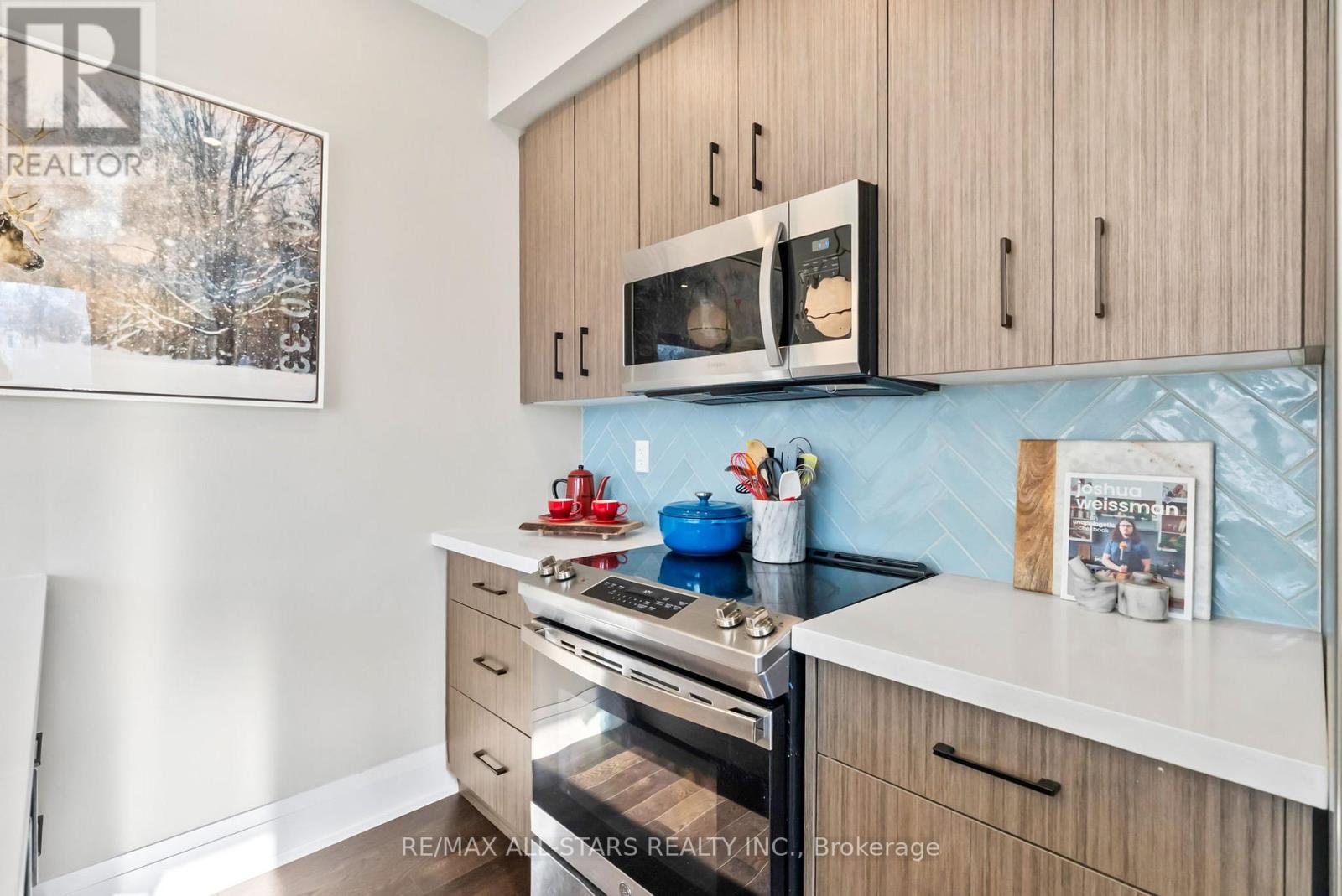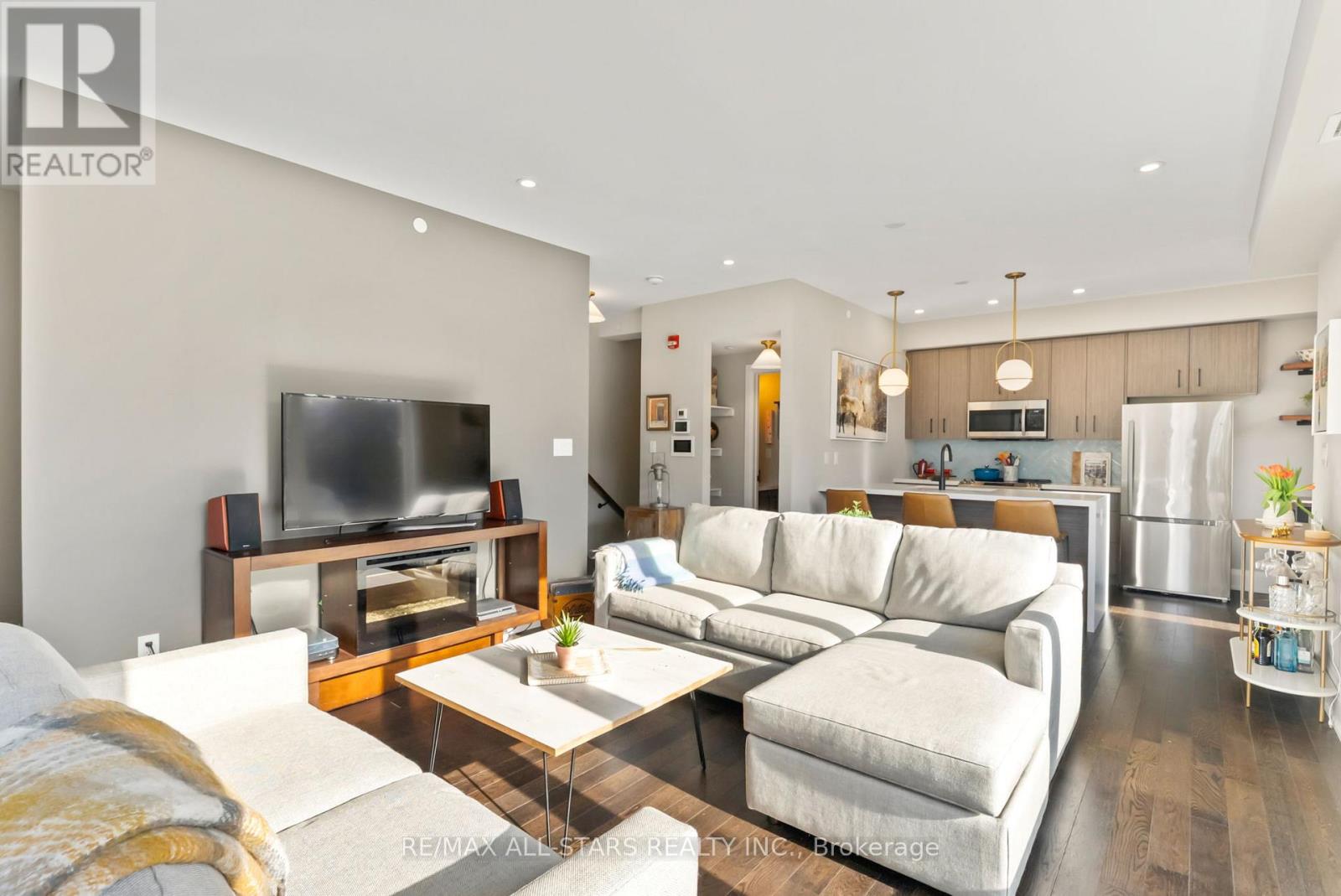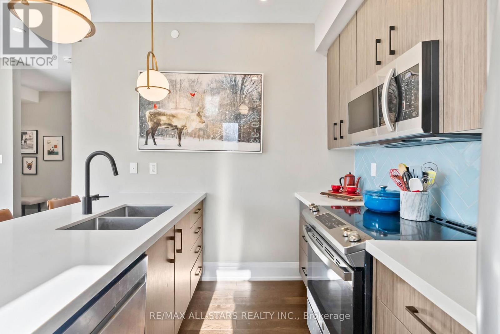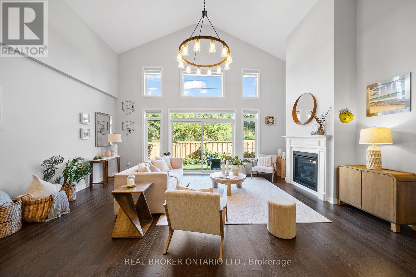 Discover refined living in this beautifully crafted two-level corner condo, offering over 1,207 sq. ft(Per MPAC). of contemporary design in one of Uxbridge's most sought-after boutique residences. The main level welcomes you with an airy, open-concept layout featuring a sleek modern kitchen with a large waterfall-edge island, warm wood cabinetry, stainless steel appliances, and stylish pendant lighting-perfect for effortless entertaining. The spacious living area is framed by expansive windows that showcase serene natural views, filling the space with soft, inviting light. A private balcony extends your living outdoors, creating the perfect spot to unwind in peace and privacy. On the lower level, retreat to two generously sized bedrooms, each enhanced with rich hardwood flooring and oversized windows that bring the tranquility of the outdoors inside. The luxurious 4-piece bathroom offers a spa-inspired experience with stylish heated tile floors and modern finishes, while a chic main-floor powder room adds everyday practicality. Set within an intimate 12-unit building, this residence provides a rare blend of elegance, community, and convenience-complete with a storage locker and dedicated parking. Located just steps from Uxbridge's vibrant downtown, charming local shops, cozy cafés, and scenic trails, this home delivers the perfect balance of upscale modern living and small-town comfort. A truly exceptional opportunity in one of Uxbridge's most desirable locations. (id:64974)