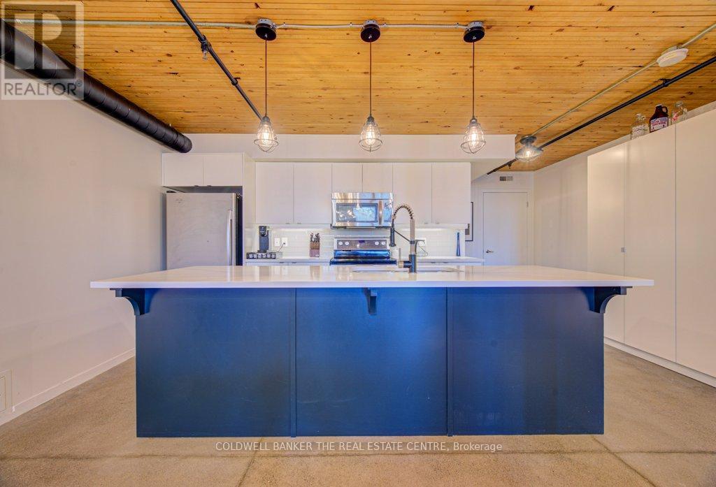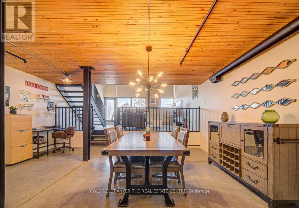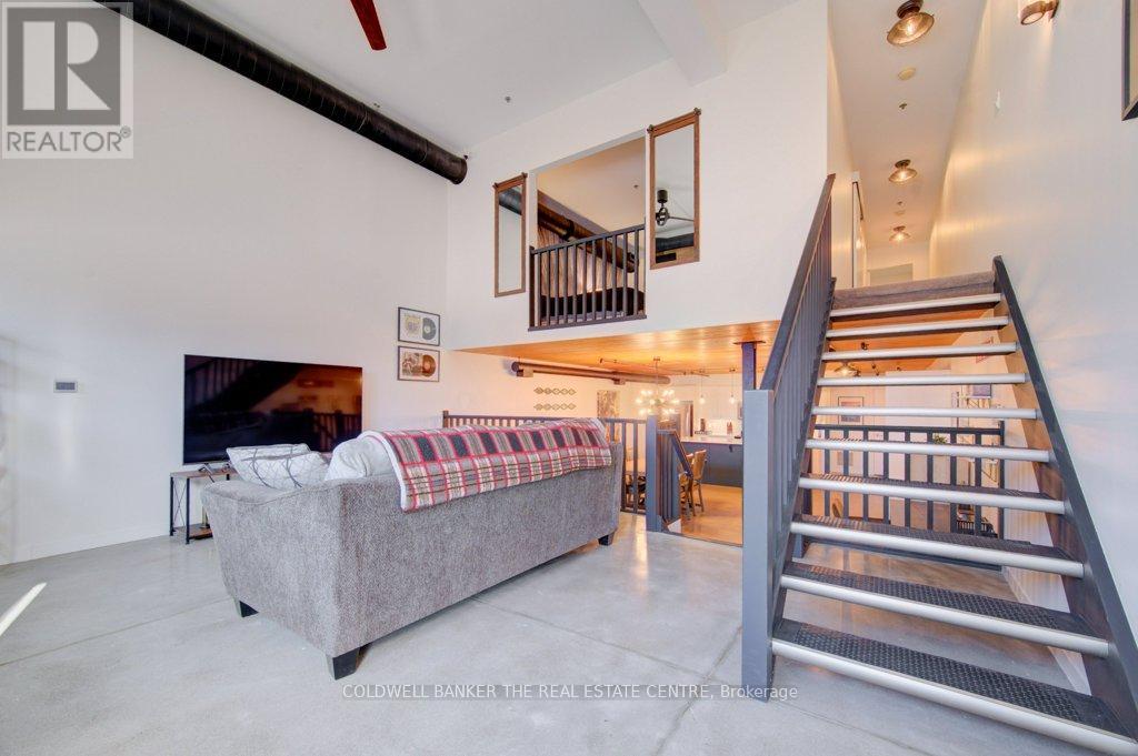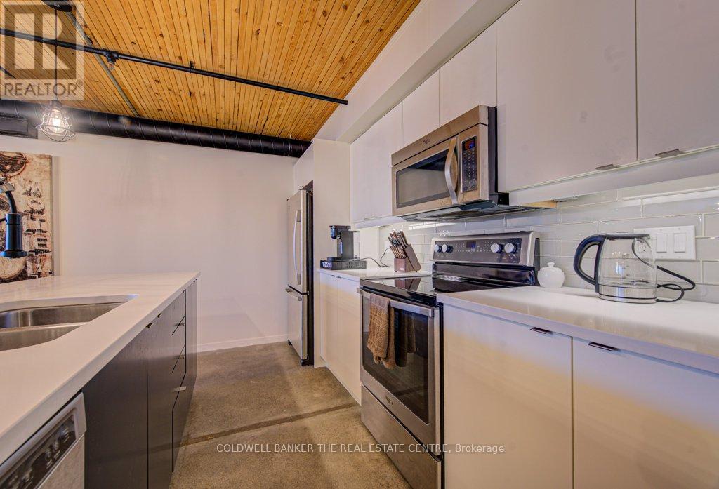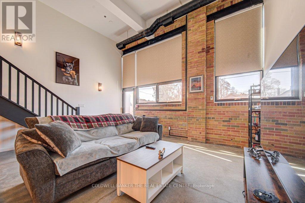 Spruce Street Lofts presents a unique opportunity to own a piece of Galt's industrial history. This 1,691 sq. ft. updated warehouse conversion strikes a bold balance between raw materials and polished finishes, featuring striking cement floors and original brickwork under towering ceilings. The expansive open-concept layout is a centerpiece of modern function, seamlessly connecting a gourmet kitchen-boasting premium quartz countertops, modern painted cabinetry, stainless steel appliances, and an oversized island-to the sun-filled dining and lounge areas. This airy flow is perfect for entertaining, with wall-to-wall windows framing the urban landscape. Privacy remains paramount, with the building nestled in a quiet residential pocket bordering a park, yet located only minutes from the city's premier arts, dining, and yoga studios. High-end updates abound, from the designer lighting throughout to the spa-inspired bathroom with its deep soaker tub. Featuring secure underground parking and a rare private back patio, this loft offers the scale of a house with the effortless lifestyle of downtown condo living. (id:64974)