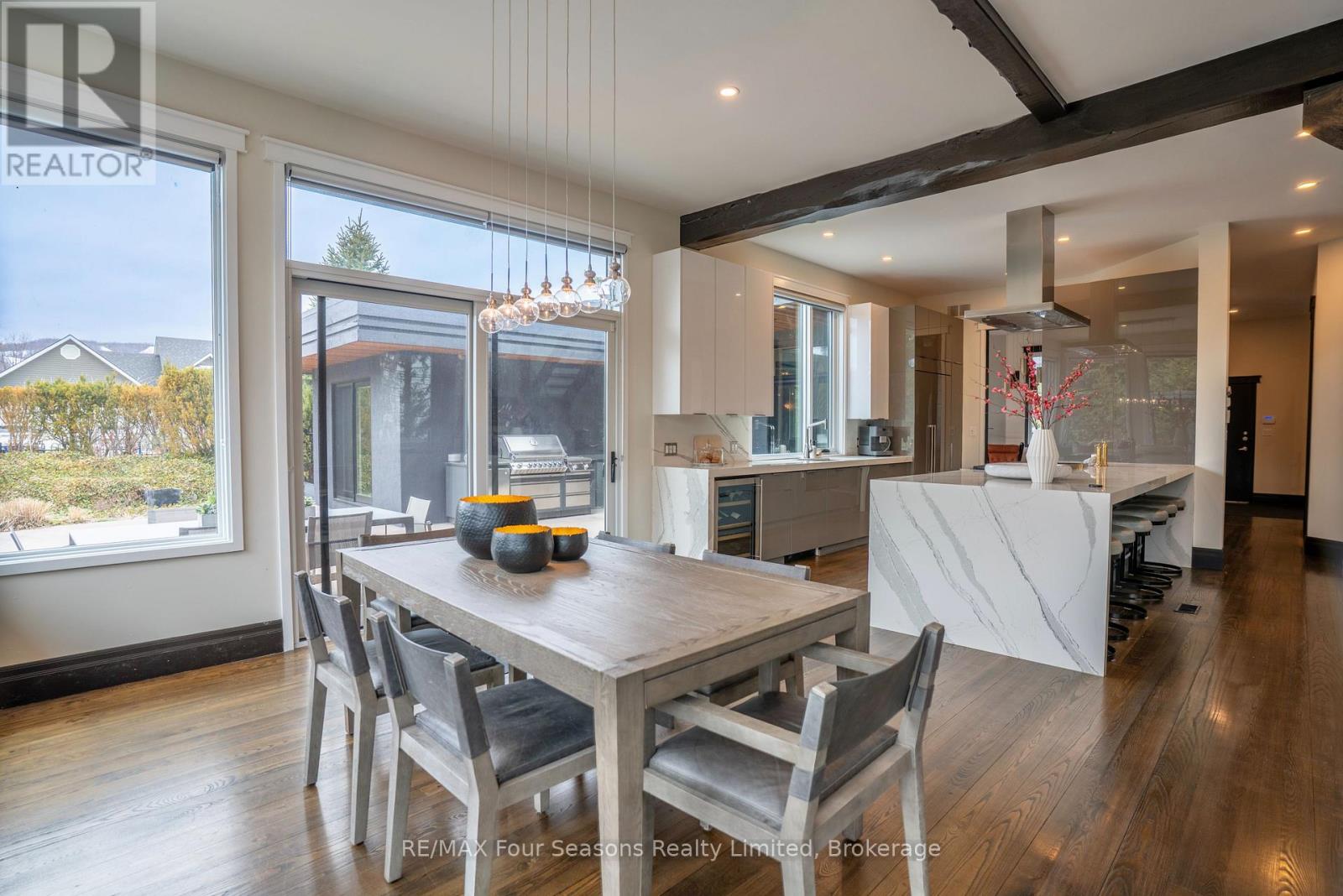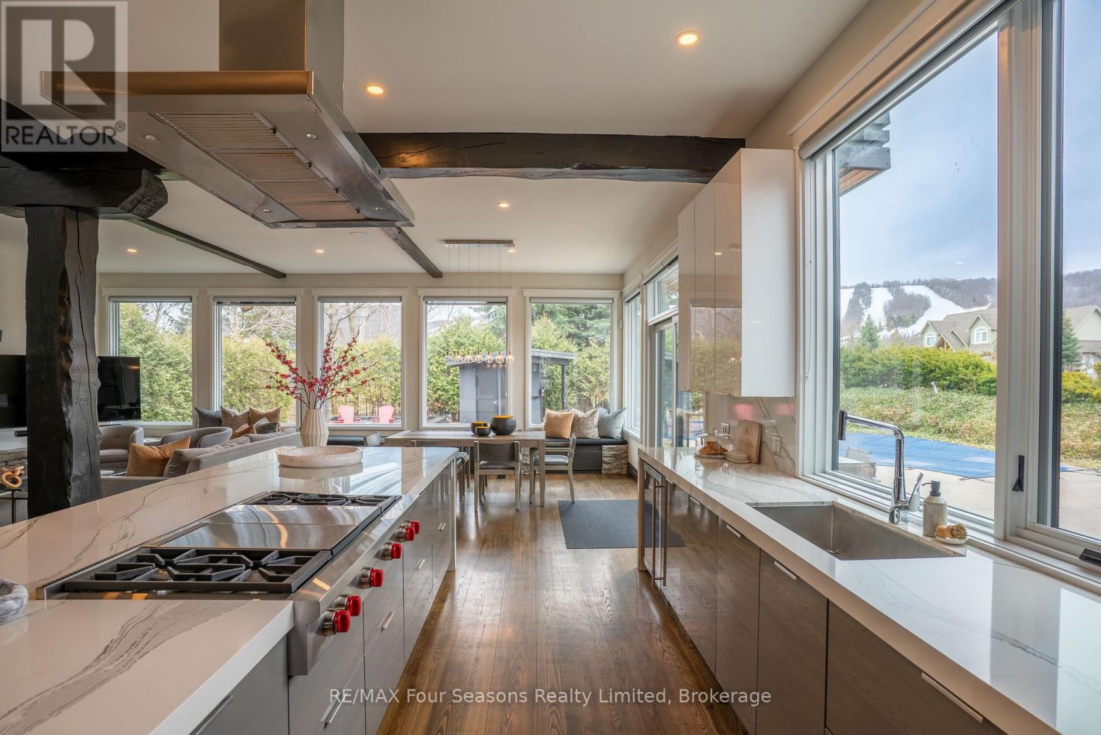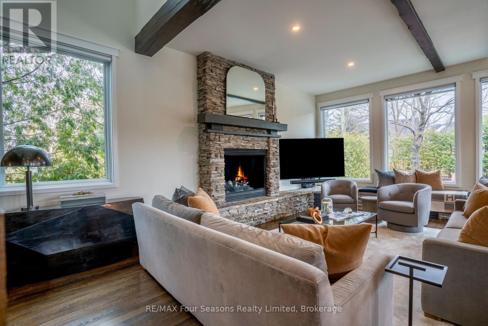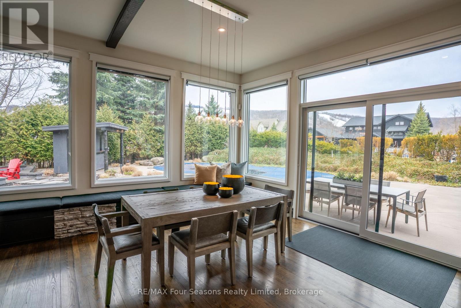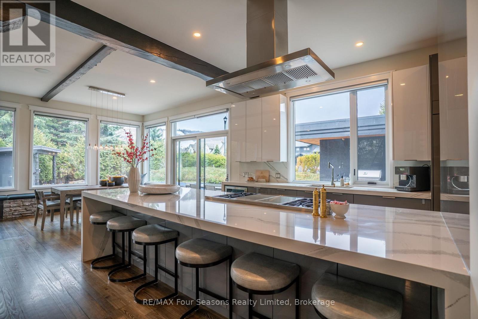Set in prestigious Nipissing Ridge, steps to Craigleith and Alpine Ski Clubs, this exceptional modern chalet, built by custom builders Absolute Craftsmen, offers over 3,000 sq ft plus a professionally finished basement, designed for year-round living and entertaining. Offered turnkey with designer furnishings, the property is move-in ready. The open-concept main level is anchored by a striking glass staircase and features a custom chef's kitchen with a dramatic 14' island, sleek cabinetry, built-in wine fridge, Wolf gas range and Bosch double oven with convection microwave. The kitchen flows into a bright family room with a stone-surrounded gas fireplace, wall to wall bench with stone accents, a full glass rear wall, showcasing ski hill views from nearly every room. Ash flooring, wood beams, and a statement wood feature wall add warmth and style. Two glass-enclosed rooms provide flexible office or media space. The main floor primary suite includes a fully renovated spa-like ensuite with porcelain tile, large glass shower, and double vanity, and the main floor also boasts a large steam shower with bench seating. Upstairs offers three spacious bedrooms with built-in closets and a beautifully finished bath with double vanity and oversized glass shower. The fully finished basement features an open-concept design with steel beam construction, a custom bar, feature wall, and concrete-surround fireplace. Glass doors lead to a gym, laundry, storage, and a two-person infrared sauna, with walk-up access to the garage and a full bath. Enjoy panoramic ski hill views from the 20' x 40' upper deck. The private backyard features an inground pool, hot tub, gardens, and a dramatic firepit with a rare 400,000 BTU Montana burner. A pool hut adds storage. The heated two-car garage includes epoxy floors, custom cabinetry, counter-depth fridge, spray foam insulation, pot lights, and a modern glass door with battery backup. (id:64974)