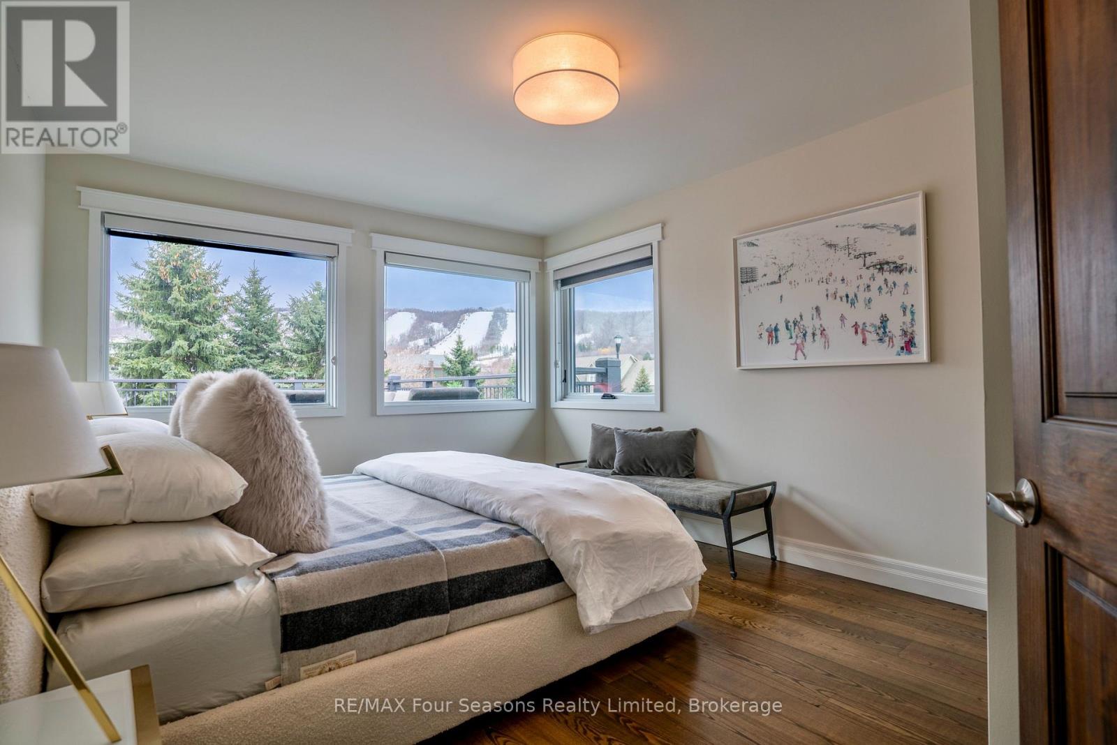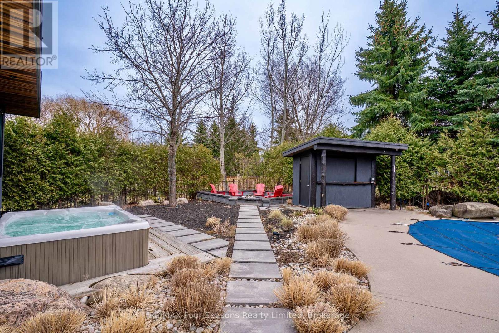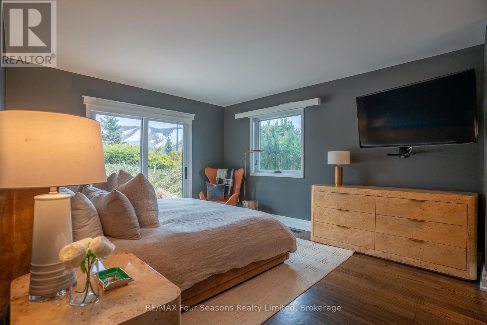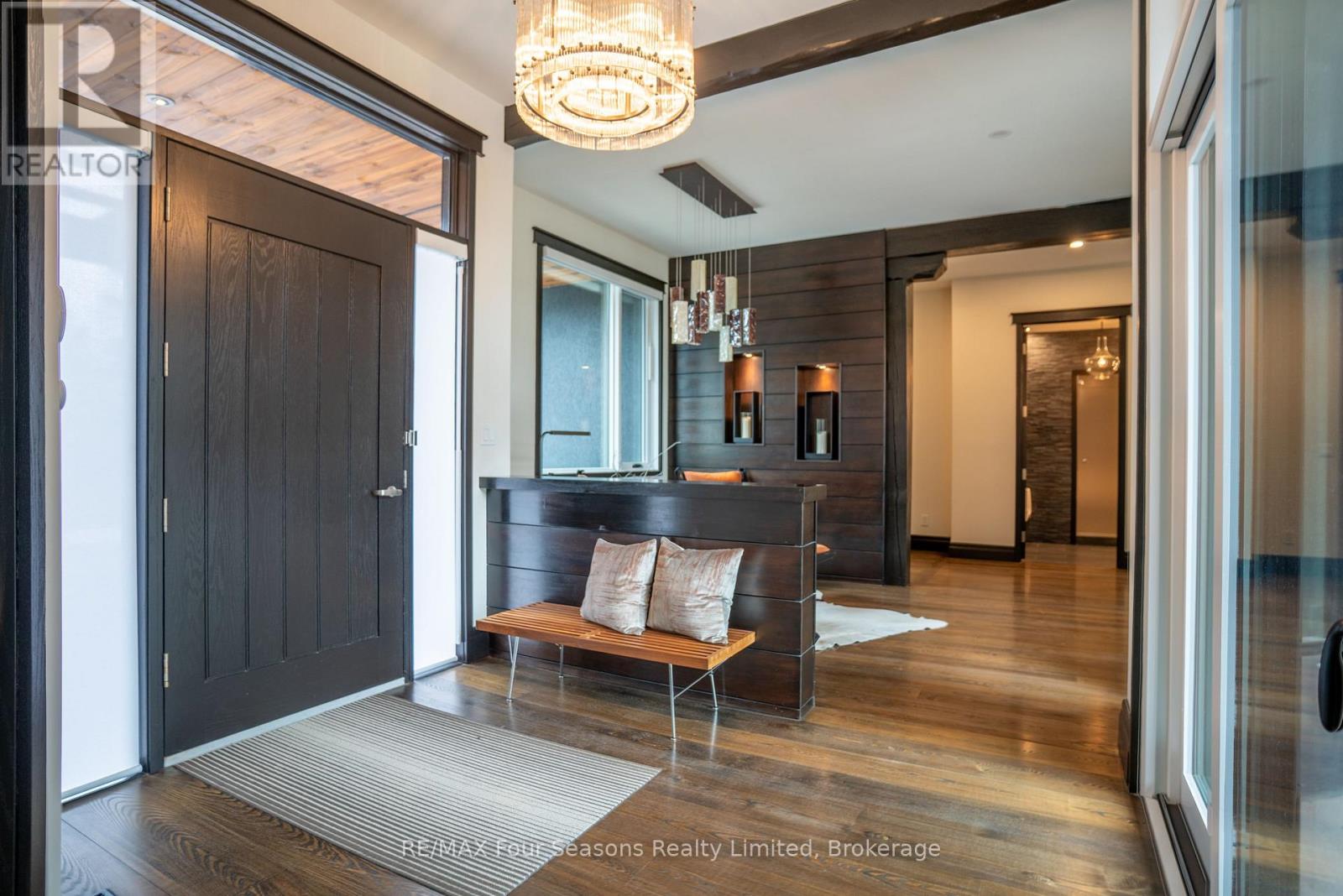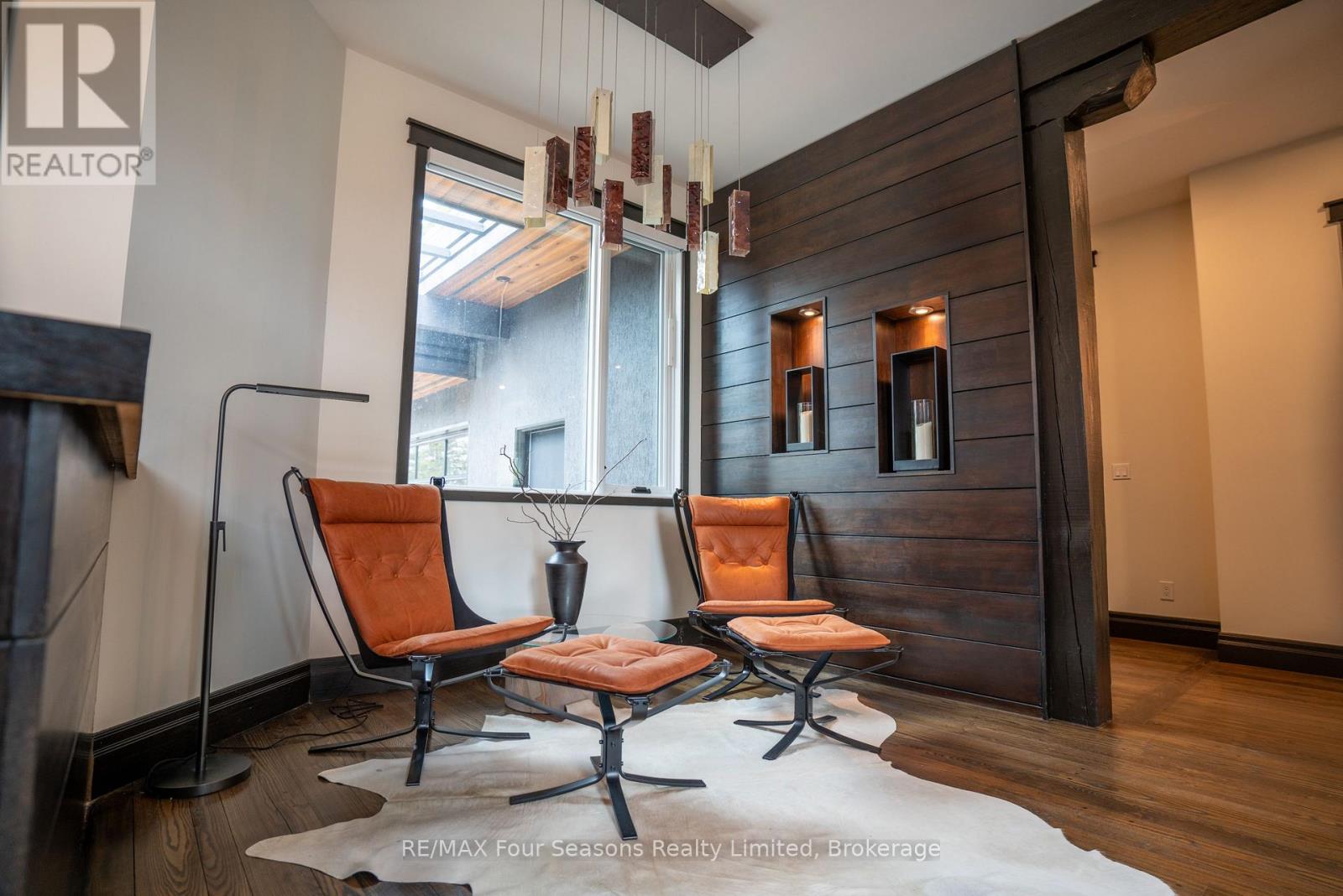 Set in prestigious Nipissing Ridge, steps to Craigleith and Alpine Ski Clubs, this exceptional modern chalet, built by custom builders Absolute Craftsmen, offers over 3,000 sq ft plus a professionally finished basement, designed for year-round living and entertaining. Offered turnkey with designer furnishings, the property is move-in ready. The open-concept main level is anchored by a striking glass staircase and features a custom chef's kitchen with a dramatic 14' island, sleek cabinetry, built-in wine fridge, Wolf gas range and Bosch double oven with convection microwave. The kitchen flows into a bright family room with a stone-surrounded gas fireplace, wall to wall bench with stone accents, a full glass rear wall, showcasing ski hill views from nearly every room. Ash flooring, wood beams, and a statement wood feature wall add warmth and style. Two glass-enclosed rooms provide flexible office or media space. The main floor primary suite includes a fully renovated spa-like ensuite with porcelain tile, large glass shower, and double vanity, and the main floor also boasts a large steam shower with bench seating. Upstairs offers three spacious bedrooms with built-in closets and a beautifully finished bath with double vanity and oversized glass shower. The fully finished basement features an open-concept design with steel beam construction, a custom bar, feature wall, and concrete-surround fireplace. Glass doors lead to a gym, laundry, storage, and a two-person infrared sauna, with walk-up access to the garage and a full bath. Enjoy panoramic ski hill views from the 20' x 40' upper deck. The private backyard features an inground pool, hot tub, gardens, and a dramatic firepit with a rare 400,000 BTU Montana burner. A pool hut adds storage. The heated two-car garage includes epoxy floors, custom cabinetry, counter-depth fridge, spray foam insulation, pot lights, and a modern glass door with battery backup. (id:64974)