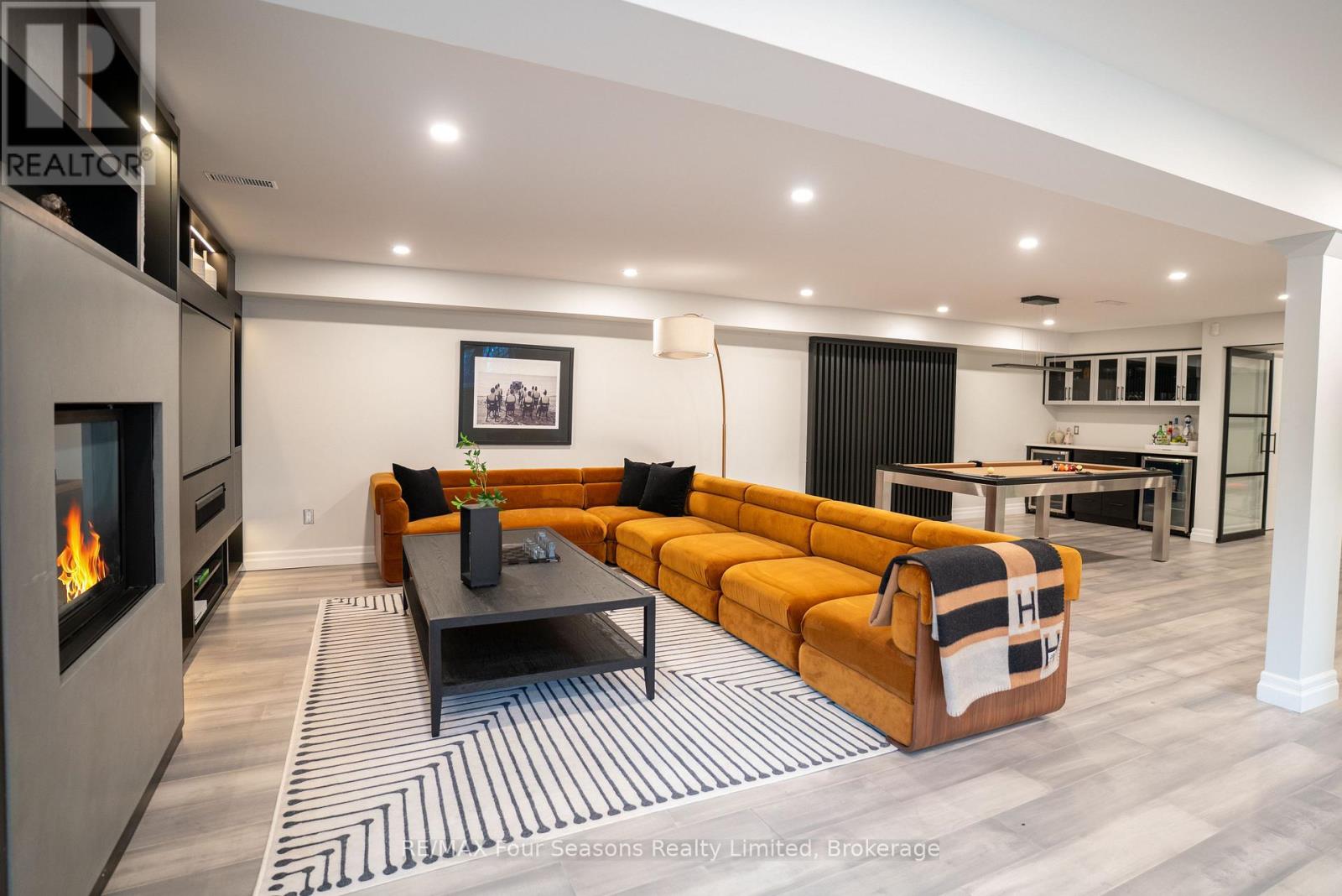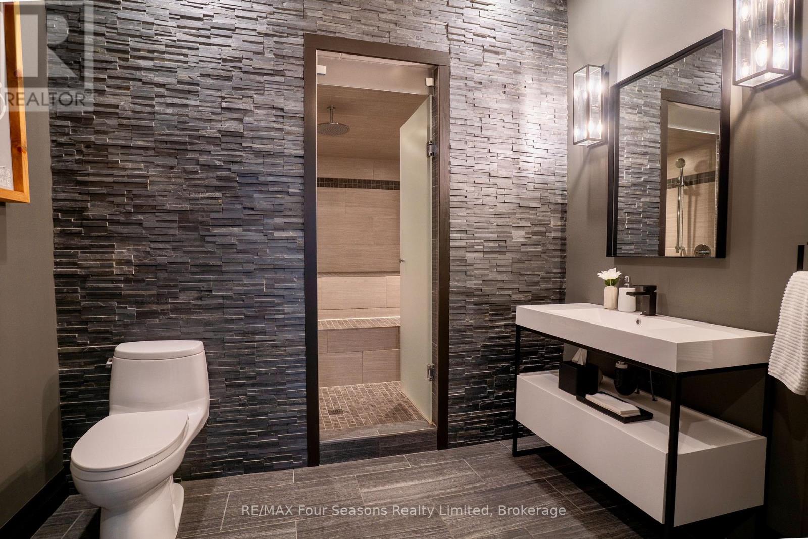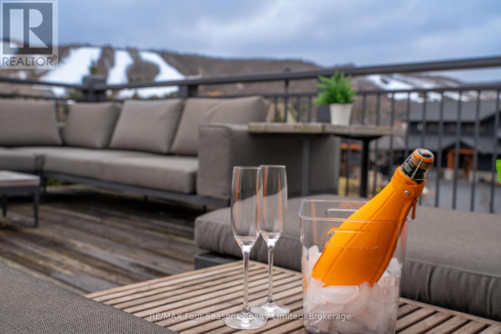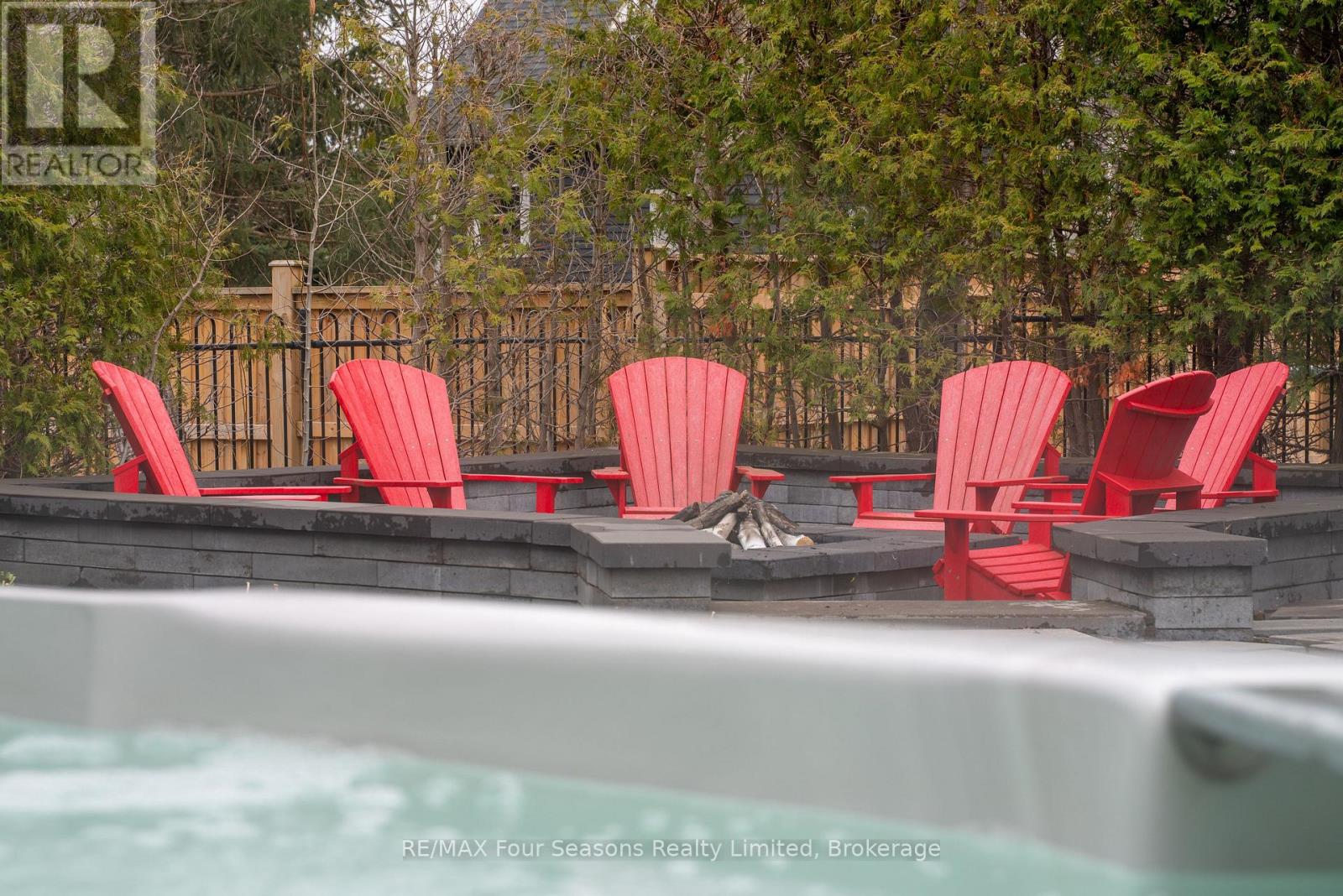 Set in prestigious Nipissing Ridge, steps to Craigleith and Alpine Ski Clubs, this exceptional modern chalet, built by custom builders Absolute Craftsmen, offers over 3,000 sq ft plus a professionally finished basement, designed for year-round living and entertaining. Offered turnkey with designer furnishings, the property is move-in ready. The open-concept main level is anchored by a striking glass staircase and features a custom chef's kitchen with a dramatic 14' island, sleek cabinetry, built-in wine fridge, Wolf gas range and Bosch double oven with convection microwave. The kitchen flows into a bright family room with a stone-surrounded gas fireplace, wall to wall bench with stone accents, a full glass rear wall, showcasing ski hill views from nearly every room. Ash flooring, wood beams, and a statement wood feature wall add warmth and style. Two glass-enclosed rooms provide flexible office or media space. The main floor primary suite includes a fully renovated spa-like ensuite with porcelain tile, large glass shower, and double vanity, and the main floor also boasts a large steam shower with bench seating. Upstairs offers three spacious bedrooms with built-in closets and a beautifully finished bath with double vanity and oversized glass shower. The fully finished basement features an open-concept design with steel beam construction, a custom bar, feature wall, and concrete-surround fireplace. Glass doors lead to a gym, laundry, storage, and a two-person infrared sauna, with walk-up access to the garage and a full bath. Enjoy panoramic ski hill views from the 20' x 40' upper deck. The private backyard features an inground pool, hot tub, gardens, and a dramatic firepit with a rare 400,000 BTU Montana burner. A pool hut adds storage. The heated two-car garage includes epoxy floors, custom cabinetry, counter-depth fridge, spray foam insulation, pot lights, and a modern glass door with battery backup. (id:64974)