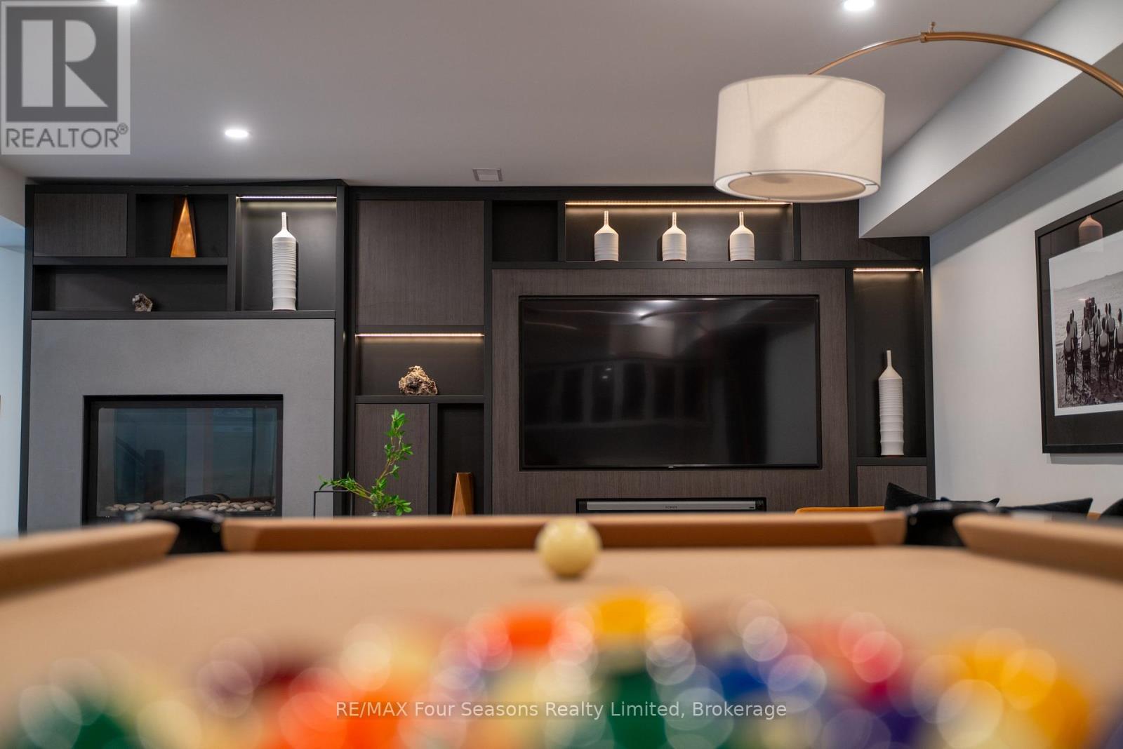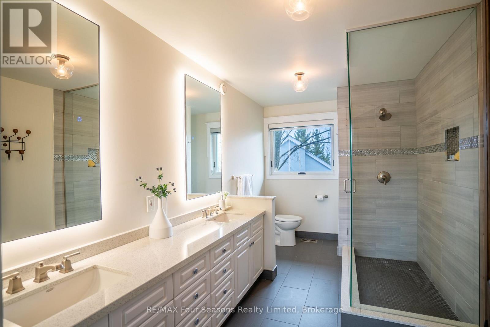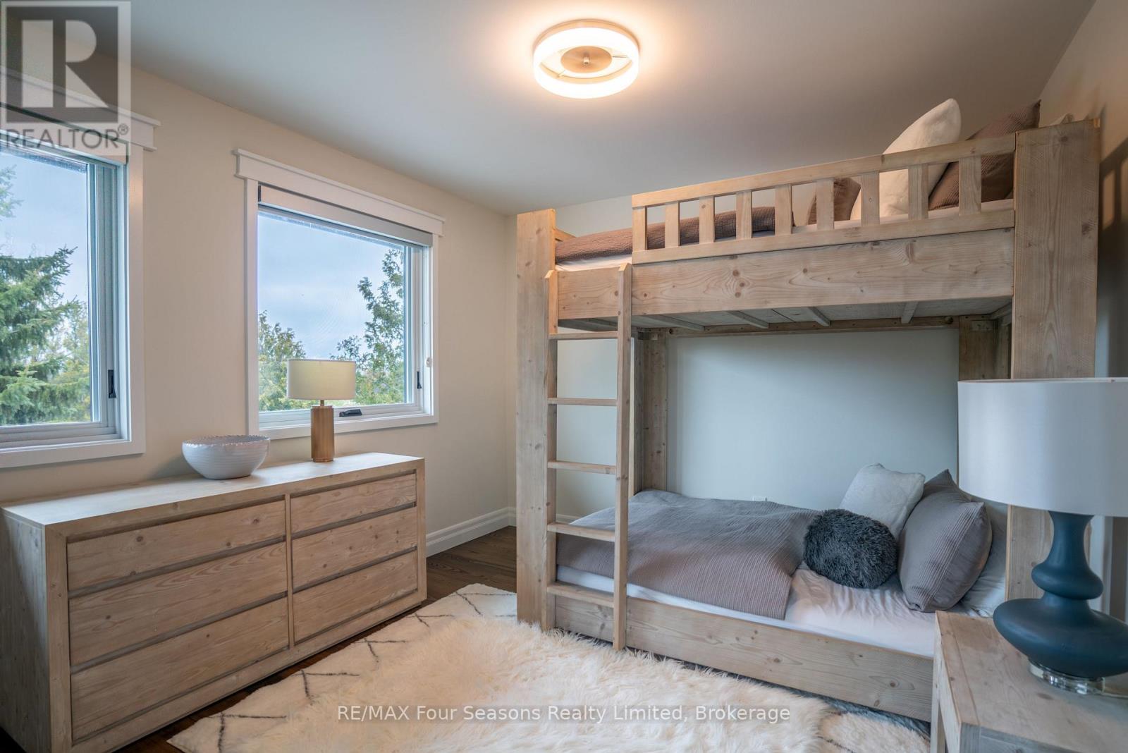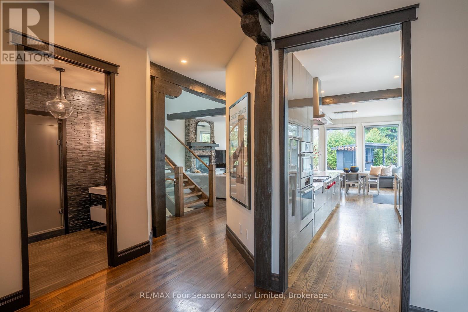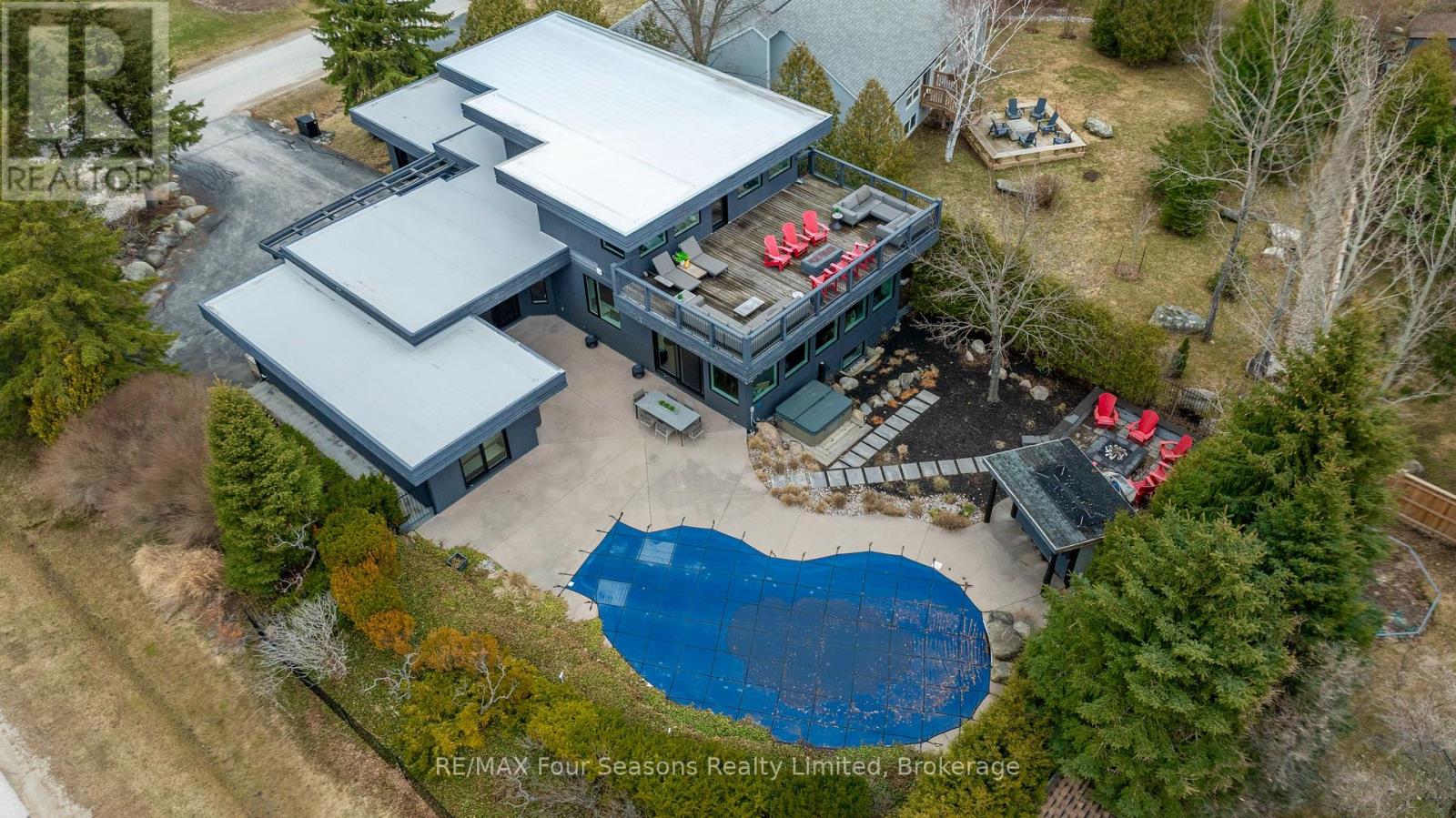 Set in prestigious Nipissing Ridge, steps to Craigleith and Alpine Ski Clubs, this exceptional modern chalet, built by custom builders Absolute Craftsmen, offers over 3,000 sq ft plus a professionally finished basement, designed for year-round living and entertaining. Offered turnkey with designer furnishings, the property is move-in ready. The open-concept main level is anchored by a striking glass staircase and features a custom chef's kitchen with a dramatic 14' island, sleek cabinetry, built-in wine fridge, Wolf gas range and Bosch double oven with convection microwave. The kitchen flows into a bright family room with a stone-surrounded gas fireplace, wall to wall bench with stone accents, a full glass rear wall, showcasing ski hill views from nearly every room. Ash flooring, wood beams, and a statement wood feature wall add warmth and style. Two glass-enclosed rooms provide flexible office or media space. The main floor primary suite includes a fully renovated spa-like ensuite with porcelain tile, large glass shower, and double vanity, and the main floor also boasts a large steam shower with bench seating. Upstairs offers three spacious bedrooms with built-in closets and a beautifully finished bath with double vanity and oversized glass shower. The fully finished basement features an open-concept design with steel beam construction, a custom bar, feature wall, and concrete-surround fireplace. Glass doors lead to a gym, laundry, storage, and a two-person infrared sauna, with walk-up access to the garage and a full bath. Enjoy panoramic ski hill views from the 20' x 40' upper deck. The private backyard features an inground pool, hot tub, gardens, and a dramatic firepit with a rare 400,000 BTU Montana burner. A pool hut adds storage. The heated two-car garage includes epoxy floors, custom cabinetry, counter-depth fridge, spray foam insulation, pot lights, and a modern glass door with battery backup. (id:64974)