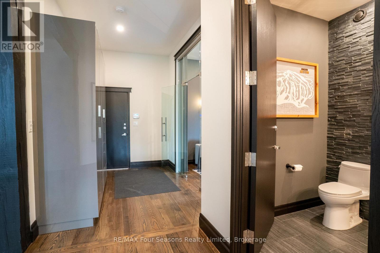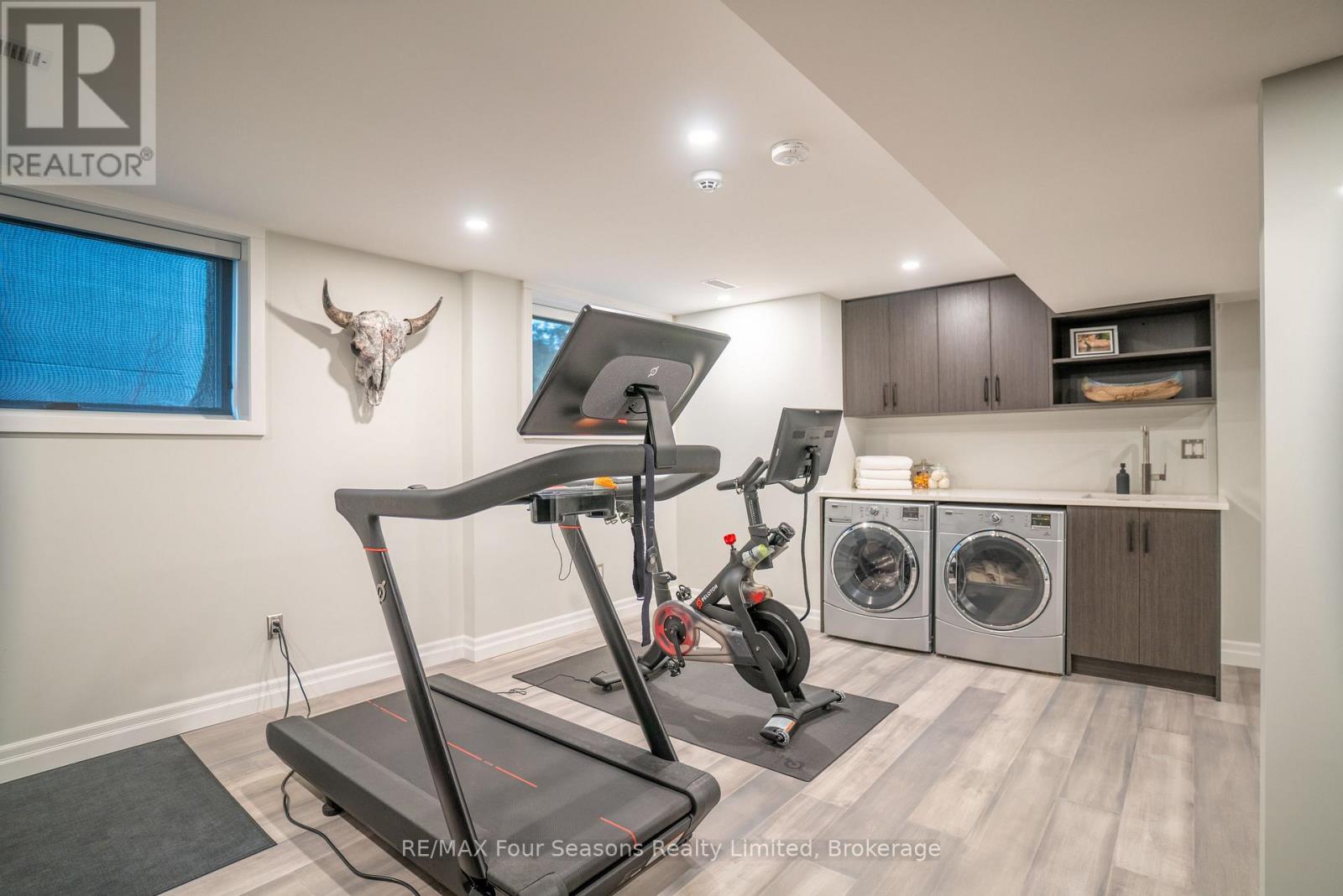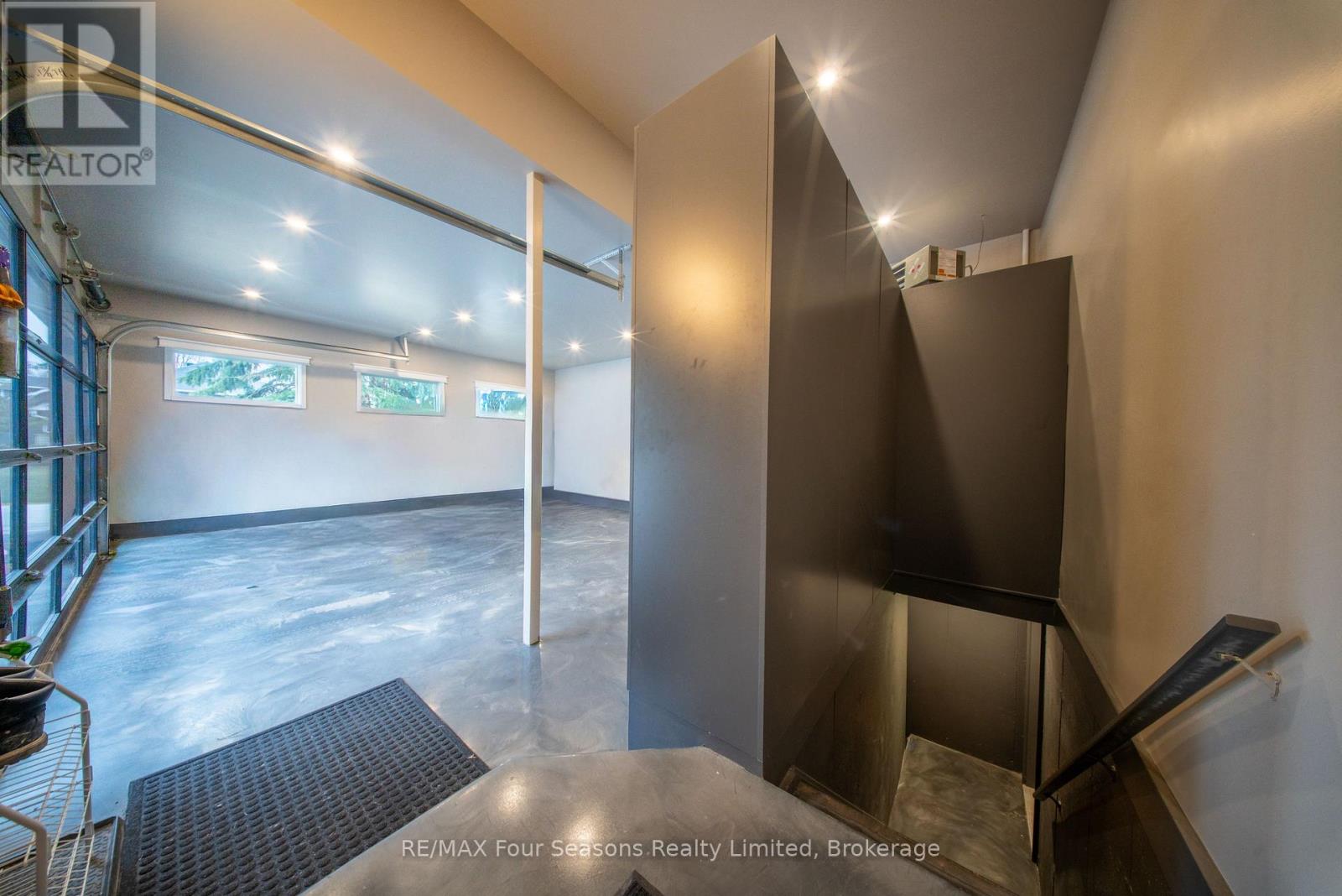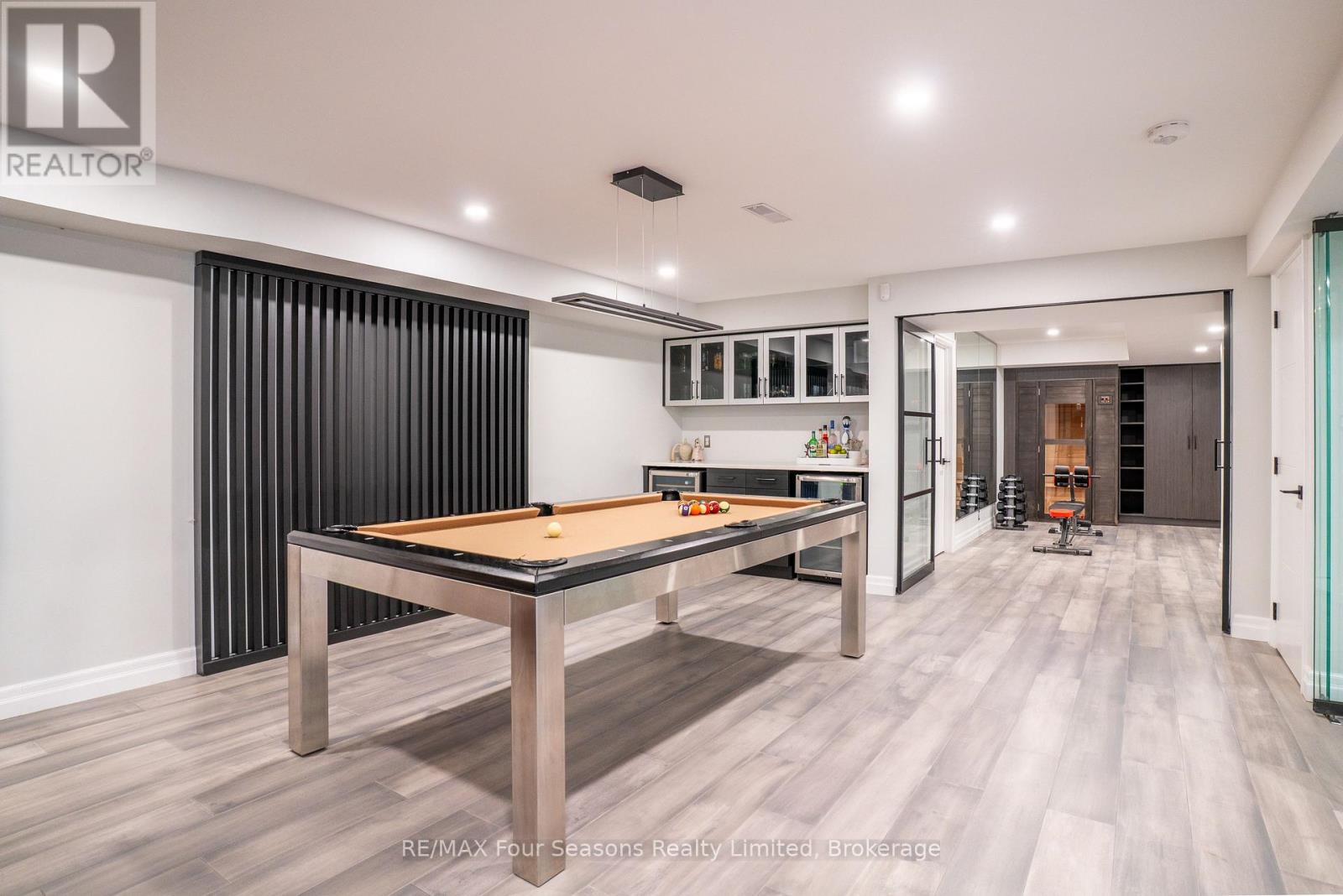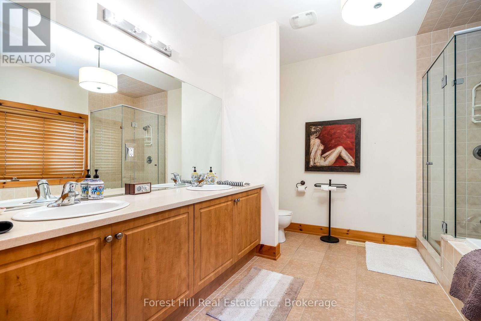 Set in prestigious Nipissing Ridge, steps to Craigleith and Alpine Ski Clubs, this exceptional modern chalet, built by custom builders Absolute Craftsmen, offers over 3,000 sq ft plus a professionally finished basement, designed for year-round living and entertaining. Offered turnkey with designer furnishings, the property is move-in ready. The open-concept main level is anchored by a striking glass staircase and features a custom chef's kitchen with a dramatic 14' island, sleek cabinetry, built-in wine fridge, Wolf gas range and Bosch double oven with convection microwave. The kitchen flows into a bright family room with a stone-surrounded gas fireplace, wall to wall bench with stone accents, a full glass rear wall, showcasing ski hill views from nearly every room. Ash flooring, wood beams, and a statement wood feature wall add warmth and style. Two glass-enclosed rooms provide flexible office or media space. The main floor primary suite includes a fully renovated spa-like ensuite with porcelain tile, large glass shower, and double vanity, and the main floor also boasts a large steam shower with bench seating. Upstairs offers three spacious bedrooms with built-in closets and a beautifully finished bath with double vanity and oversized glass shower. The fully finished basement features an open-concept design with steel beam construction, a custom bar, feature wall, and concrete-surround fireplace. Glass doors lead to a gym, laundry, storage, and a two-person infrared sauna, with walk-up access to the garage and a full bath. Enjoy panoramic ski hill views from the 20' x 40' upper deck. The private backyard features an inground pool, hot tub, gardens, and a dramatic firepit with a rare 400,000 BTU Montana burner. A pool hut adds storage. The heated two-car garage includes epoxy floors, custom cabinetry, counter-depth fridge, spray foam insulation, pot lights, and a modern glass door with battery backup. (id:64974)