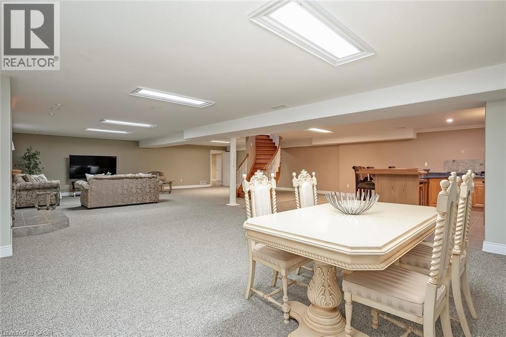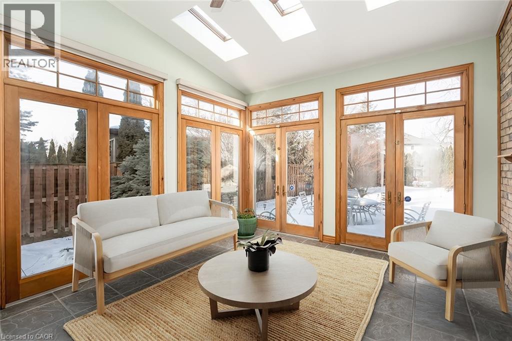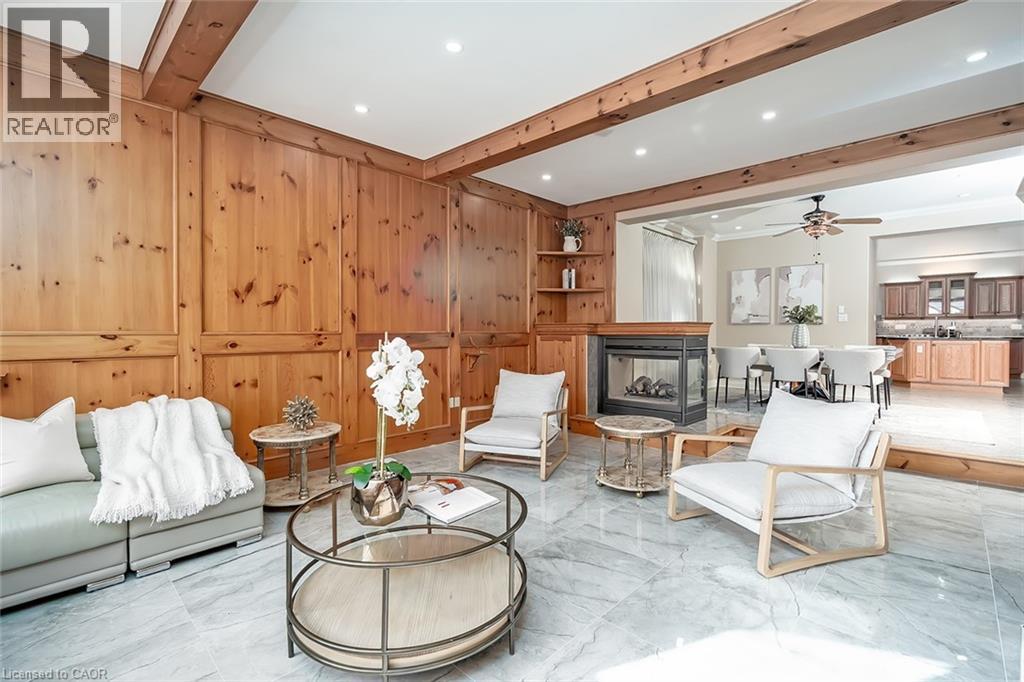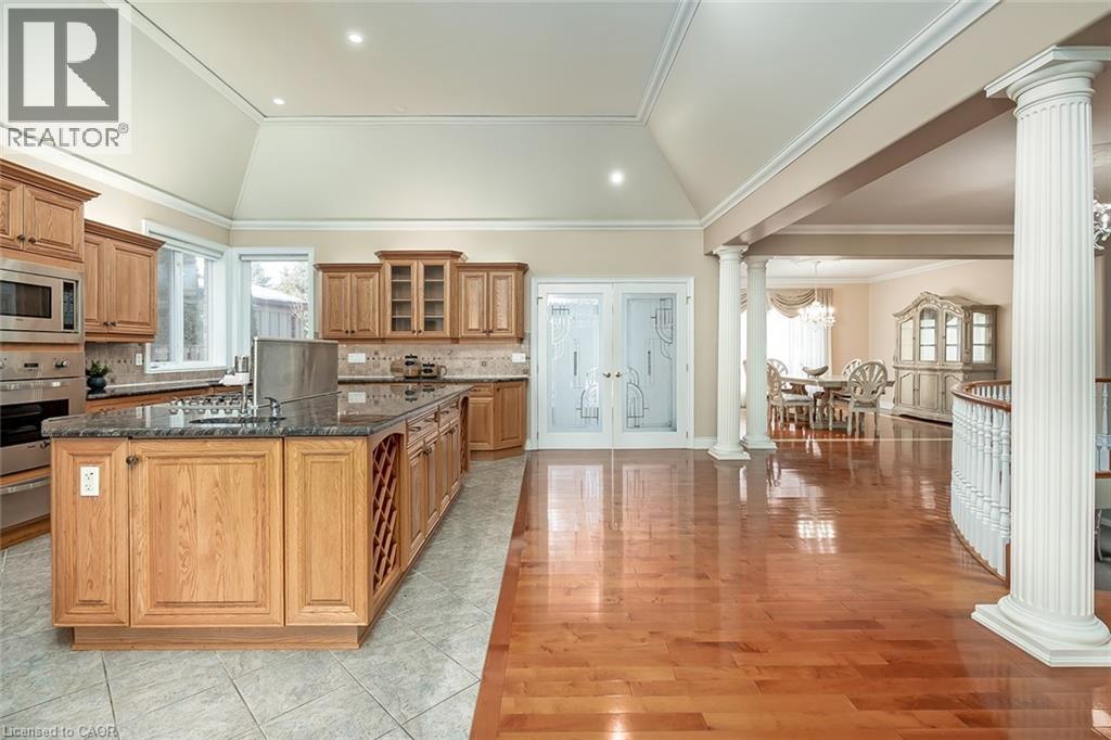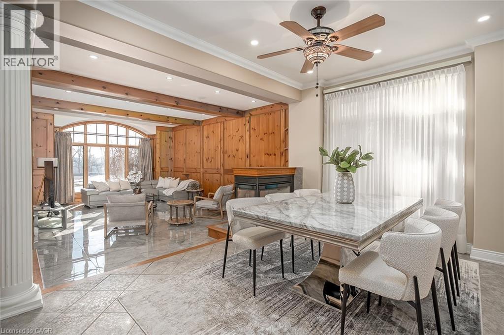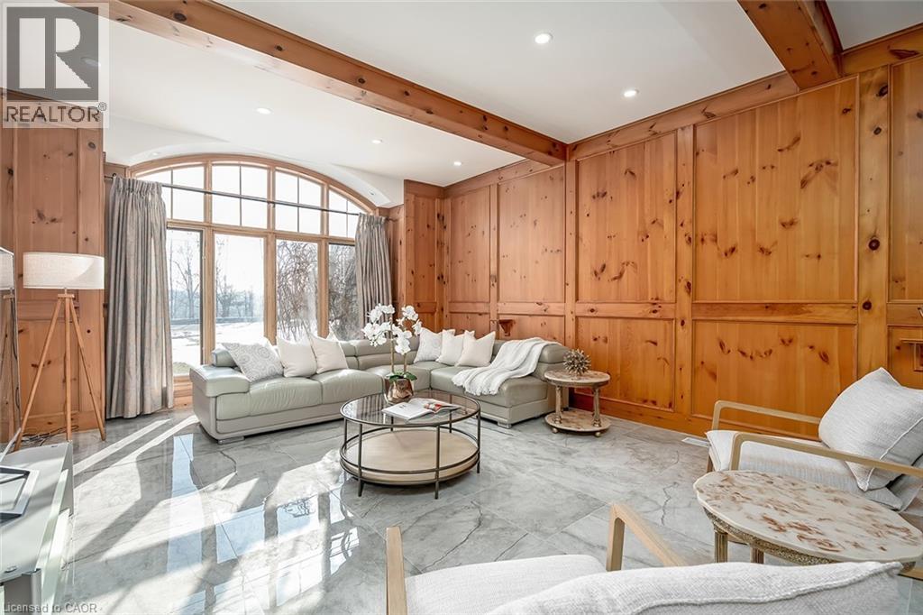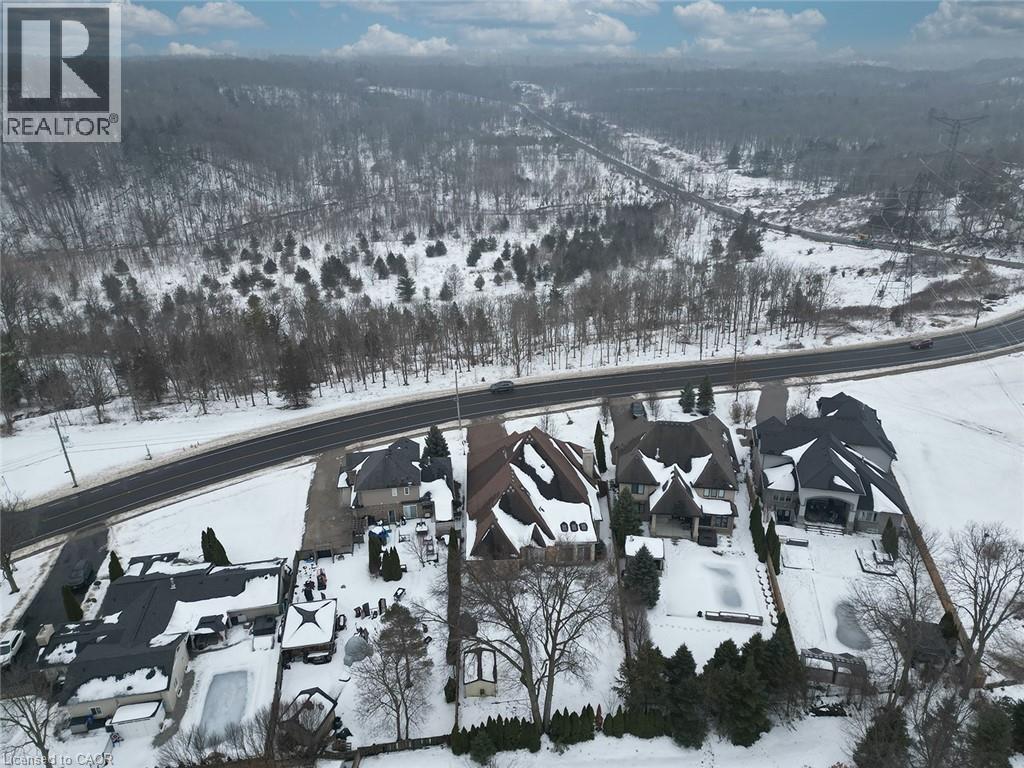 Set on an impressive 75.93 x 177.82 ft lot overlooking breathtaking views of Shorthills Provincial Park, this exceptional 2+2 bedroom, 3 bathroom residence offers over 5900 sq ft of beautifully finished living space designed for both everyday comfort and upscale entertaining. This beautiful bungalow’s exterior is complemented by an interlock driveway with parking for six plus a double car garage. Inside, a grand front foyer with soaring 14-foot ceilings, sets the tone. Elegant formal and casual spaces flow seamlessly, including a sunken living room with wood paneled wall and beams, a three-sided gas fireplace, a refined dining room with hardwood inlay, and a chef-inspired kitchen with vaulted ceilings, premium built-in appliances, expansive island, walk-in pantry and breakfast area. A sun-filled sunroom with skylights and French doors opens to the private backyard patio. The main-level primary retreat features hardwood floors, patio walkout, walk-in closet and a spa-like six-piece ensuite. A second bedroom and bathroom are perfect for guests. The finished lower level is ideal for entertaining or multi-generational living, offering a large recreation room with fireplace, wet bar, wine cellar, office, two additional bedrooms, bathroom, sitting/media room, and a walk-up to the garage. Large yard with plenty of green space, this home is minutes to wineries, trails, schools, amenities, and highway access—luxury living surrounded by nature, yet close to it all. (id:64974)