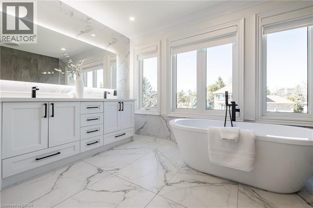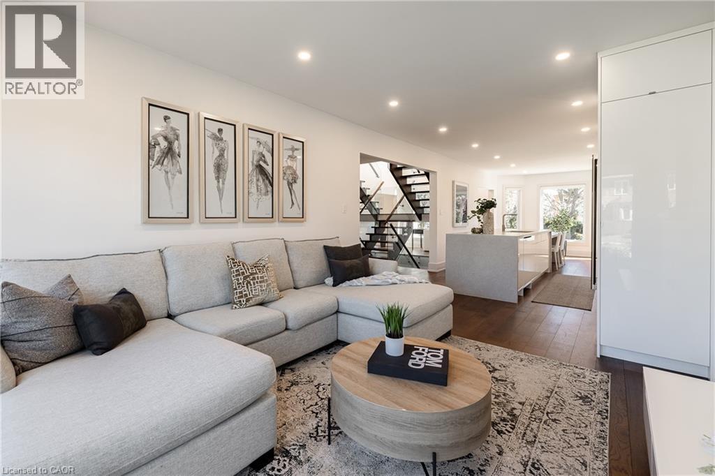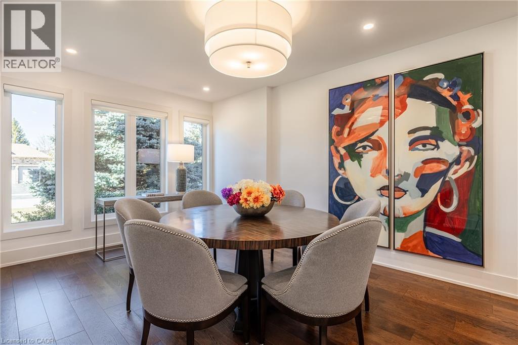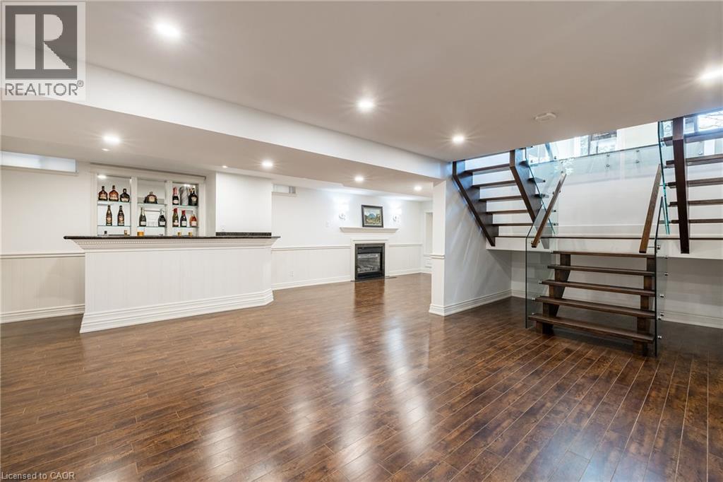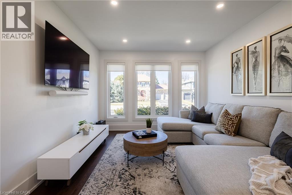 Refined traditional family home in the coveted Fairway Hills community in Glen Abbey. Surrounded by natural landscapes + adjacent to the world-renowned Glen Abbey golf course. This executive residence epitomizes modern elegance + refined comfort, offering a sophisticated lifestyle. Renovated w/a refined modern interior w/clean lines, expansive glazing + upscale finishes. Clever layout meets the needs of the modern buyer where principal living areas are connected, but sufficiently defined to provide privacy when desired. Statement feature wall with a contemporary open fireplace separates the dining room + living room & an open den provides a breezeway to the kitchen. Optimizing form + function the custom kitchen will appease the chef in the family with ample prep + cook space, top appliances, generous storage + an integrated table to enjoy meals together. The adjacent mudroom + laundry keep you organized. The main stairs are an architectural gem w/open risers + glass rails + partitions, creating a focal point while also allowing the natural light to flow through. Primary retreat w/double entry doors, expansive sleeping quarters, dressing room + extra closet + a lavish ensuite. The additional 3 bedrooms are generously sized + share the luxurious main bath. Finished lower expands the living space, featuring a cozy family lounge, a wet bar with connected games space and a bonus area that could function as a 5th bedroom + office with ensuite bath. Family sized with 4+1 beds & 3.5 baths. Rear yard expertly landscaped w/multiple stone lounges to accommodate family get-togethers + social events & beautiful framing gardens w/mixed tree canopy provided ample privacy. Offering tremendous curb appeal in a coveted Glen Abbey pocket, this upscale family home is an ideal choice. (id:64974)