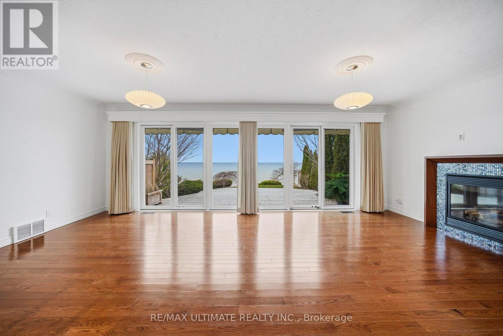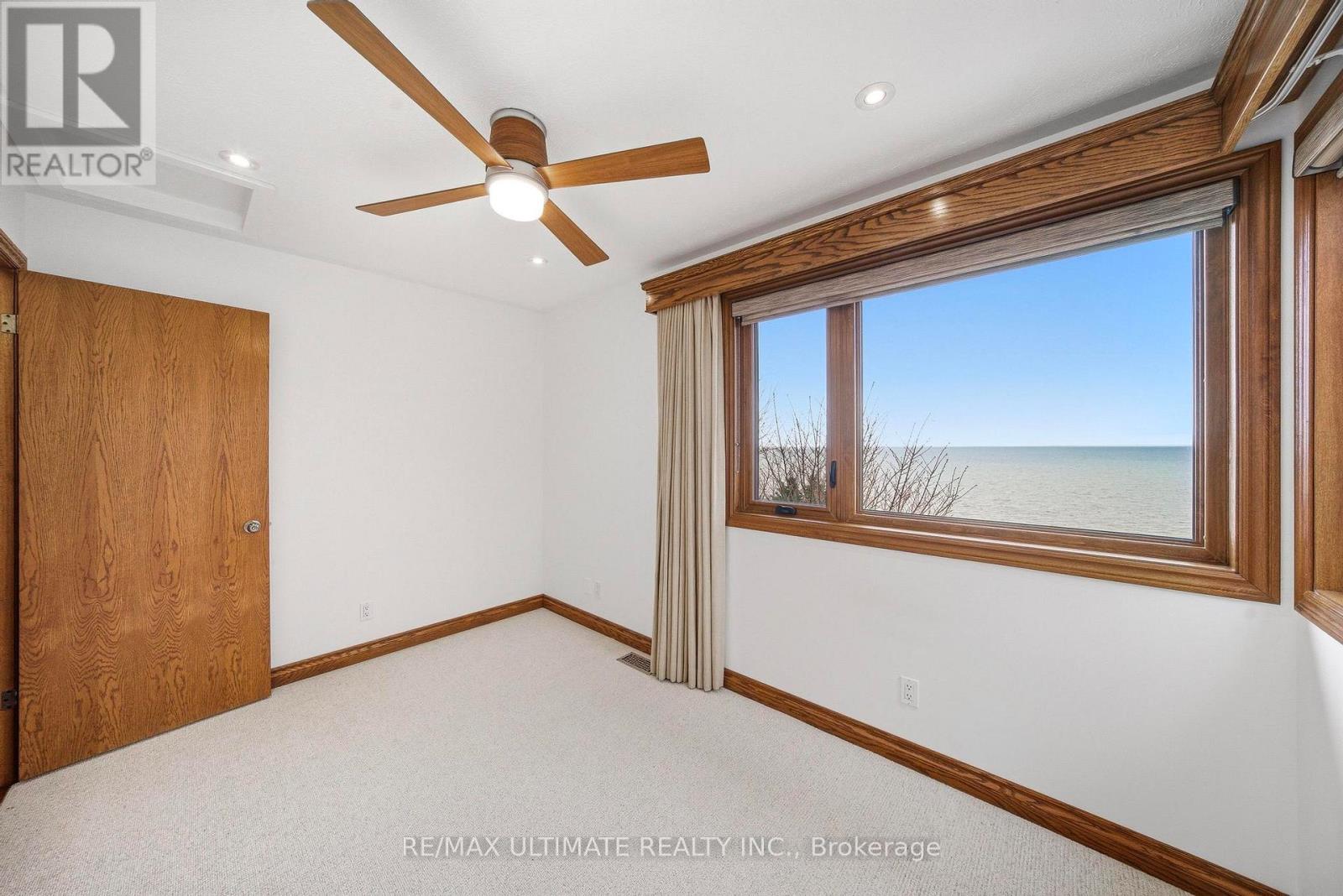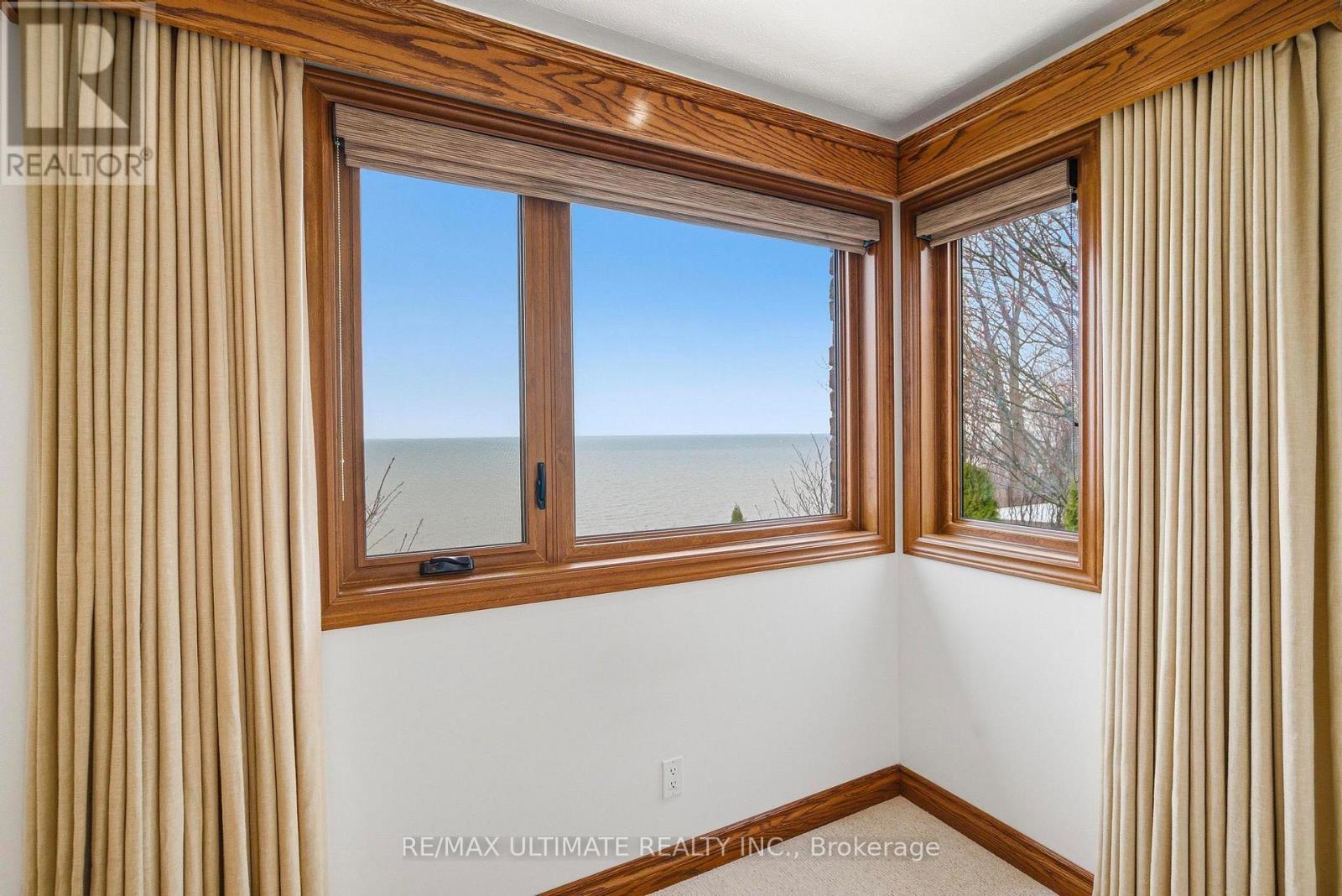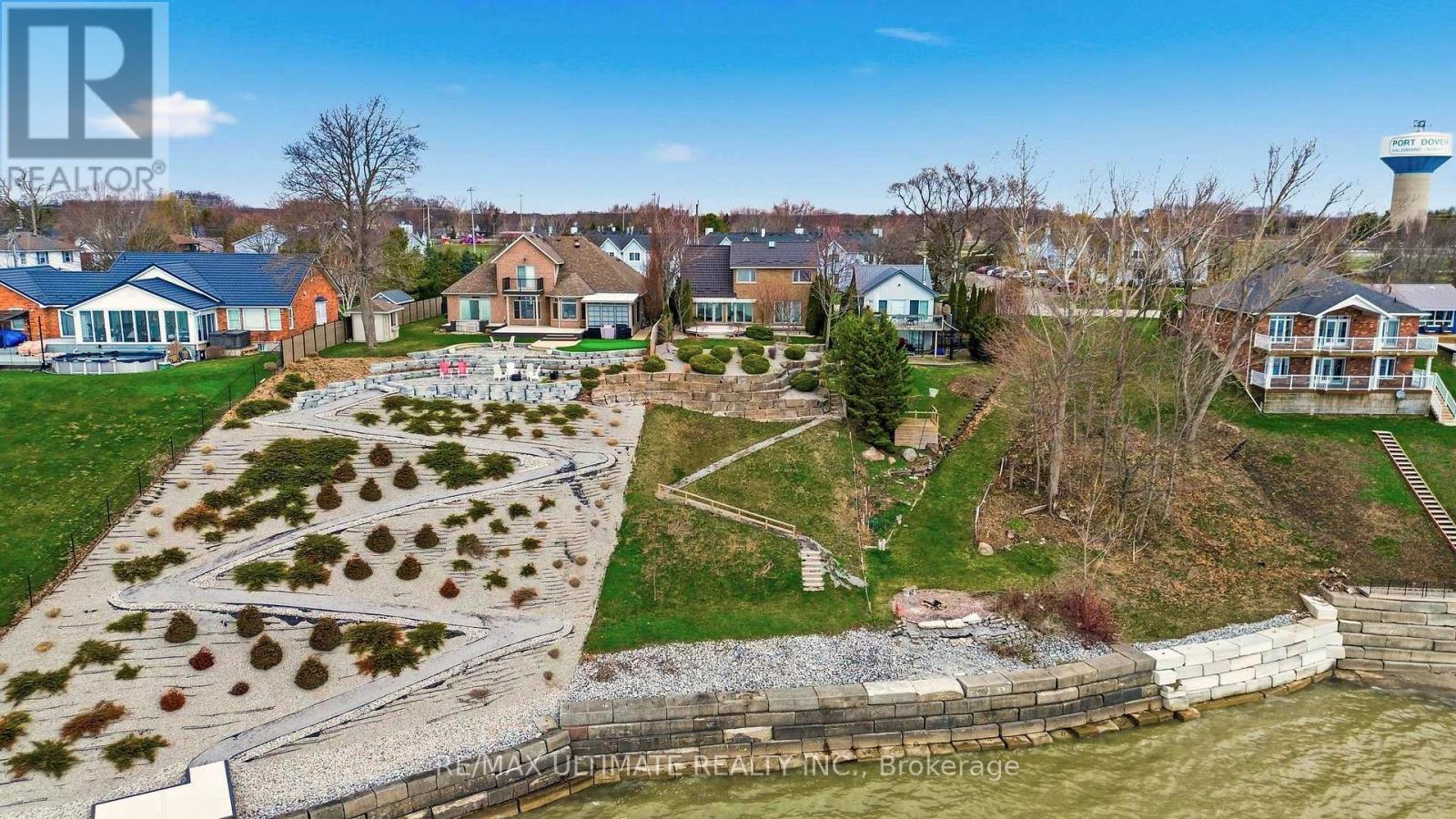 Welcome to this exceptional waterfront home in Port Dover, offering nearly 2,500 square feet of meticulously finished living space, all-day sun, and lake views from nearly every room. Situated on one of the most desirable waterfront lots on a quiet cul-de-sac, just a short walk to the beach, marina, and downtown, this custom-built three-bedroom, four-bathroom home features all bedrooms above grade, including a main-floor bedroom suite with lake views, an ensuite bath, and a walk-in closet. The main living areas are oriented toward the lake, with Pella sliding glass doors spanning the rear wall and opening to a private outdoor deck with a retractable awning, creating seamless indoor and outdoor living. The deck and lawn area sit on a rare flat portion of the backyard, created by the armour stone retaining wall. The kitchen features granite counters and built-in Miele appliances that blend seamlessly with the cherry wood cabinetry, accented by a vaulted ceiling. Hickory hardwood flooring runs throughout, complemented by a natural gas fireplace and a main-floor powder room. Upstairs, two bedrooms feature picture-perfect lake views from corner windows, along with custom wool carpeting for added comfort. A four-piece bathroom with in-floor heating and a skylight completes the upper level. The professionally finished basement features engineered hardwood flooring throughout, a laundry room with a Miele washer and dryer and built-in cabinetry, a three-piece bathroom, and a large recreation area. Spray foam insulation enhances overall comfort and efficiency. The two-car garage includes a Tesla charger, with a double-wide driveway providing parking for four cars. The landscaped grounds include cherry trees, Japanese maples, and mature cedars for privacy, along with armour stone and shoreline protection. Additional upgrades include a 200A electrical panel, Rinnai tankless water heater, sump pump, second-floor windows, Pella glass doors, and a metal roof with warranty. (id:64974)