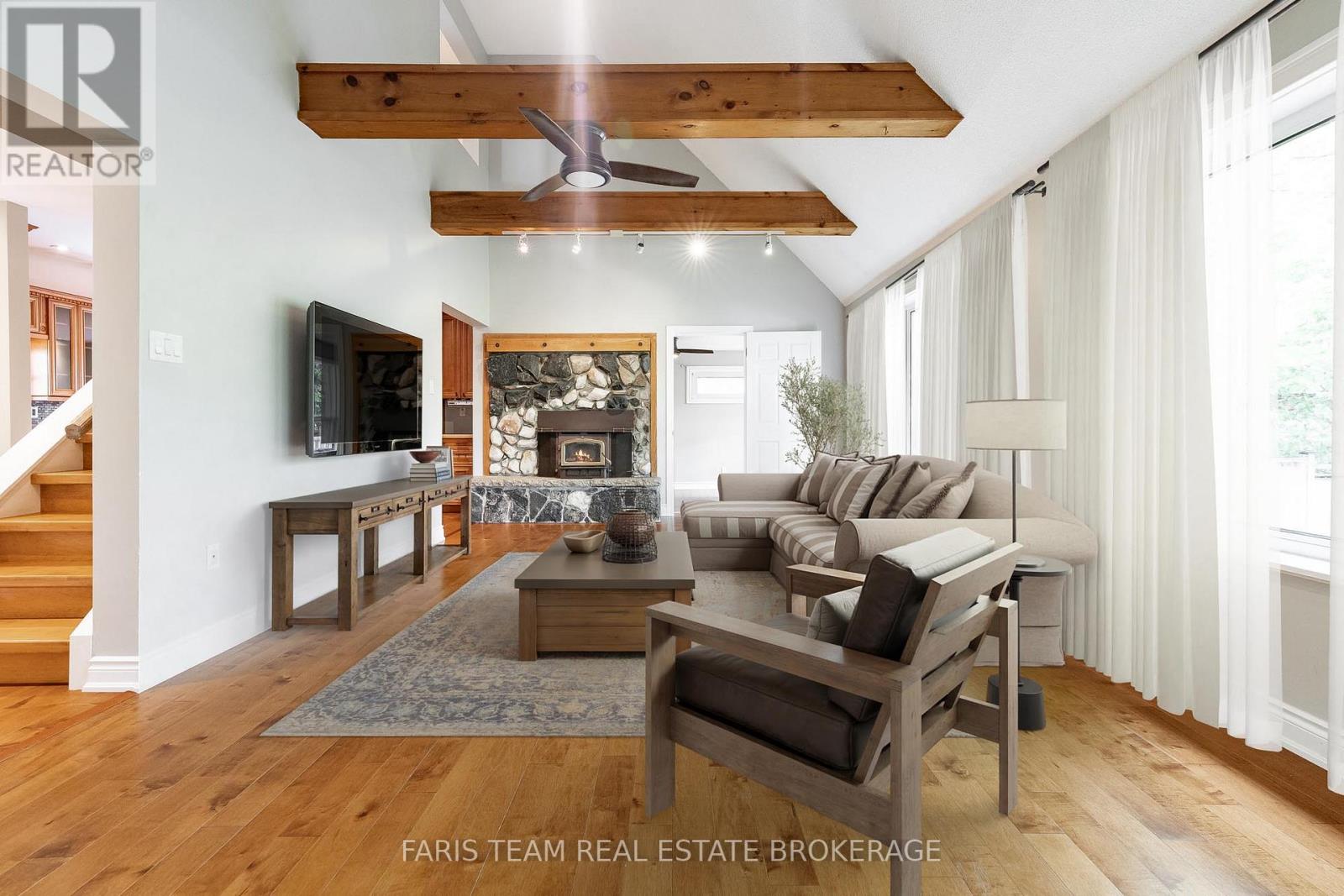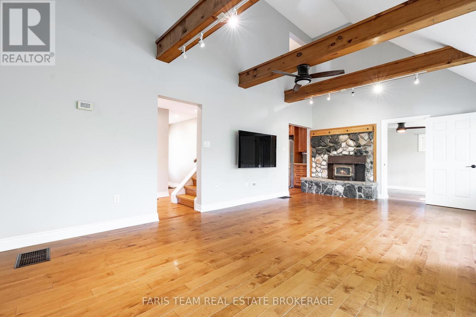 Top 5 Reasons You Will Love This Home: 1) Enjoy a generous 50'x230' lot with over 50' of waterfront, spacious backyard areas perfect for entertaining, relaxing, or heading down the stairs to kayak, boat, fish, or simply take in the river views 2) This detached 2-storey home with a finished basement features a welcoming covered front deck, main level laundry, a bright bedroom with walkout to the backyard, and a renovated4-piece bathroom with a soaker tub and separate shower for added comfort 3) The kitchen includes stainless-steel appliances, a pantry, and dining space, while the living room offers a cozy wood fireplace with a stone surround and oversized windows showcasing peaceful backyard and river views; upstairs, the primary bedroom has a walkout to a large balcony overlooking the water, plus a third bedroom and another 4-piece bathroom, great for guests or extended family 4) Expansive basement hosting a large family room, a recreation area with rough-in for a kitchen or wet bar, a fourth bedroom, another full bathroom, and an oversized cold room ideal for extra storage 5) Set on a quiet street ending in a cul-de-sac, this home offers peace and privacy close to schools, shops, golf, ski hills, and the sandy beaches of Georgian Bay, while still being a convenient commute to Barrie and the GTA. 1,743 above grade sq.ft. plus a finished basement. *Please note some images have been virtually staged to show the potential of the home. (id:64974)