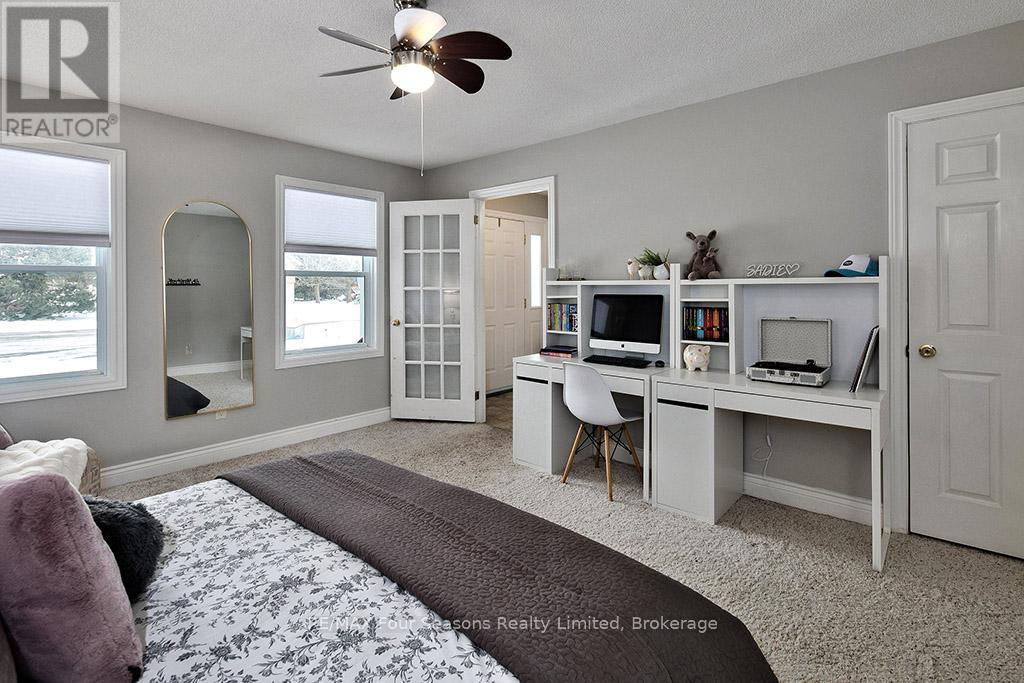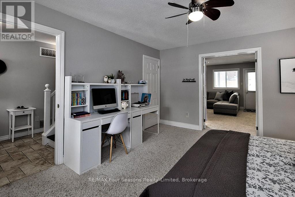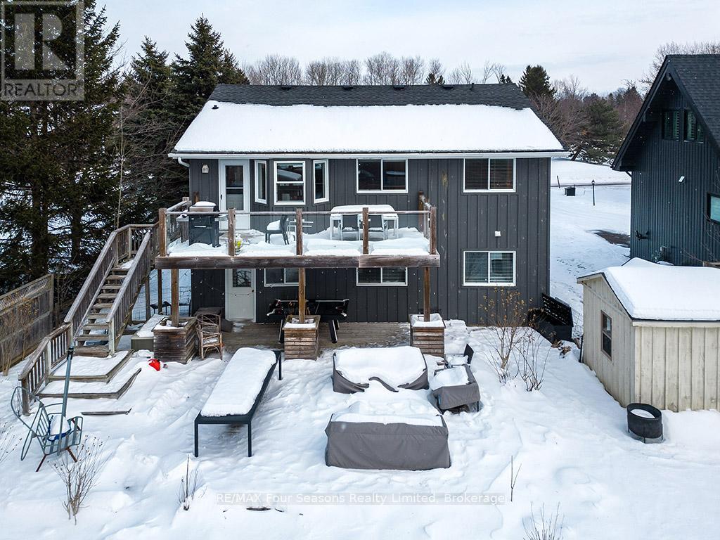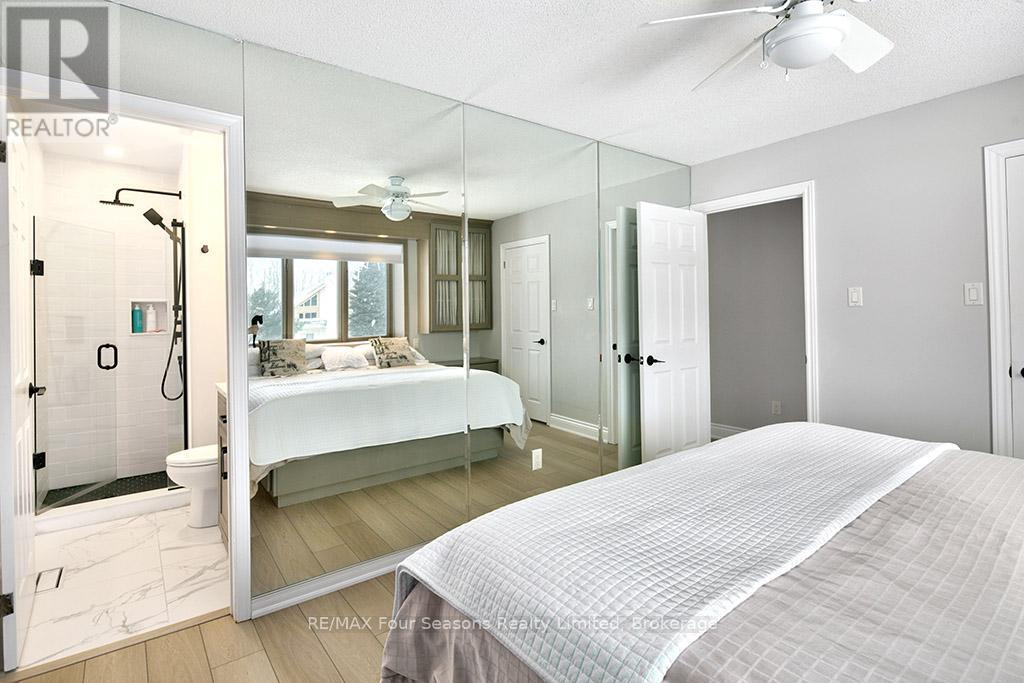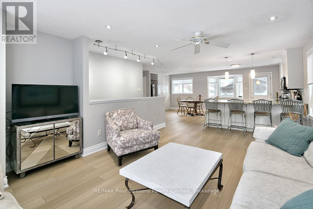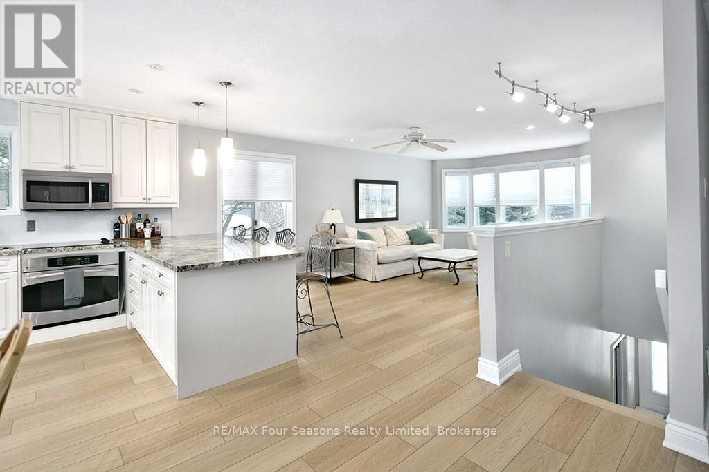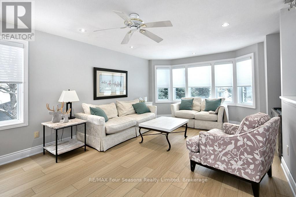 Recently renovated! This bright and inviting 4-bedroom, 3-bathroom home is tucked away on a quiet cul-de-sac, just steps from Blue Mountain Village and only minutes to ski clubs, beaches, golf, and trails, perfect for year-round living and recreation. Upstairs, the open-concept kitchen, dining, and living area is filled with natural light and mountain views. Designed with a reverse floor plan to capture the best mountain views, this home has brand new engineered white oak flooring throughout the entire upper level and offers space, comfort, and convenience for today's active lifestyle. The newly redesigned kitchen has tons of space for hosting large family gatherings, boasts granite countertops, new microcement backsplash, new windows and direct access to the upper deck for effortless BBQs and dining al fresco while enjoying sunsets over the slopes. The living room's abundance of windows creates a warm and welcoming gathering space. The upper level also hosts the primary suite with a sleek, renovated 3-piece ensuite, plus a second bedroom and an additional 4-piece bathroom. The main level features a spacious recreation room with a cozy gas fireplace, two bedrooms, a full 4-piece bath, and a laundry room with a walkout to the backyard and patio, ideal for indoor-outdoor living in every season. Outdoor enthusiasts will appreciate the proximity to hiking, cycling, tennis, and golf, along with the nearby beaches of Georgian Bay. Just 10 minutes to Collingwood, 15 to Thornbury, or a short stroll to Blue Mountain Village for dining, shopping, and entertainment, this property offers the perfect blend of lifestyle and location. (id:64974)