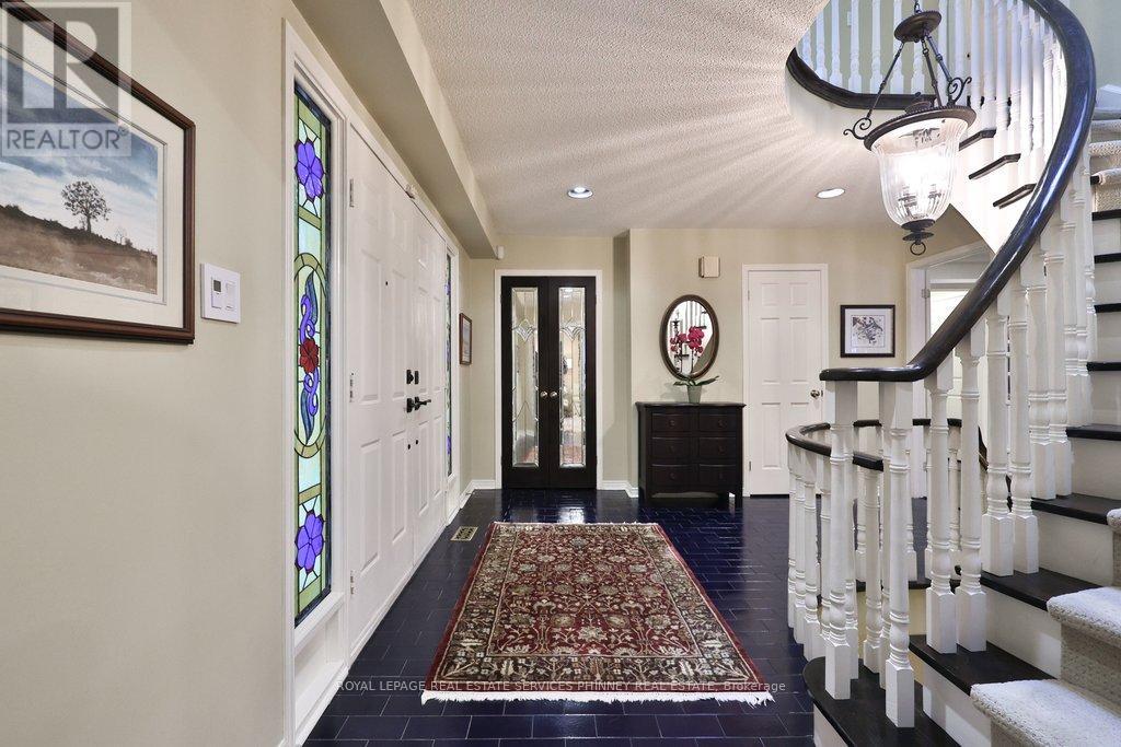 Experience the charm of this exquisite two-story family home, nestled on a private court and backing onto a tranquil ravine setting. Upon entering, you're welcomed by a grand foyer featuring an enchanting winding staircase. The spacious open-concept family room boasts large windows that offer spectacular views of the ravine, creating a serene atmosphere. The kitchen is a chef's dream, equipped with top-of-the-line appliances, a generous island, and a roomy eat-in area that seamlessly connects to a large back patio, perfect for outdoor entertaining. A separate living room flows effortlessly into the formal dining room, which also grants direct access to the yard, enhancing the ease of hosting gatherings. The main floor office provides an ideal space for remote work. Primary bedroom offers ample space for a cozy lounge area, balcony overlooking ravine and includes a luxurious six-piece bathroom. Upstairs, you'll also find two additional bedrooms and another bathroom, ensuring comfort for family and guests alike. The lower level features an additional bedroom and a three-piece bath, perfect for visitors. A large recreation room, complete with a wet bar and access to the yard, makes summer functions a breeze. Situated in a great school district and just steps away from all amenities, this home is also conveniently close to the GO station and the picturesque Jack Darling Park and lake. EXTRAS- outside storage with loft and two fireplaces. (id:64974)