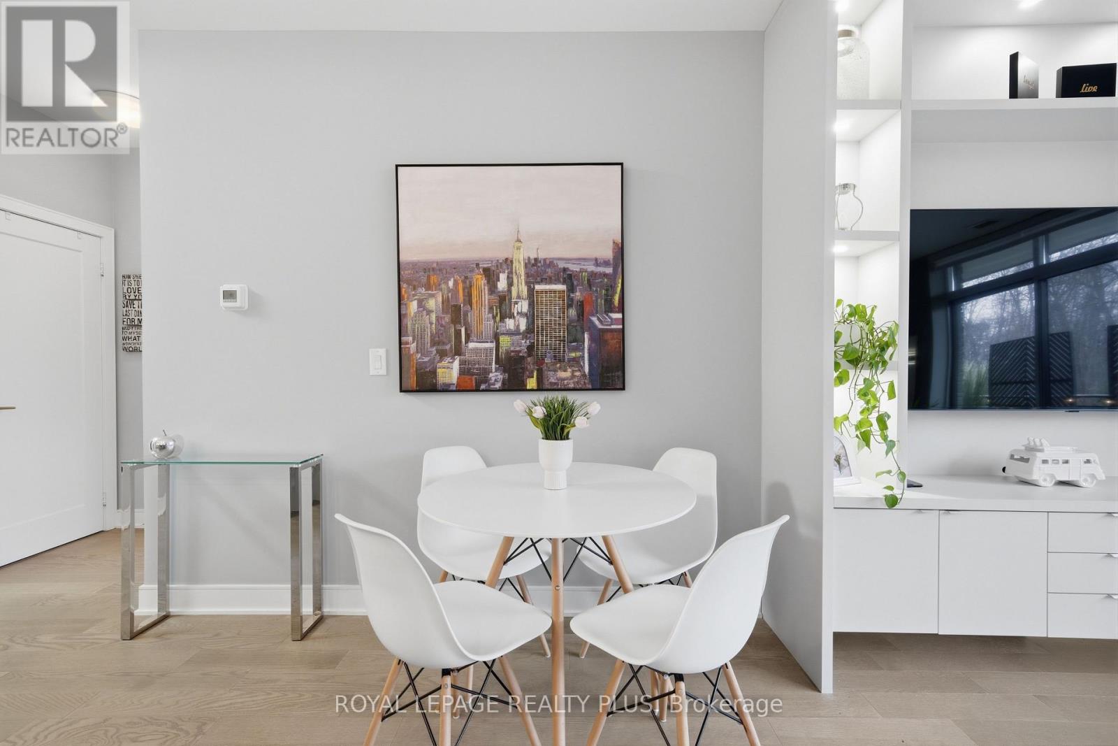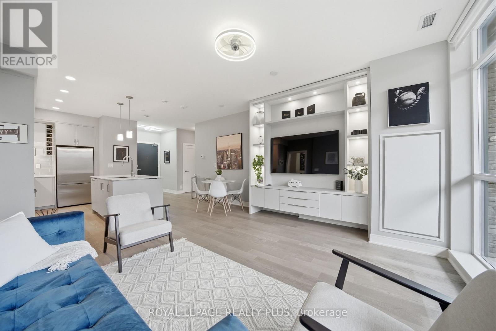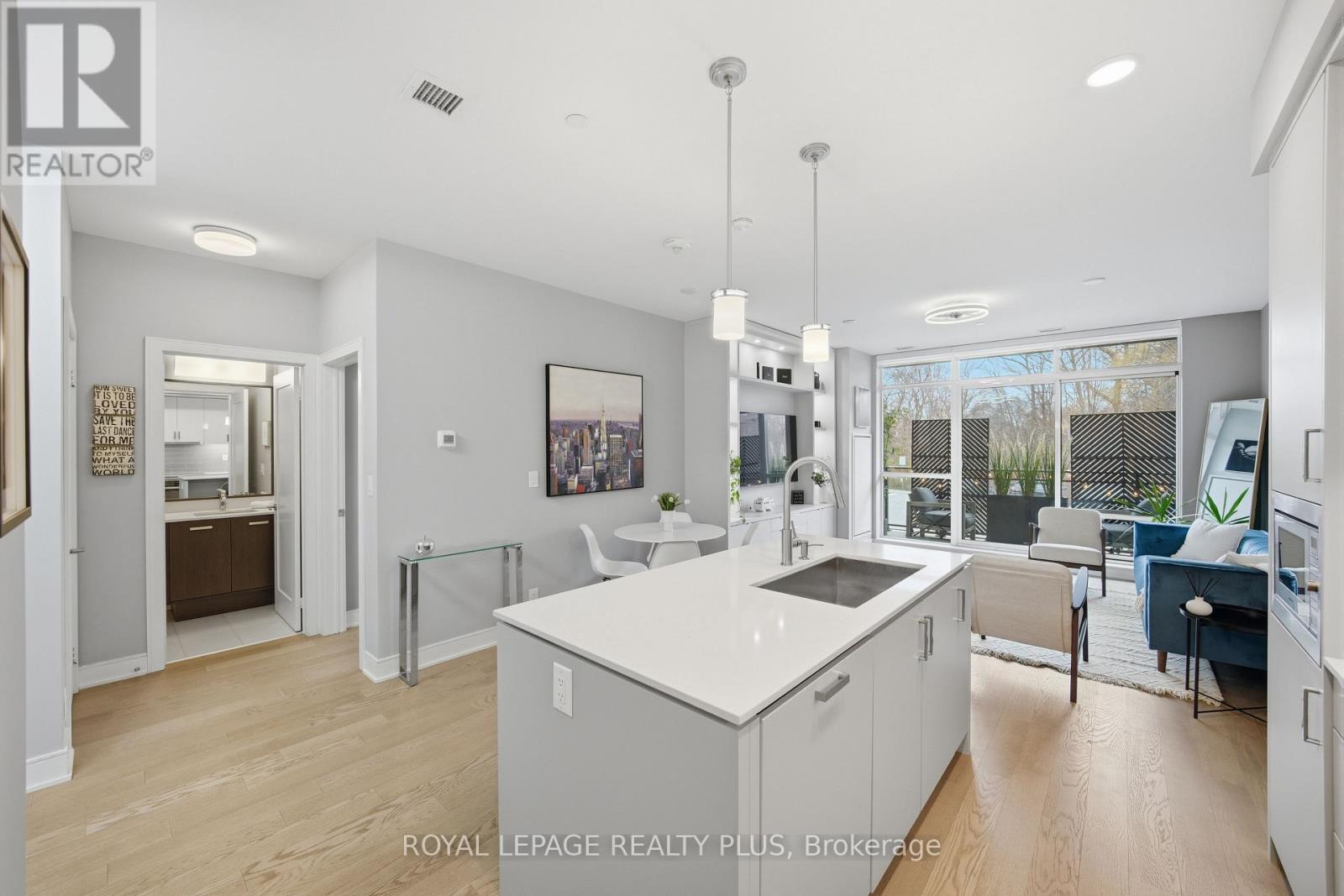 Situated in one of South Mississauga's most desirable communities, this sunny west-facing suite has unobstructed views of parkland and offers a rare blend of privacy and convenience, being located just steps to the lobby, building amenities, and the elevator to your oversized parking spot. Inside, 5-in engineered hardwood floors and open sightlines create a seamless flow from foyer to balcony. Expansive windows flood the suite with natural light, while motorized blinds offer privacy and shade at the touch of a button. The open living area has plenty of room for both living and dining, plus a custom media unit with integrated display lighting anchors the space, providing an upscale focal point that also maximizes storage. The sleek kitchen features two-tone cabinetry, built-in appliances, and a large island, making the space perfect for casual dining or entertaining. Two large bedrooms sit on opposite sides of the suite, with the primary retreat offering a walk-in closet, balcony access, and a spa-like ensuite with two sinks and a glass shower stall featuring Kohler fixtures. Beyond the front door lies The Craftsman, a landmark building for the city thanks to its Frank Lloyd Wright-inspired design and forested setting of Birchwood Park. This luxurious complex has many useful amenities and elegant common spaces, but what makes it truly unique is the sense of community among its residents, with neighbours frequently gathering for events and celebrations thanks to a vibrant social club. Step outside to discover Clarkson Village with its boutique shops, cafés, and some of Mississauga's finest dining. Within minutes, you'll reach Jack Darling Park, Rattray Marsh, and countless trails, plus nearby MiWay transit stops, GO stations, and major routes like Lakeshore, Southdown, and the QEW make commuting a breeze. With its refined finishes, thoughtful upgrades, and prime location, Suite 105 at The Craftsman offers affordable luxury living in the heart of Clarkson. (id:64974)