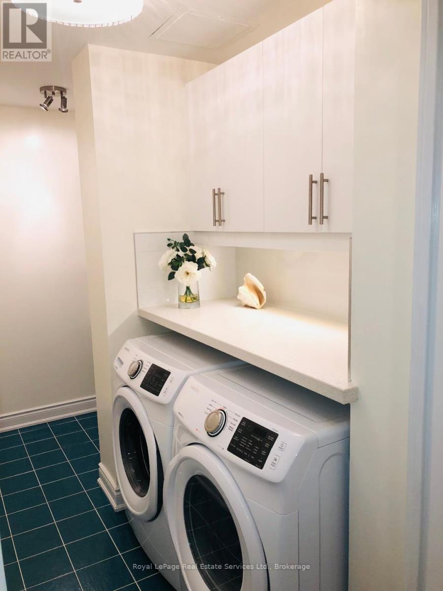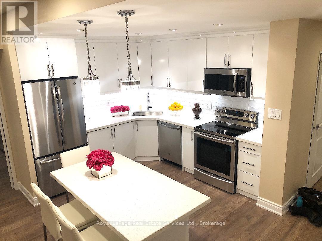 Welcome to refined, effortless living in the heart of prestigious Bronte - just steps from Lake Ontario, waterfront trails, boutique shops, restaurants, parks, and top-rated schools.This fully renovated executive condo offers approximately 1,300 square feet of elegant, open-concept space, designed for both comfort and style.From the moment you walk in, you're greeted by stunning views of lush greenery and manicured grounds, filling the oversized living and dining area with natural light.The custom designer kitchen features premium finishes, thoughtful storage, and a layout that's perfect for everyday living or entertaining.The spacious primary suite includes beautifully built-in cabinetry, while the second bedroom offers flexibility for guests, a home office, or family. You'll also love the rare, oversized laundry room with extensive custom storage.The spa-inspired main bathroom brings a true sense of luxury, and custom velvet drapery throughout adds warmth and sophistication.Located on the main floor, this unit offers exceptional convenience - no stairs, no elevator - making it ideal for executive couples, downsizers, or anyone seeking easy, turnkey living.All within a quiet, impeccably managed building in one of the most desirable lakeside communities.This is a rare opportunity to own a fully renovated, move-in-ready home in an unbeatable location.To book your private showing, contact Robert Wodz at 905-334-8040 (id:64974)